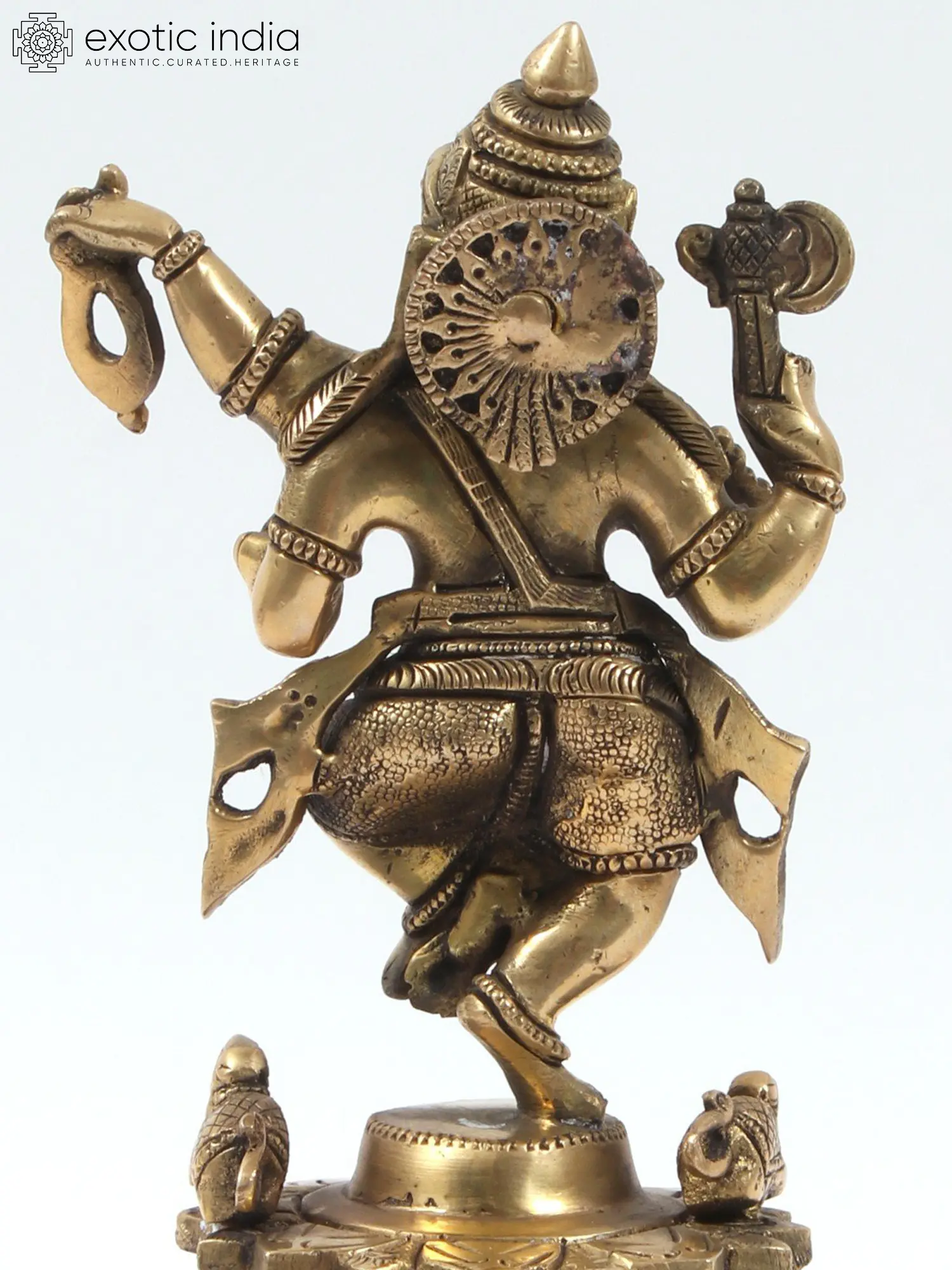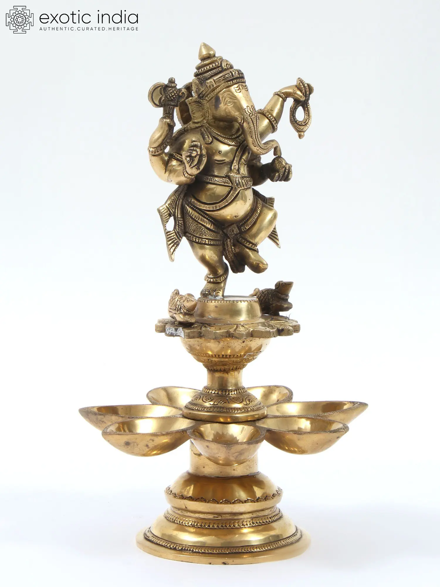 Brass lamps are utilized in Hindu tradition to spread warmth that purifies the aura of an area and rid it of negative energy. This lamp portraying the dancing Ganesha performing "The Dance of Destruction" represents the natural truth that the end is a new beginning. The lamp consists of an upper portion of dancing Ganesha along with the middle portion of a stand on which the motif stands along with his favorite transport Mushaka. The lower portion consists of seven wicks. The image of Ganesha dancing joyfully with one of his hands holding the axe, and his other hand holding a noose signifies his ability to capture and destroy the difficulties. It is a masterpiece that when lit, will throw the holy light on the beautifully dancing image of Ganesha and that will eventually purify the space of all evil energy.