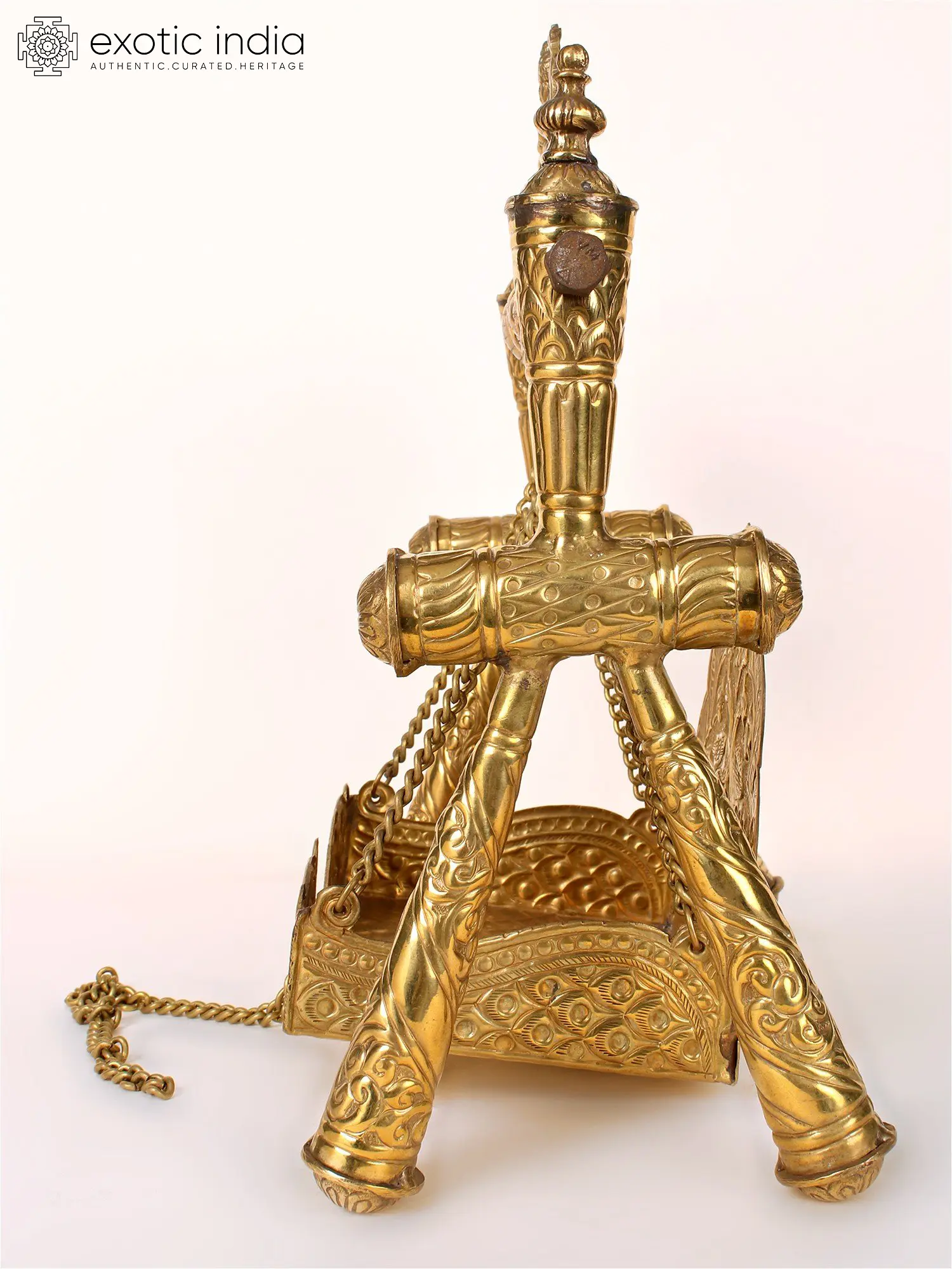This beautiful brass throne is called Krishna Sighasan and is designed as a swing. The upper portion is decorated with a sacred image of Bal Krishna or child Krishna playing with peacocks. This swing provides a secure and elegant platform for devotees to place their favorite deities, enhancing the ambiance of religious rituals and home altars. The swing adds an element of beauty and devotion to sacred spaces, creating a serene atmosphere for spiritual contemplation and connecting worshippers with their chosen deities meaningfully.