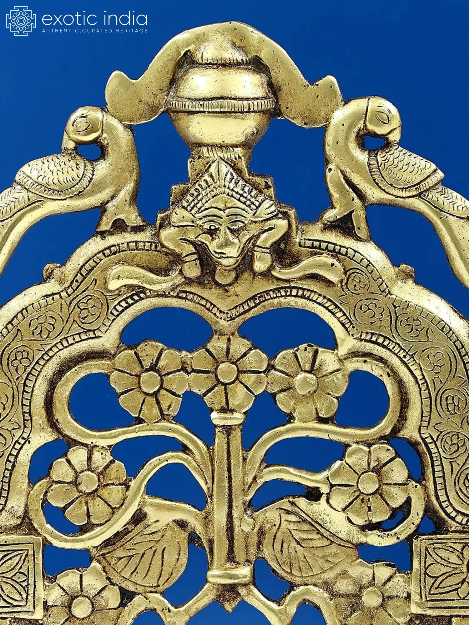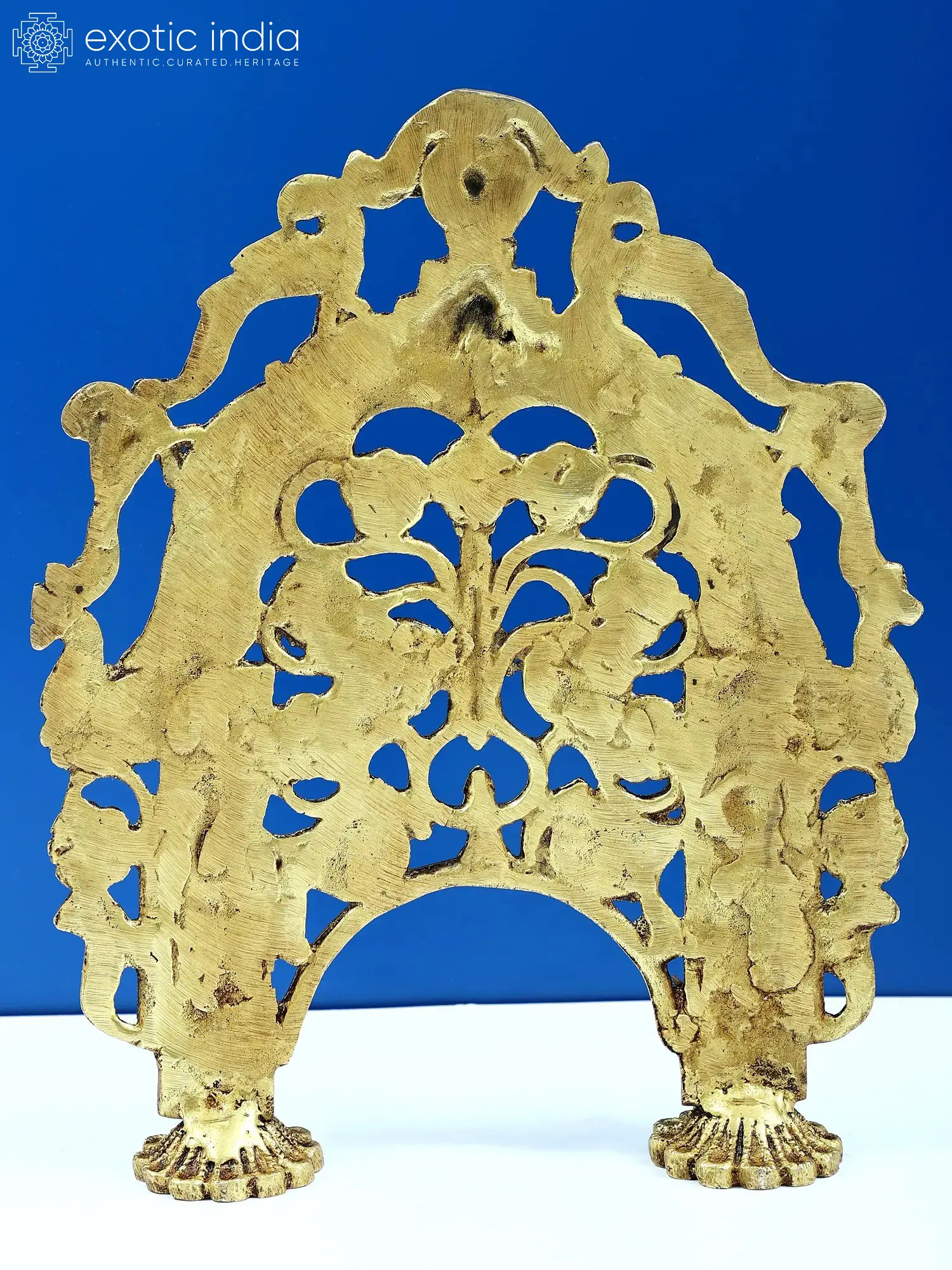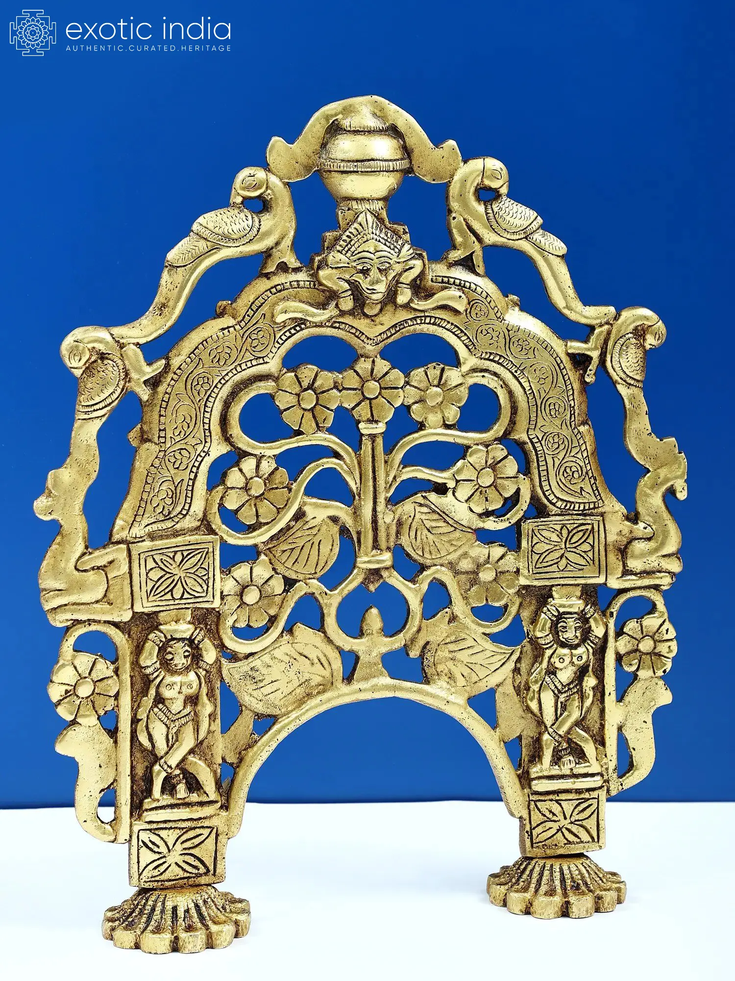 The intricate floral motifs adorning this Prabhavali speak of nature's bounty and the cyclical nature of life, a recurring theme in many spiritual traditions. The delicate rendering of leaves and blossoms suggests prosperity and growth. Perched at the apex and flanking the sides are charming depictions of peacocks, the national bird of India, revered for its beauty and often associated with royalty, divinity, and immortality. In Hindu mythology, the peacock is sometimes seen as the mount of Lord Kartikeya, the god of war, and its feathers are believed to ward off evil. The central face at the apex, often interpreted as a benevolent 'Kirtimukha' (face of glory), is a powerful symbol of auspiciousness and protection, said to devour all negativity and ward off evil spirits. The figures on the lower columns, possibly representing celestial beings or divine attendants, add a dynamic and sacred narrative to the overall composition. Each element is brought to life through the skilled hands of artisans, who transform raw brass into this work of art, imbued with the spirit of ancient traditions.