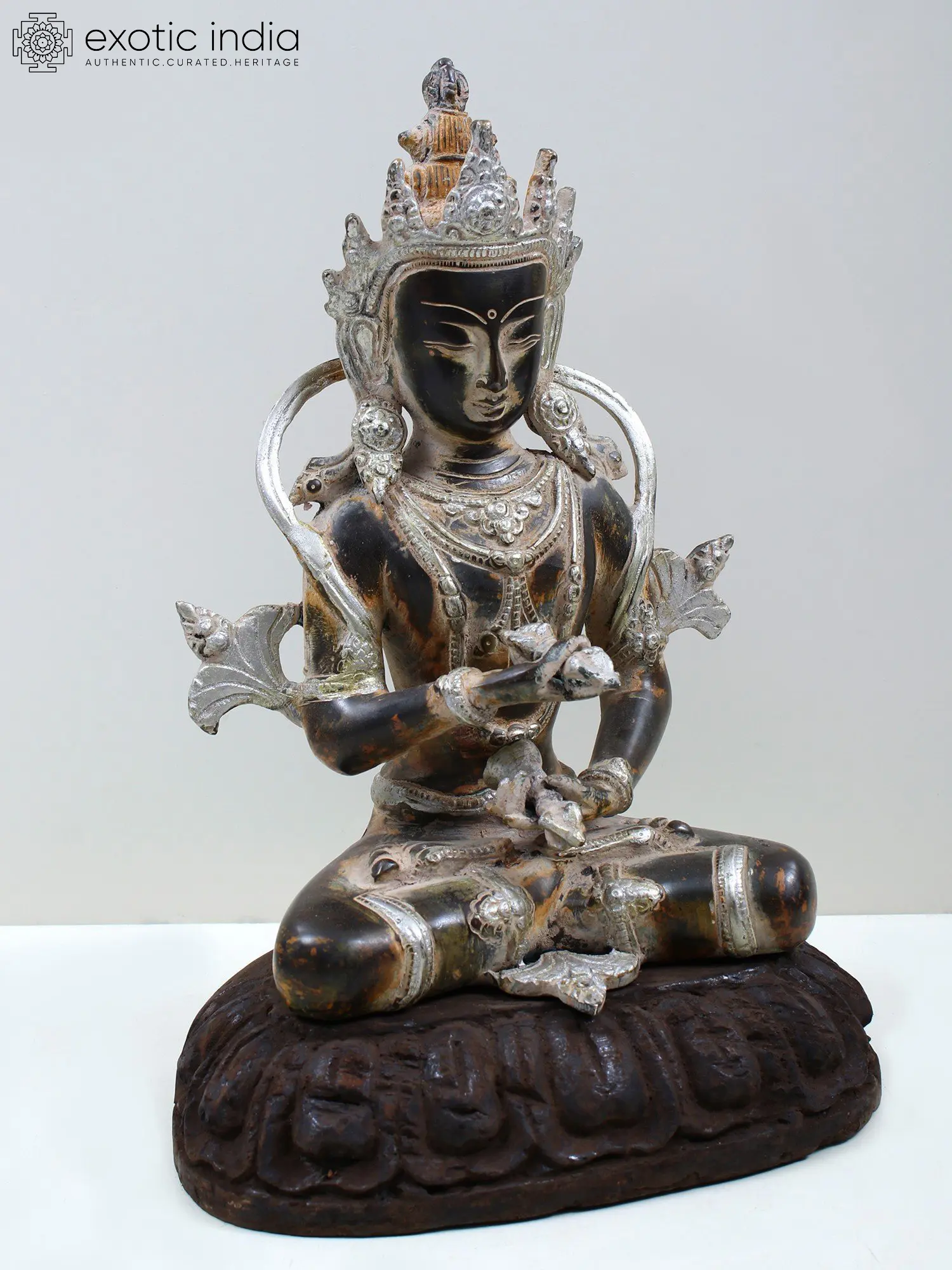 Gaze upon this exquisite brass representation of Vajrasattva, a central figure in Tibetan Buddhist tantric practices. Seated in a regal posture upon a beautifully carved wooden pedestal, this deity embodies the ultimate purification, the luminous essence of awakened consciousness. Vajrasattva is often invoked as the source of all Buddhist teachings, the primordial Buddha who presides over the Vajra family, symbolizing immutability, indestructibility, and wisdom. His serene countenance, with eyes gently closed, suggests deep meditation and profound inner peace. The intricate details of his crown and adornments speak to his celestial nature and his role as a protector of the Dharma. The delicate silver work that highlights his features and jewelry adds a touch of ethereal brilliance, contrasting with the rich, dark patina of the brass. In his hands, he holds the vajra, the diamond scepter, and the ghanta, the bell, universal symbols of skillful means and wisdom, respectively, locked in a gesture of union. The vajra represents the power to cut through ignorance and delusion, while the bell symbolizes the harmonious proclamation of the Dharma.