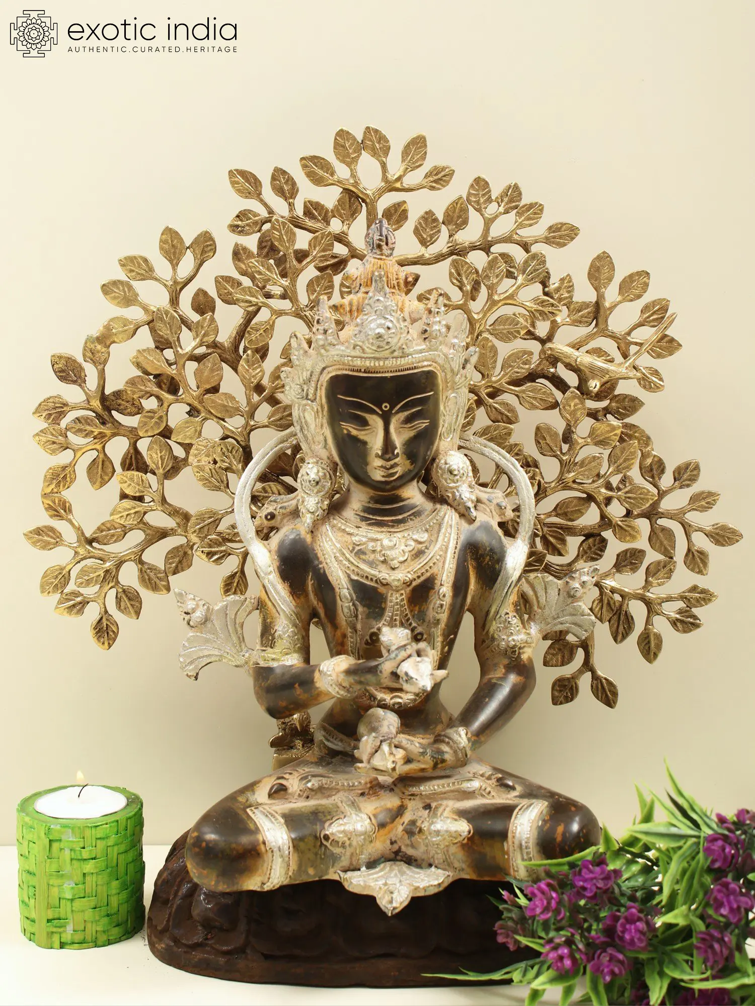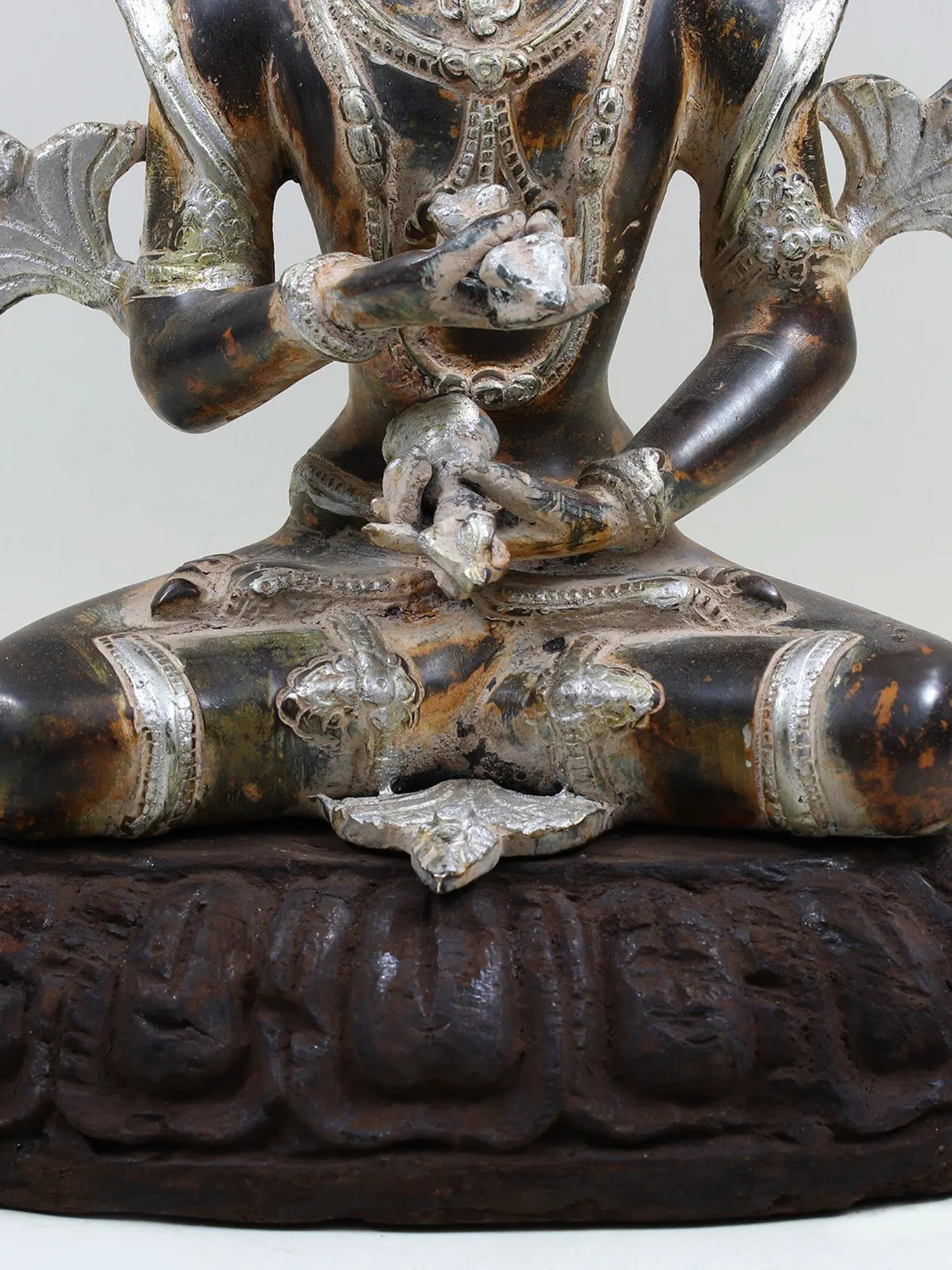 This remarkable statue is a testament to the skill and dedication of traditional artisans. Crafted from high-quality brass, its form is meticulously sculpted, capturing the divine essence of Vajrasattva with remarkable precision. The application of silver inlay on the crown, ornaments, and certain features adds a dimension of opulence and spiritual luminescence, reflecting the divine light associated with awakened beings. The entire figure rests upon a solid wooden pedestal, carved with traditional motifs that echo the sacred geometry and spiritual symbolism prevalent in Tibetan art. This harmonious pairing of materials – the enduring strength of brass and the grounded warmth of wood – creates a piece that is both visually captivating and spiritually resonant. It serves as a powerful reminder of the interconnectedness of all things and the potential for purity and enlightenment that resides within each being.