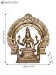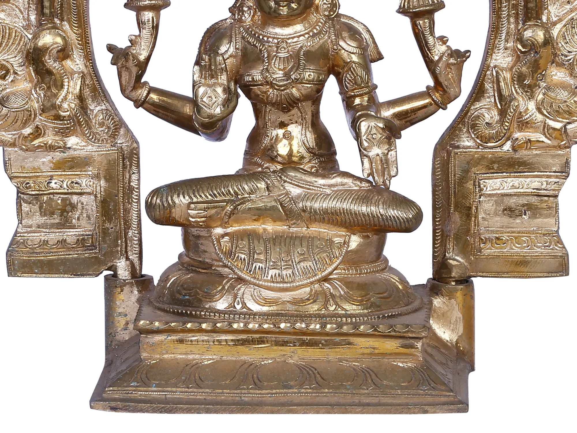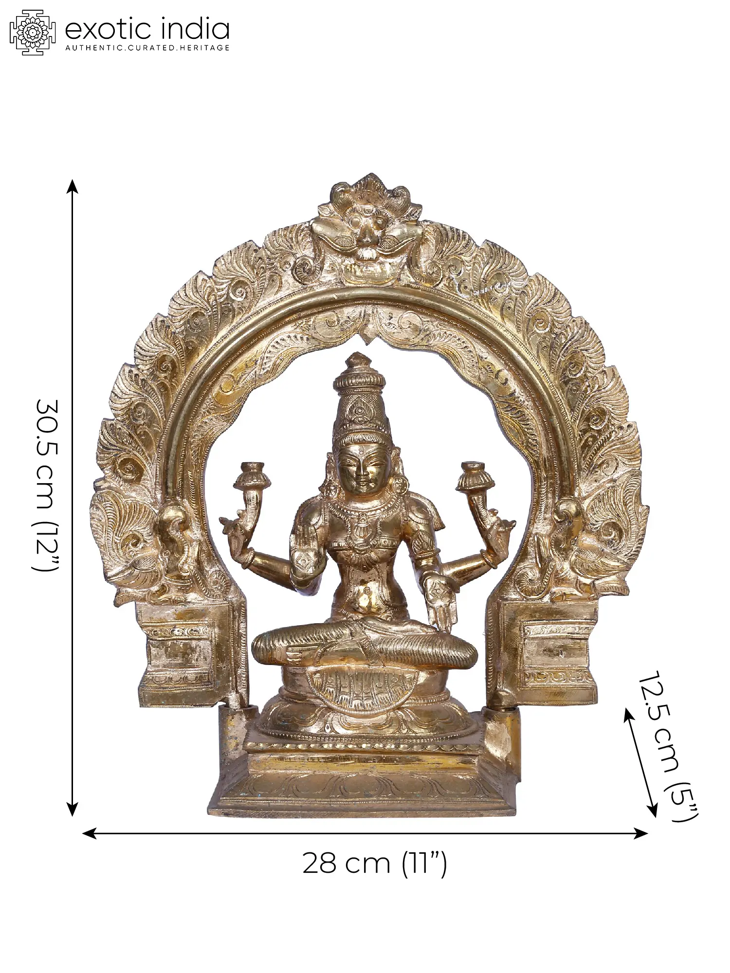 Enthroned upon the majestic “Kirtimukha (the Face of Glory)”, Goddess Lakshmi, “also known as Harivallabhi (the consort of Hari)”, graces existence in divine serenity. Seated in “Padmasana”, her ethereal form exudes opulence. Upper hands cradle a lotus, symbol of purity and enlightenment. In “Abhaya Mudra”, her right hand bestows fearlessness, while the left, in “Varada Mudra”, showers benevolence. Adorned in regal splendour, a royal crown rests upon cascading waves of hair. A symphony of gold and jewels accentuates her divine allure. Her scarlet attire, threaded with golden strands, speaks of prosperity. Crafted in Panchaloha bronze from “Swamimalai” using the ancient “Madhuchista Vidhana (Lost-Wax) technique”, this celestial masterpiece embodies the eternal dance of fortune and wealth, a visual hymn to abundance that resonates through the cosmos.