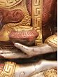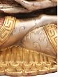 The Buddha's right hand is raised in the Vitark Mudra, a gesture universally recognized as one of teaching, argumentation, and the transmission of knowledge. This mudra symbolizes the Buddha's pivotal role as the Awakened One, who shared his profound insights and wisdom with the world. It represents the continuous flow of spiritual discourse, encouraging debate and understanding. With the thumb and index finger touching, forming a circle, it signifies the perfection of wisdom and the unity of method and wisdom. This gesture invites contemplation and offers a visual representation of the path to enlightenment, as expounded in the ancient teachings.