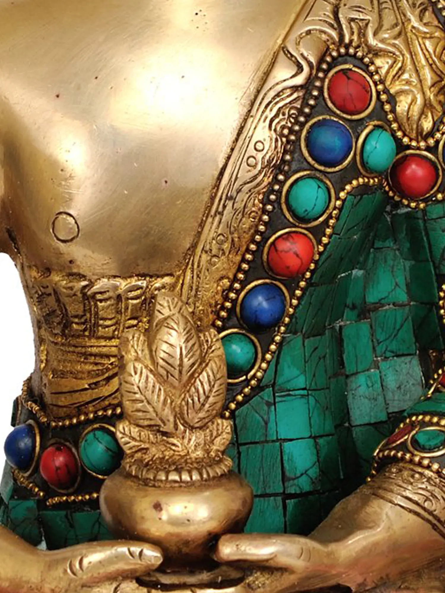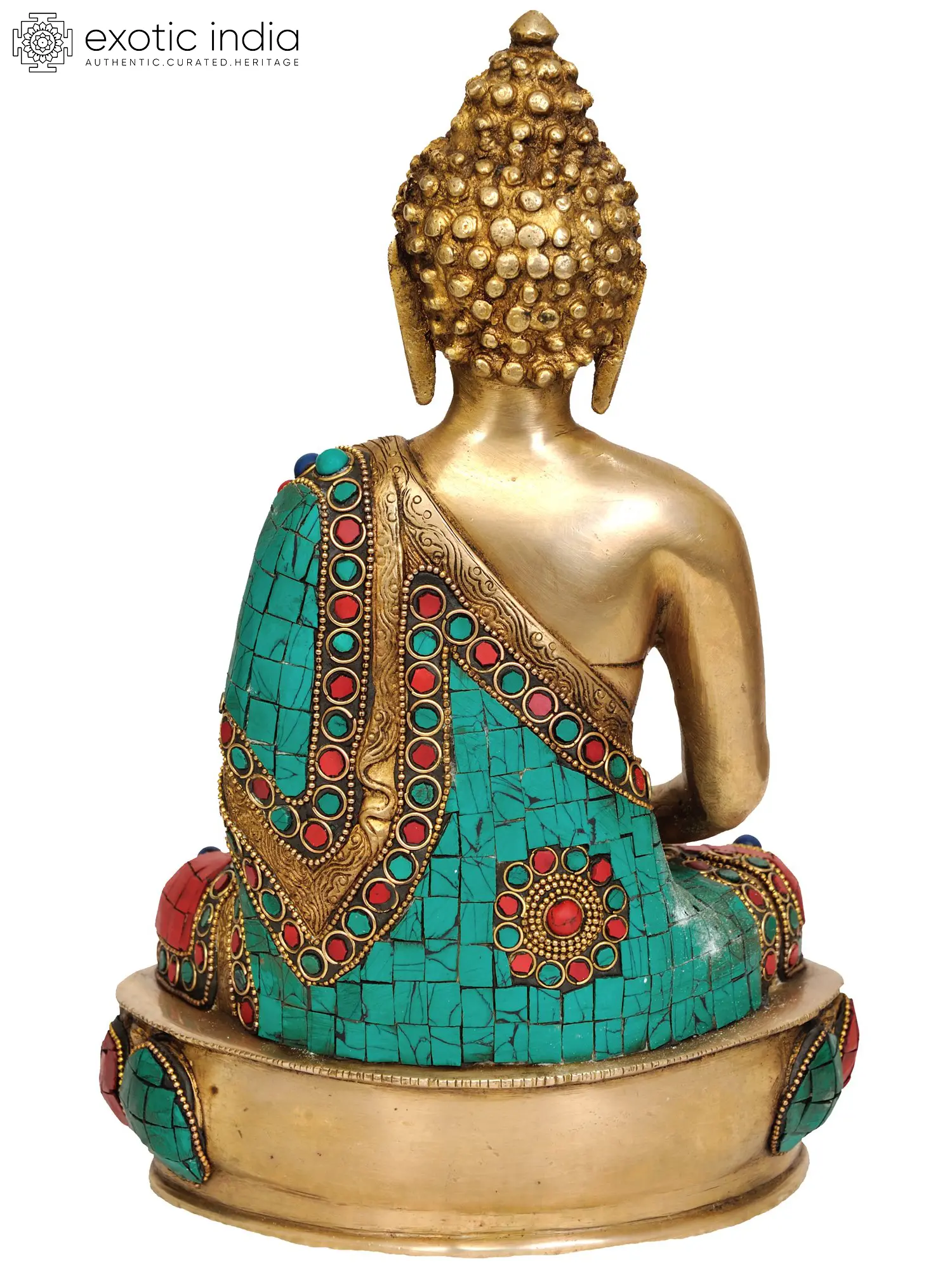 This exquisite Buddha statue is further elevated by its vibrant inlay work, a testament to the rich artisanal traditions of India. The Buddha's robes are adorned with a captivating mosaic of turquoise and coral hues, interspersed with accents of deep blue. Turquoise, a stone associated with protection and healing, and coral, symbolizing vitality and good fortune, are thoughtfully arranged to create a dazzling tapestry that enhances the visual appeal and spiritual resonance of the sculpture. Each tessera, precisely cut and embedded, speaks to the skill and dedication of the artisan. The base, sculpted with intricate patterns and equally adorned with these precious stones, provides a stable and ornate foundation, drawing the eye upwards to the serene figure. This interplay of metallic gleam and vibrant color creates a piece that is not only a devotional object but also a breathtaking work of art, destined to be a focal point in any sacred space or collection. ––––––––––––––––––