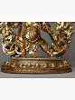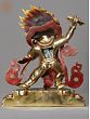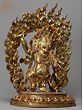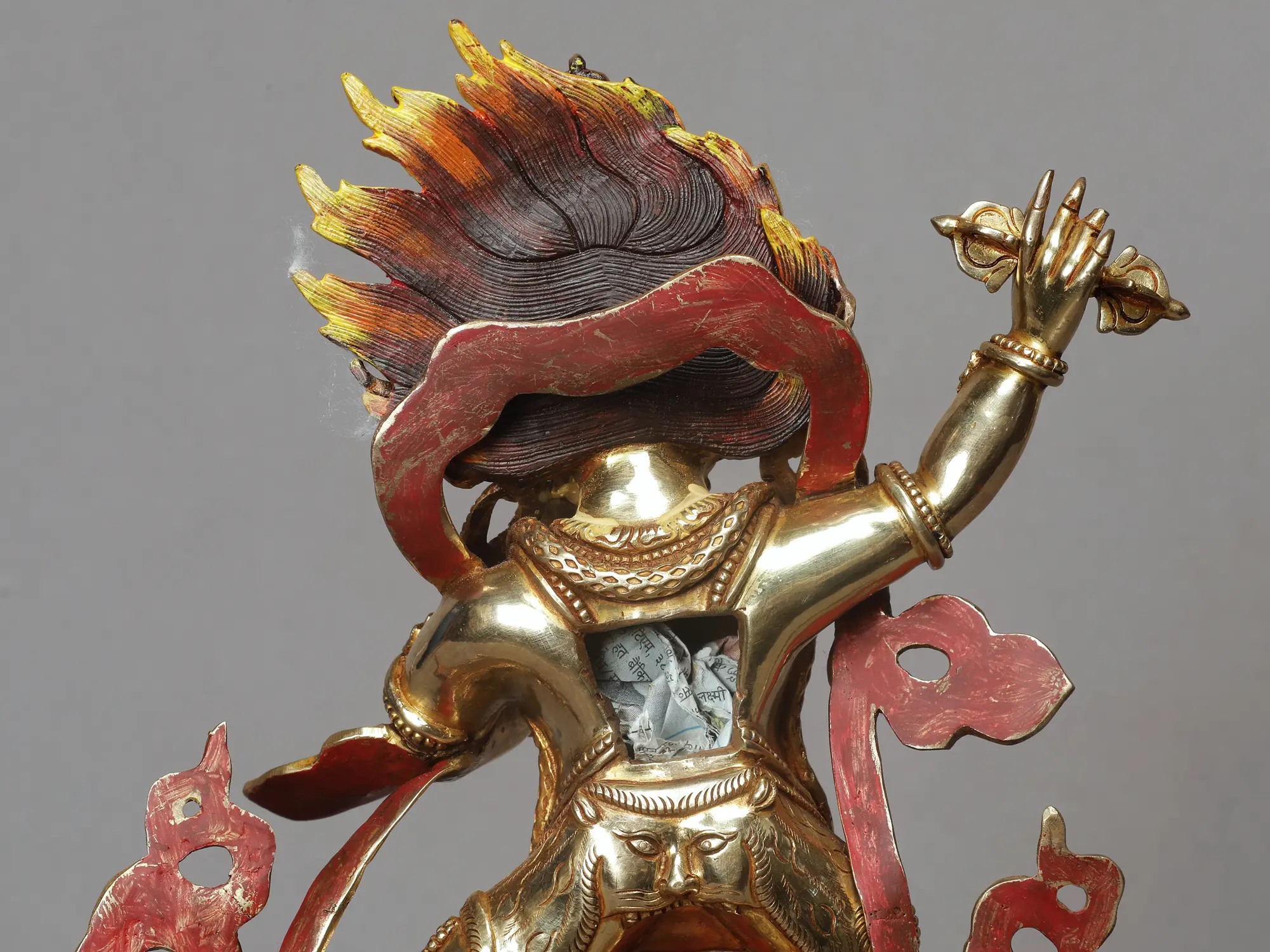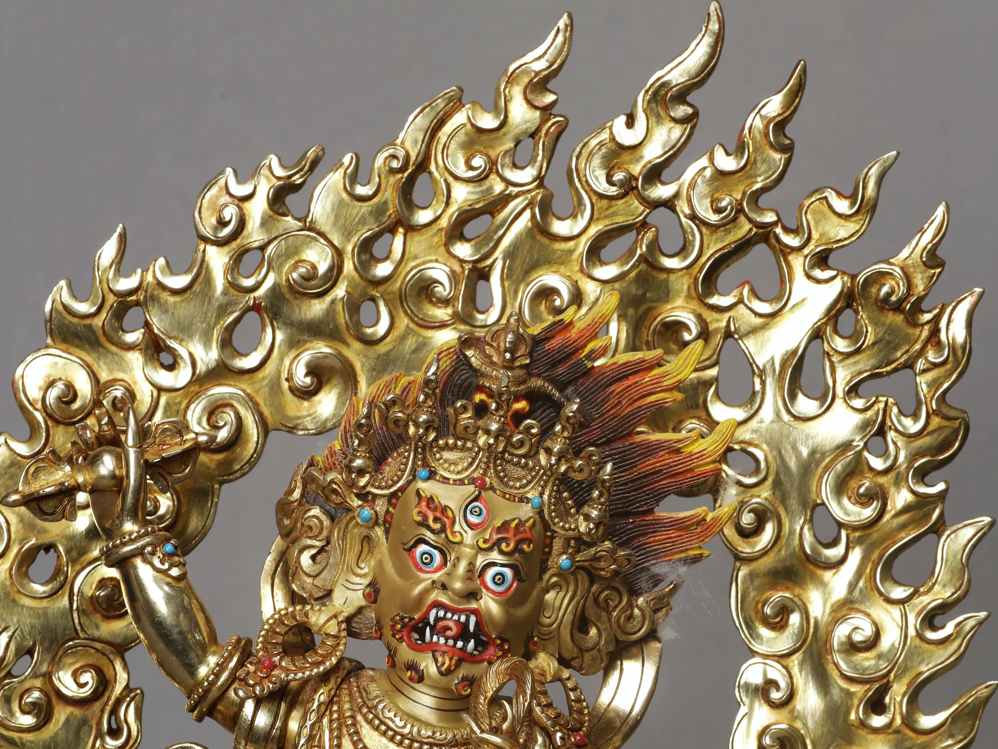 In his right hand, he wields the vajra, representing the unbreakable nature of enlightenment and the skillful means required to attain it. His left hand holds a bell, symbolizing wisdom, with its sound believed to dispel ignorance and awaken beings to the truth of enlightenment.