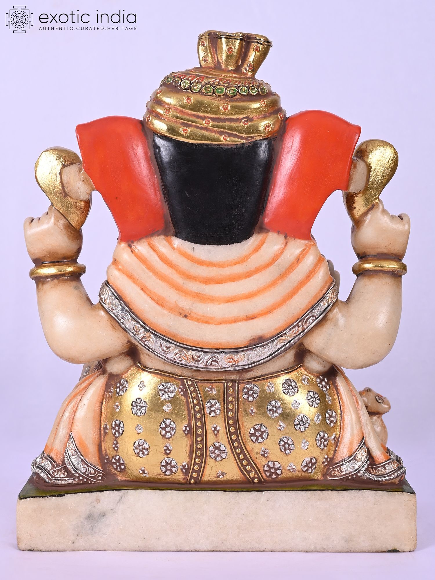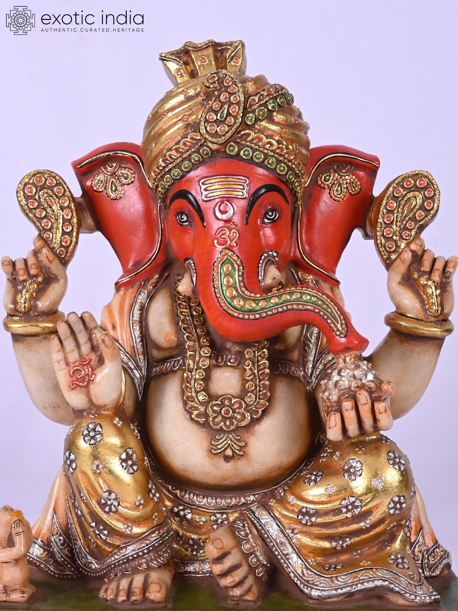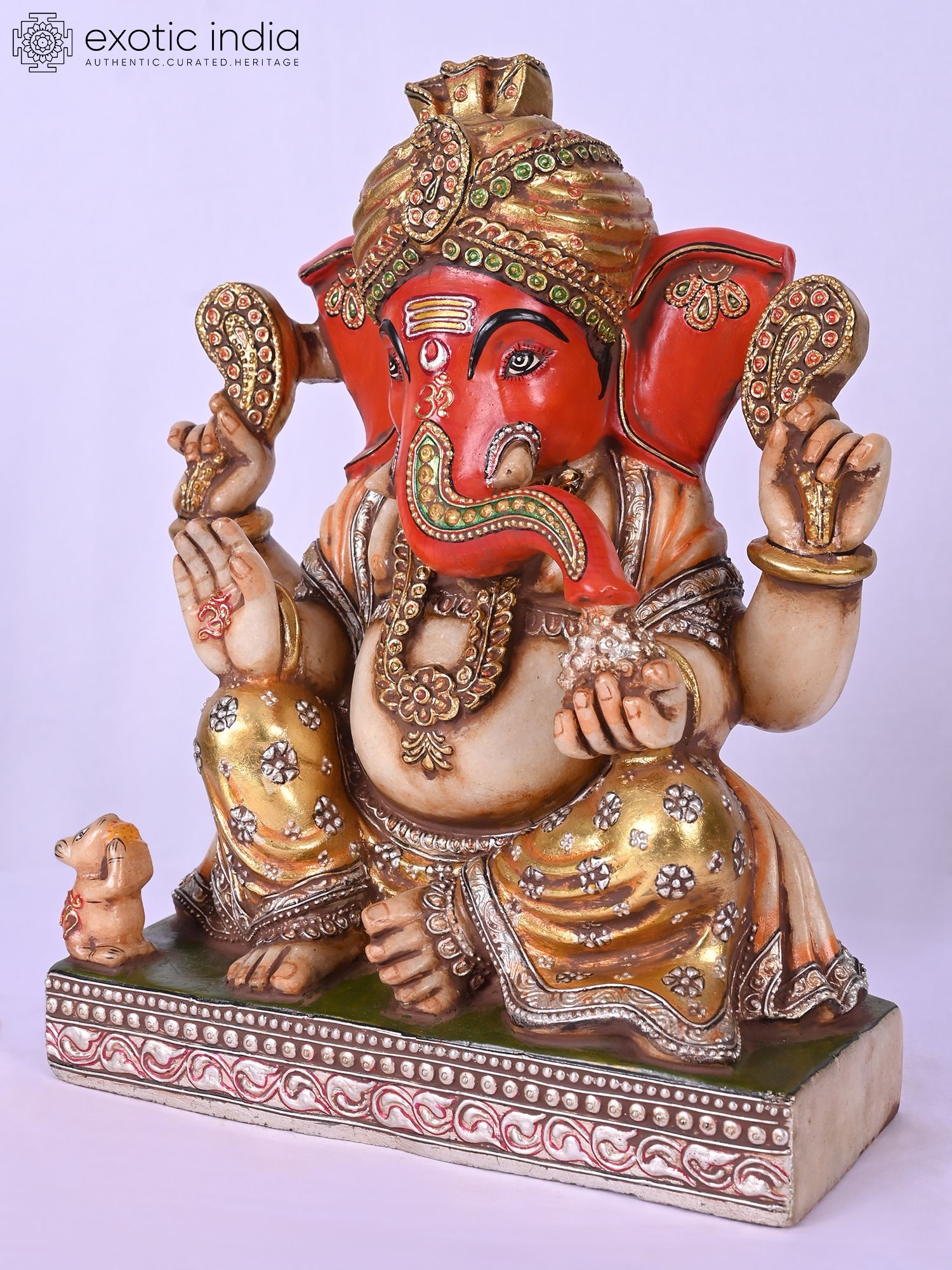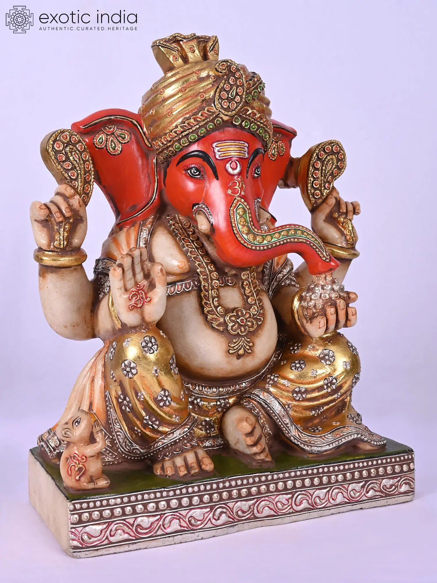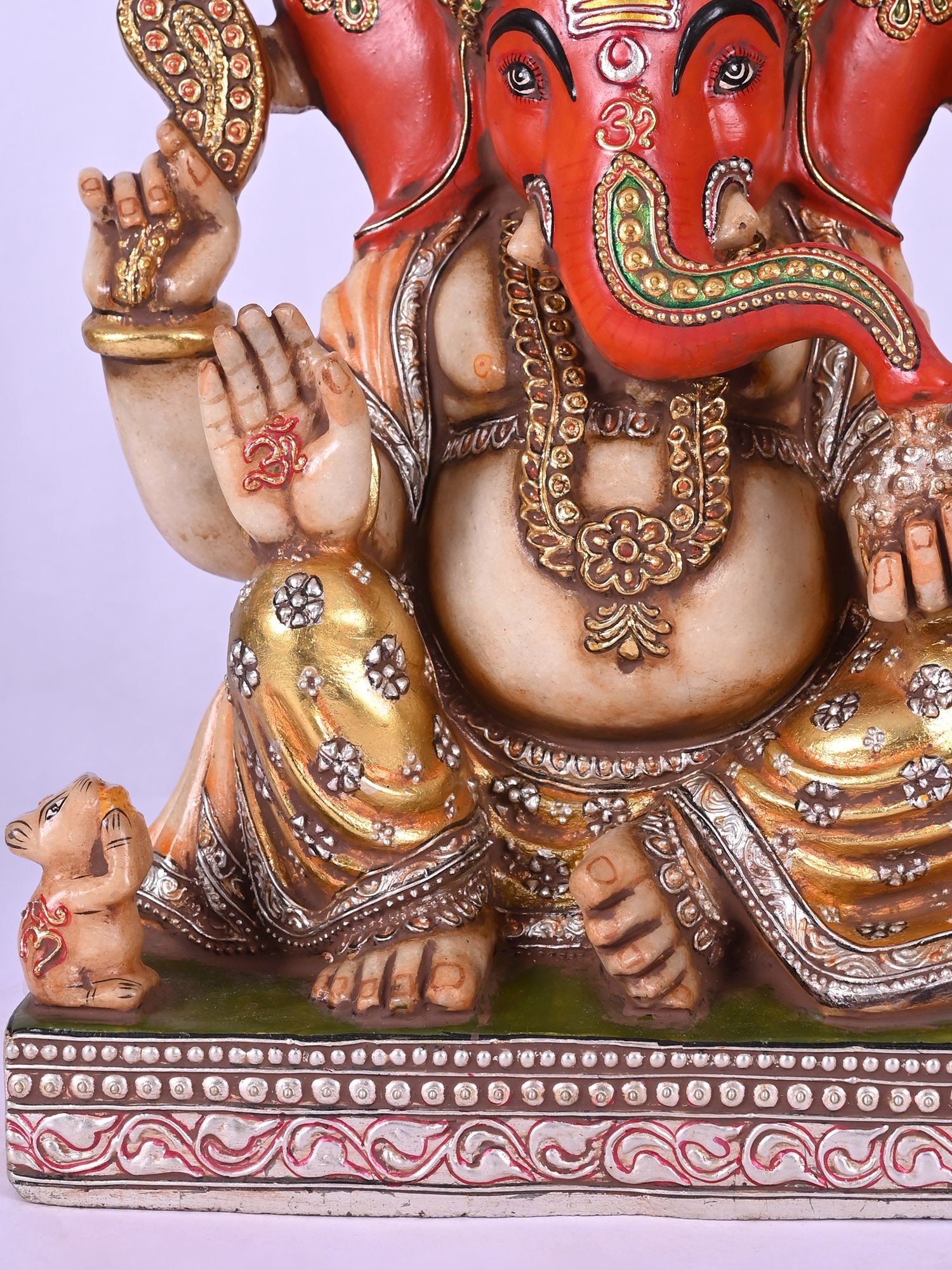 Ganesha's iconography, including the blessing hands and the presence of his vehicle, the mouse, is accurately represented.