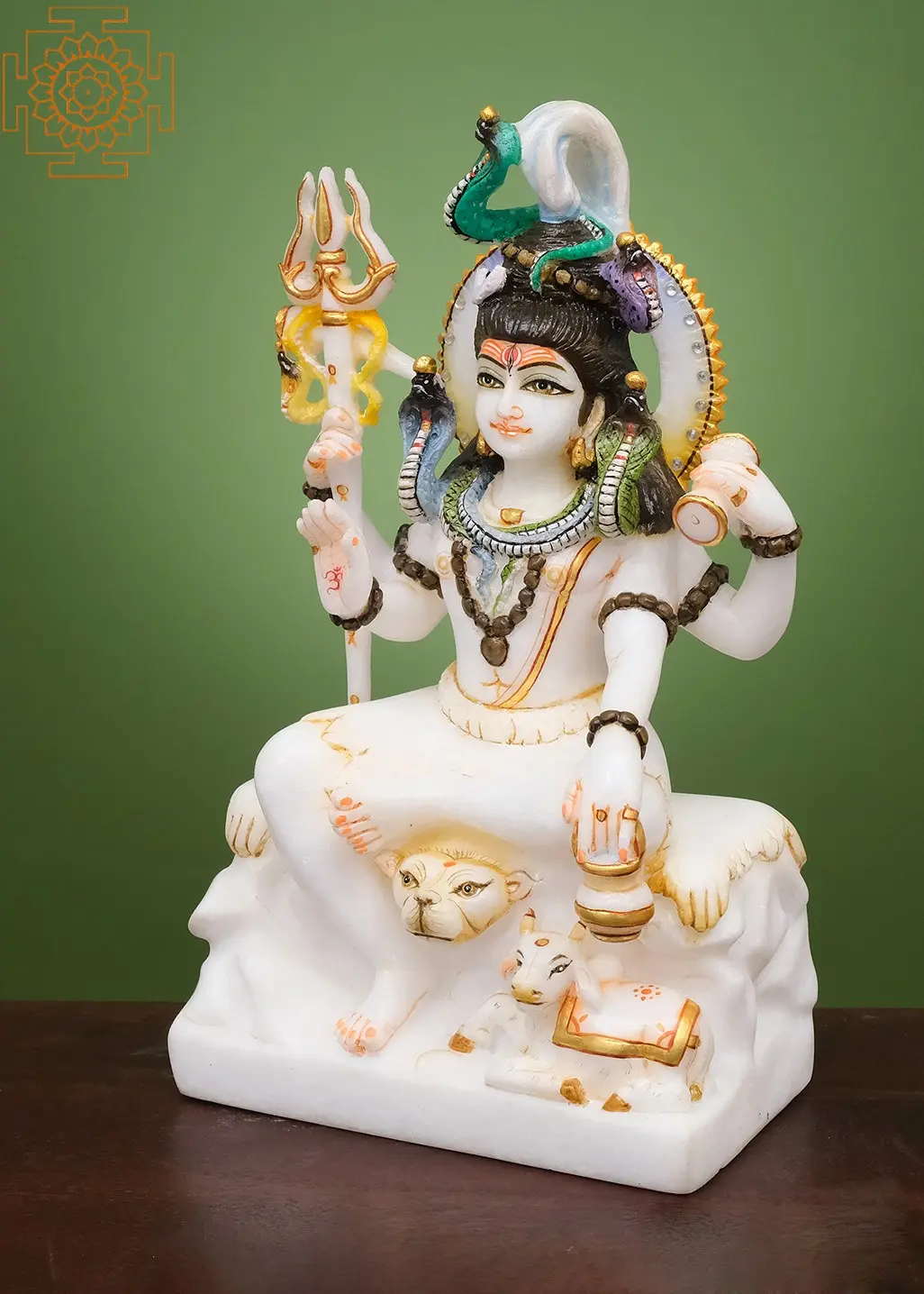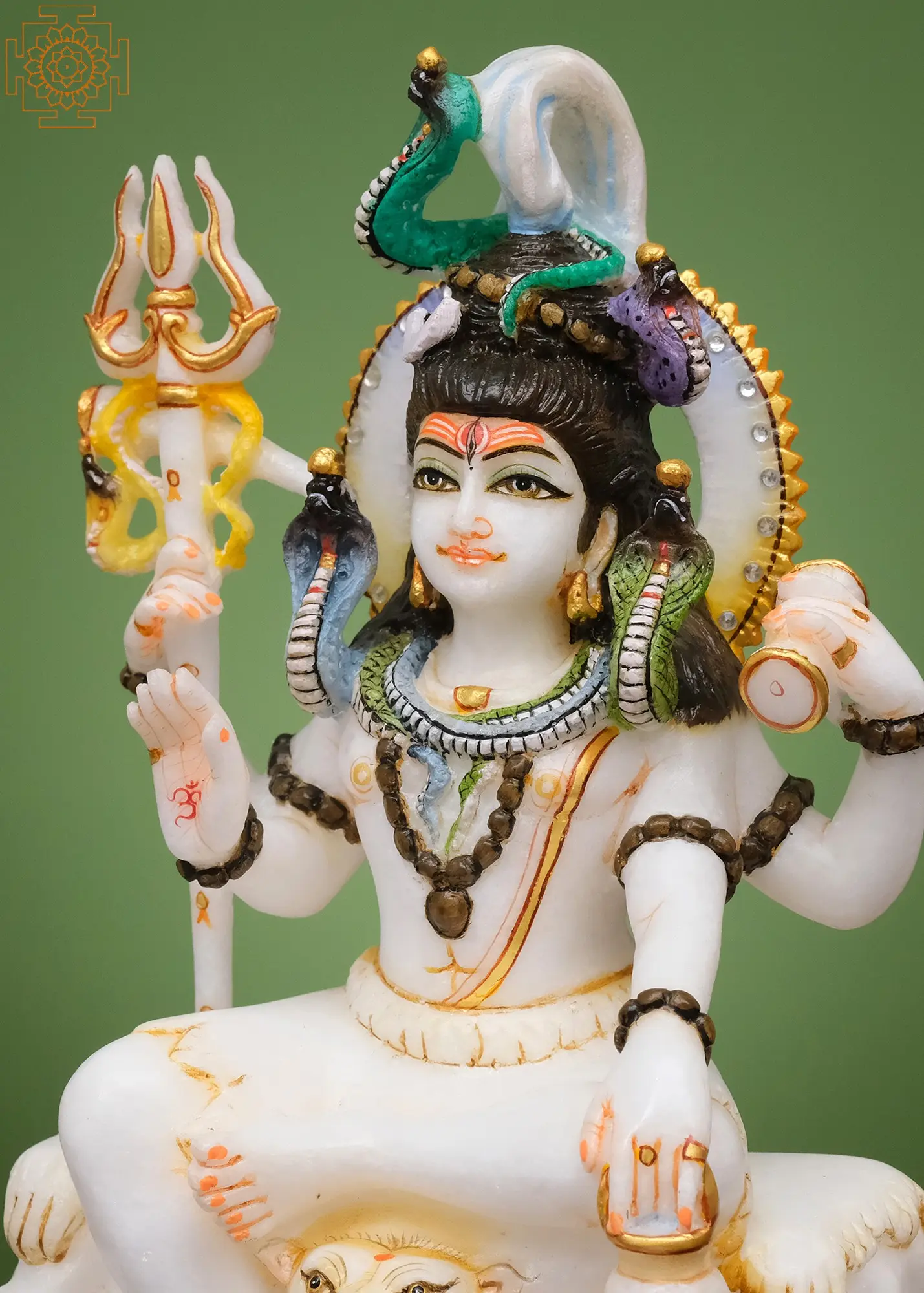 The four arms of Lord Shiva are symbolic of his multifaceted cosmic functions. In this representation, each hand carries profound meaning. One hand holds the Trishula, his iconic trident, symbolizing the three aspects of existence – creation, preservation, and destruction – and his dominion over the three gunas (qualities of nature). Another hand might be depicted in a gesture of blessing (Abhaya Mudra), offering solace and protection to his devotees, or holding a Damaru, the drum whose cosmic sound is said to have created the universe. The presence of serpents adorning his neck and matted locks is a powerful symbol. Vasuki, the king of serpents, coiled around his throat, signifies his victory over poison and his ability to consume the Halahala venom that threatened to destroy the cosmos, thus saving humanity and the universe. The snakes also represent the kundalini energy, the dormant divine power within every being.
