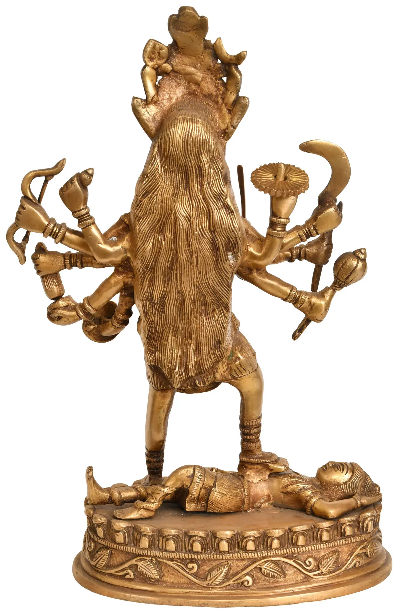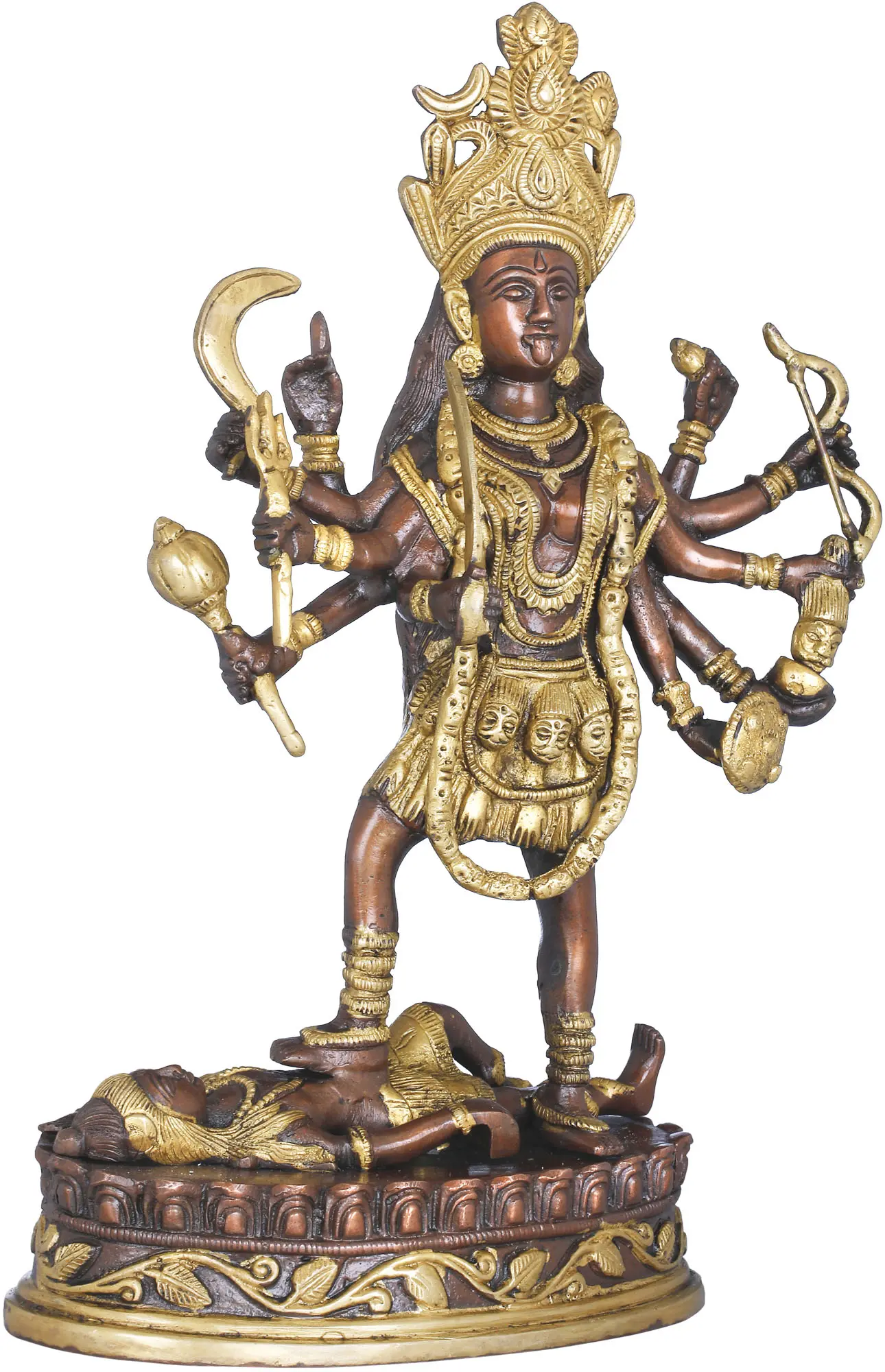 Legend has it that her intoxication with the blood of demons was quelled only when she stepped on Lord Shiva. This intricately crafted brass statue beautifully contrasts her golden jewelry with her dark complexion. Bring home the divine energy and captivating artistry of Maa Kali with this exceptional masterpiece.
