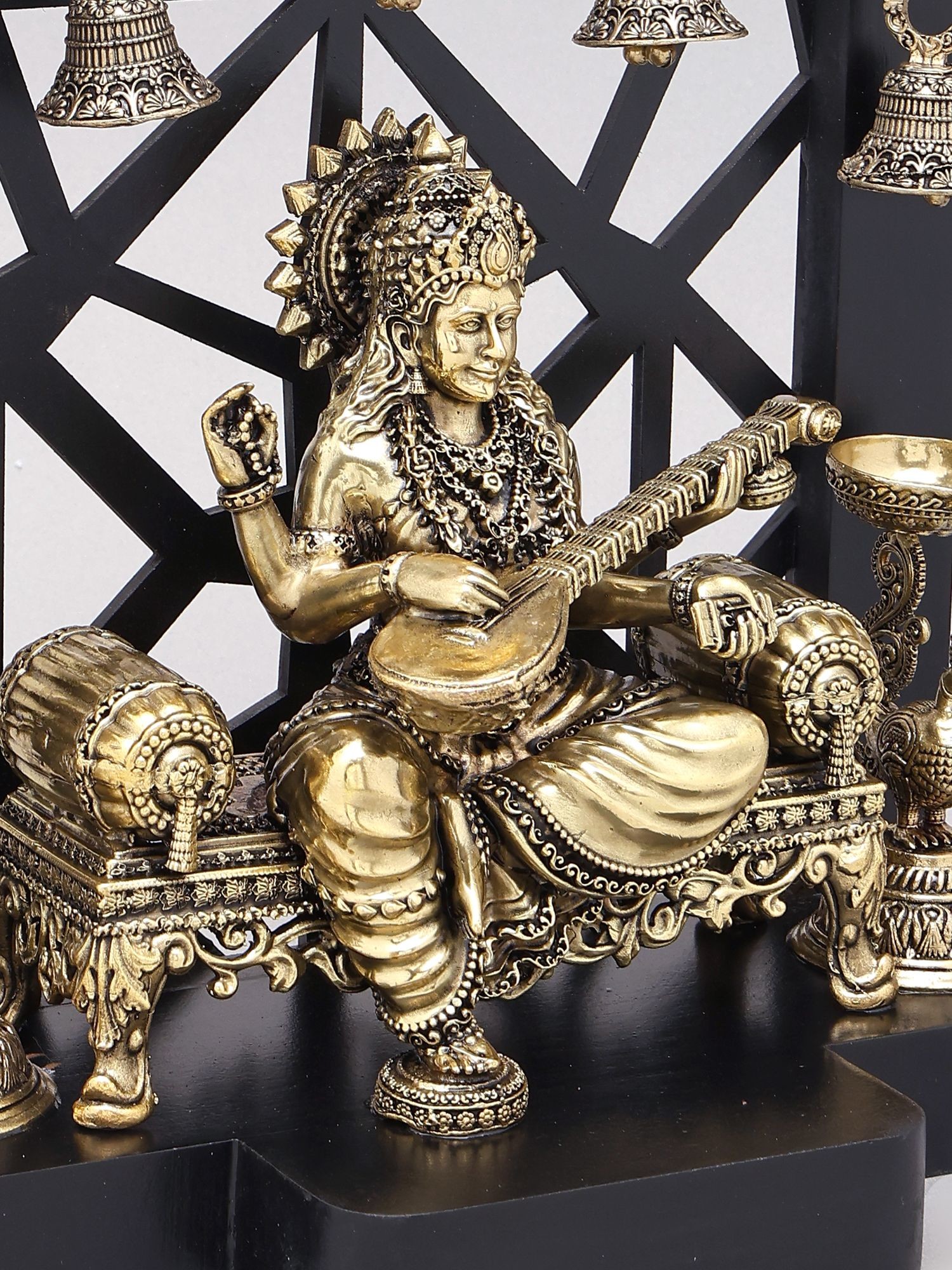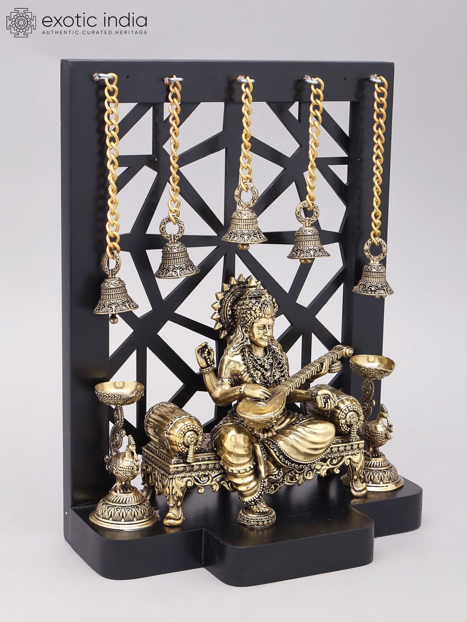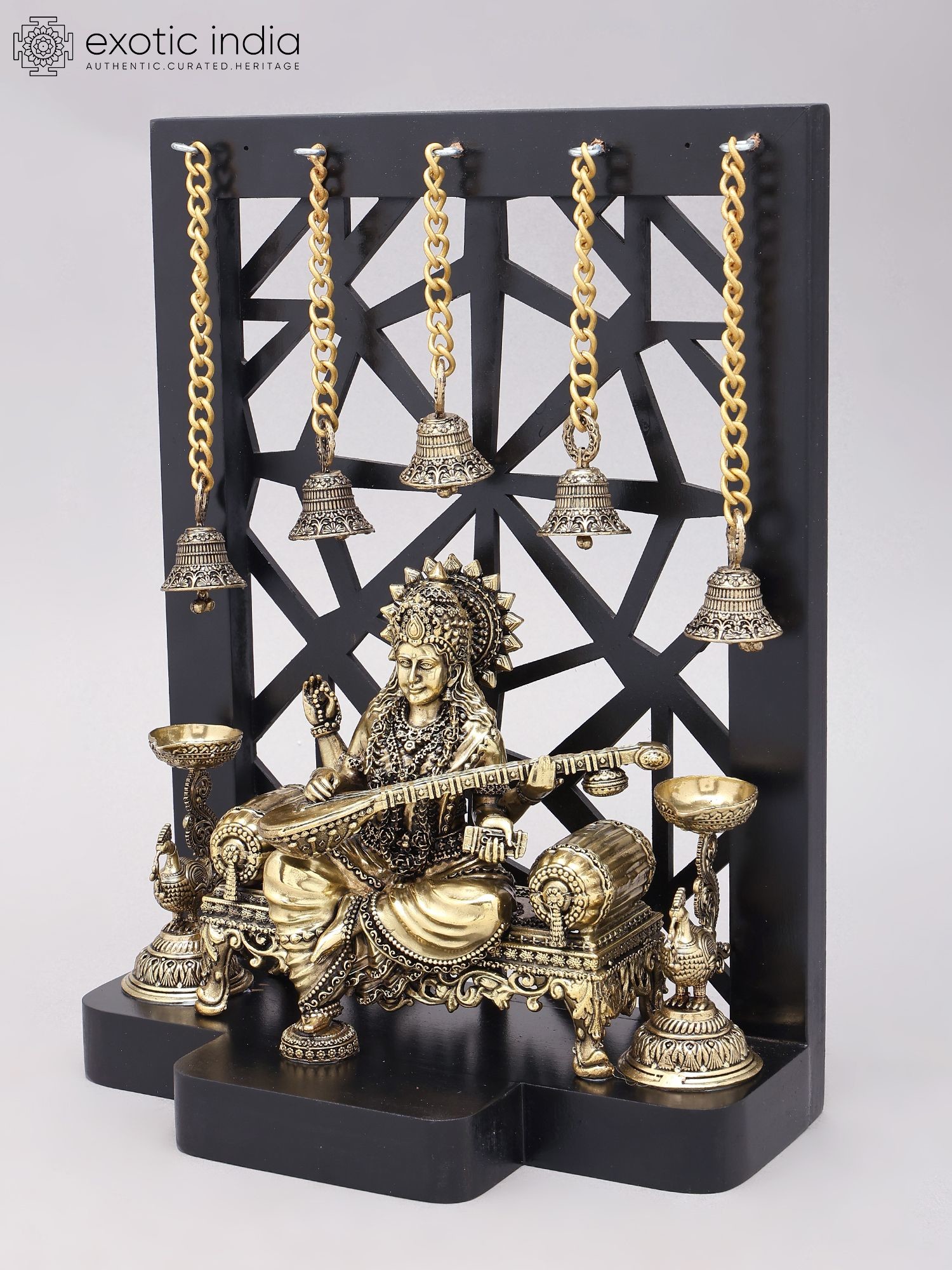 12" Superfine Goddess Saraswati with Peacock Lamps and Bells | Brass Statue with Designer Wood Frame