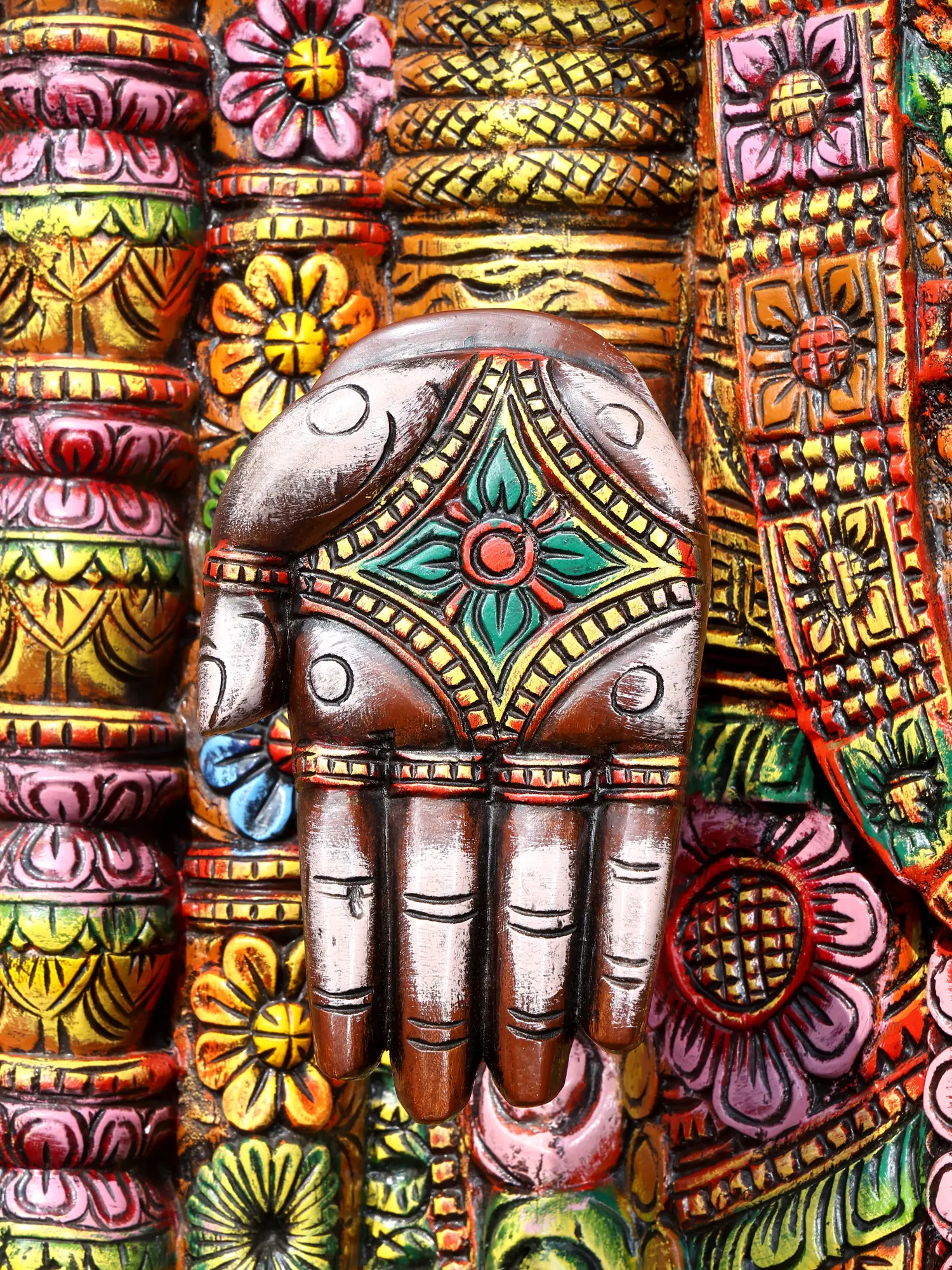 Every curve, every detail of this sculpture is brought to life by the skilled hands of artisans who have dedicated generations to the art of wood carving. Fashioned from the finest wood, selected for its durability and inherent beauty, it undergoes a meticulous process of sculpting and detailing. The vibrant, hand-applied pigments not only enhance the rich textures but also symbolize the manifold manifestations of the divine, ensuring a finish that is as enduring as it is exquisite.