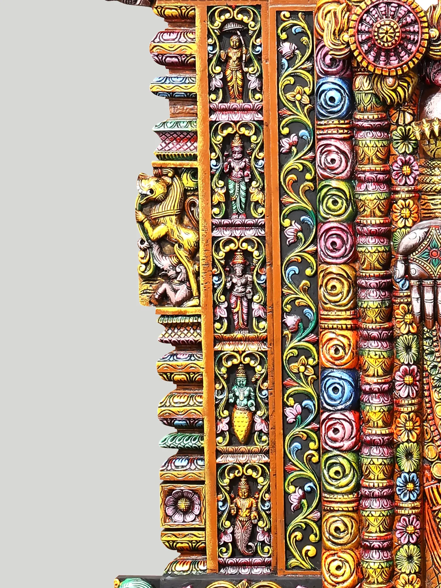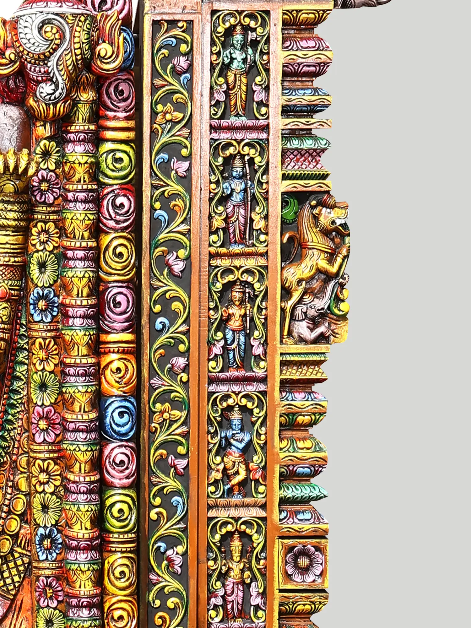 Witness a symphony of color and form, where the divine figure stands majestically within an elaborately adorned architectural arch. The intricate carvings adorning the structure tell stories through the depiction of celestial beings and auspicious motifs. Delicate floral patterns, entwined with mythical creatures and symbolic representations, create a breathtaking visual tapestry, inviting closer inspection and admiration of the sheer depth of artistry involved.
