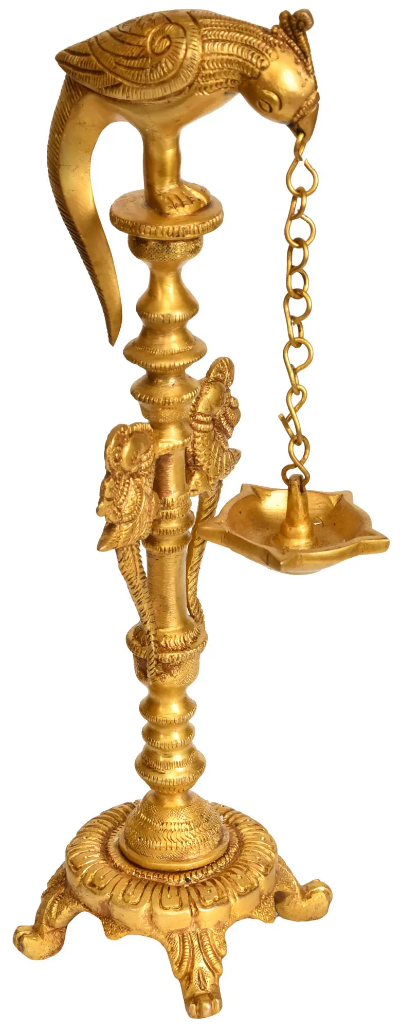 The captivating form of the parrot adorning this lamp is steeped in cultural significance. In Indian mythology, the parrot is often depicted as a messenger, a symbol of knowledge, and a companion to deities. It's believed that the parrot's ability to mimic speech signifies wisdom and the ability to convey divine messages. The very act of a parrot holding a chain, leading to a diya, evokes imagery of it carrying light and good tidings from the celestial realms to the earthly plane. This lamp, therefore, becomes a beautiful representation of divine communication and the dispelling of ignorance through the illumination of wisdom. The intricate detailing of the brass itself, from the textured feathers of the parrot to the ornate base, speaks volumes of the artisan's dedication and the timeless craftsmanship passed down through generations.