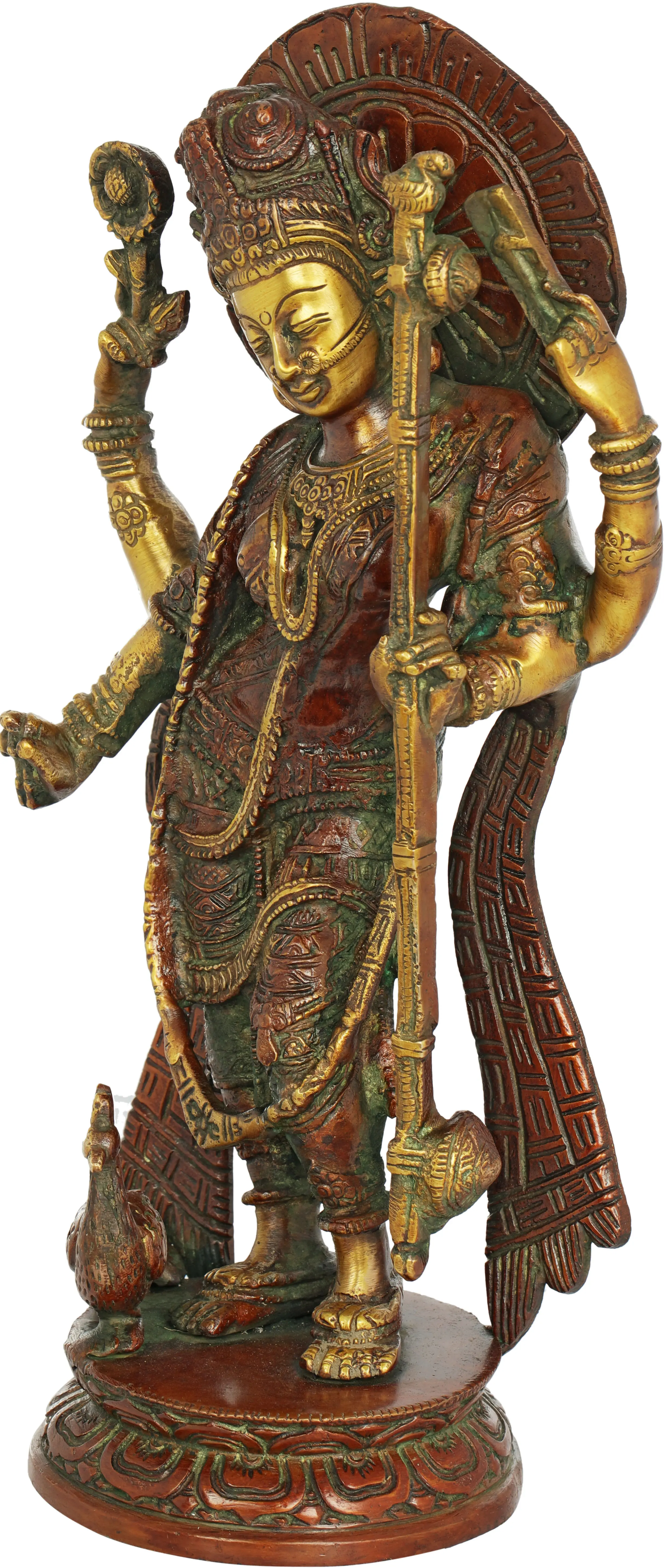 This exquisite brass statue depicts Goddess Saraswati, the embodiment of knowledge, music, arts, speech, wisdom, and learning in Hindu tradition. Crafted with remarkable detail and a rich patina, this handmade masterpiece is a testament to the skilled artistry that originates from India. The goddess is shown in a graceful posture, her multiple arms suggesting her boundless power and multifaceted nature. She is adorned with intricate jewelry, flowing garments, and a serene expression that conveys tranquility and profound wisdom. The delicate rendering of her features, from the serene smile to the gentle gaze, captures the essence of divine grace. In Hindu mythology, Saraswati is revered as the daughter of Brahma, the creator. She is often depicted holding a *veena*, a stringed musical instrument, symbolizing her command over music and the arts. She also carries a book, representing knowledge and the pursuit of learning, and a mala (rosary) for spiritual contemplation. Her mount is the swan, a creature known for its purity and ability to discern between milk and water, symbolizing the discernment required for true wisdom. This statue beautifully incorporates these symbolic elements, allowing for a deep connection to the rich cultural and spiritual heritage she represents. The inclusion of a peacock, her avian companion often associated with beauty and pride, further enhances the visual narrative of this divine representation.