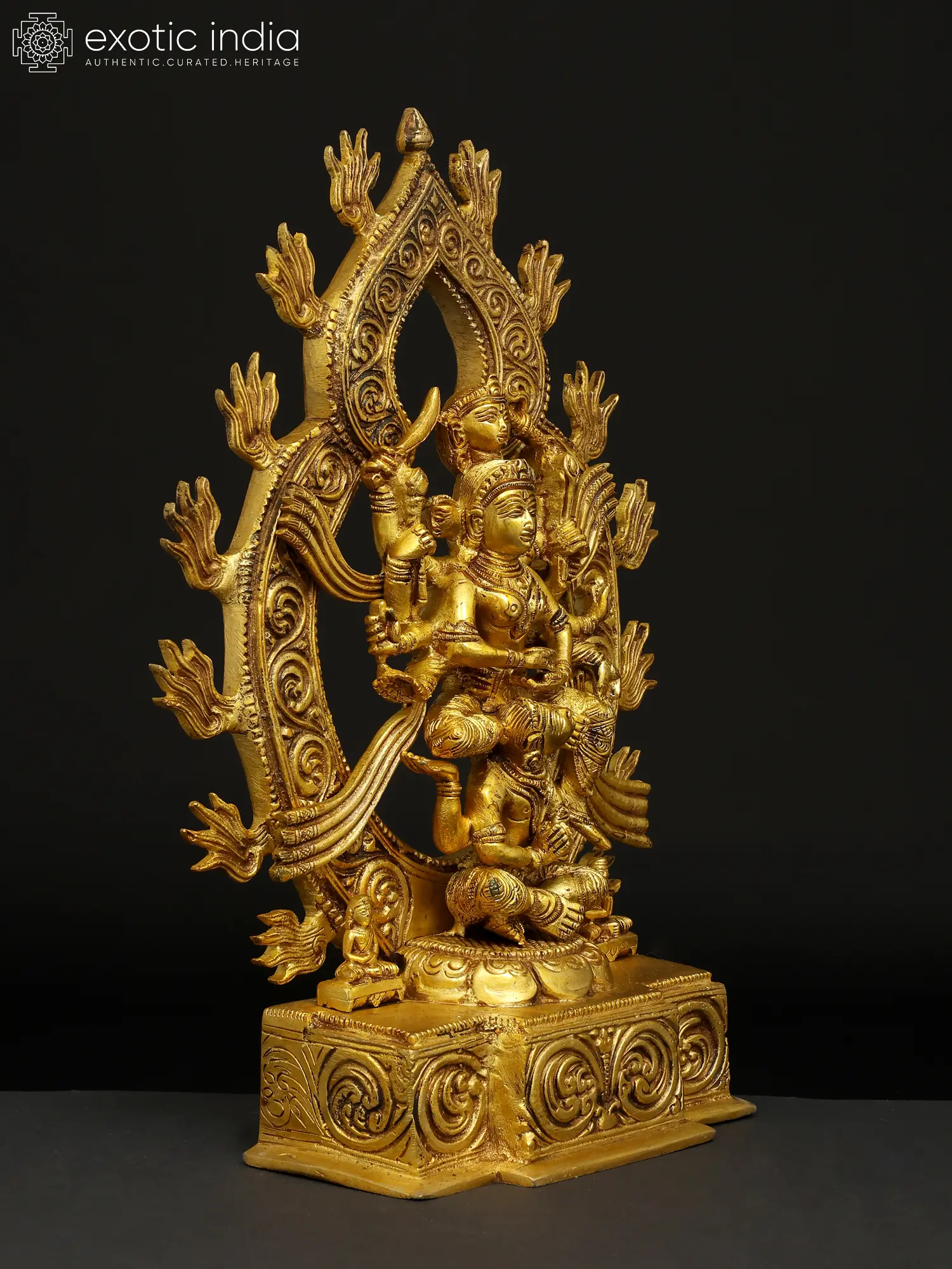 In this imposing brass sculpture from the Exotic India collection, the Goddess towers over Her husband, the ascetic Lord Shiva, who in turn is seated on a lustrous lotus.