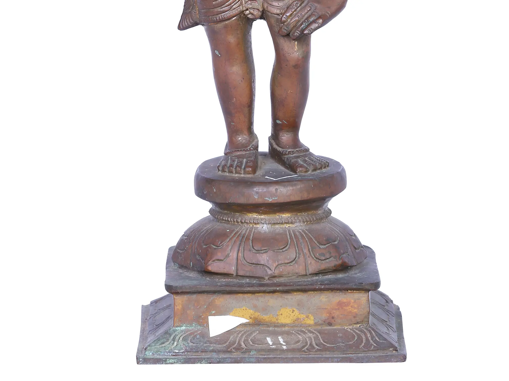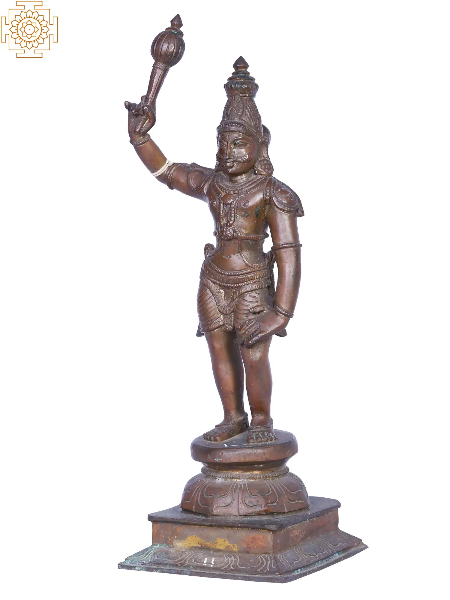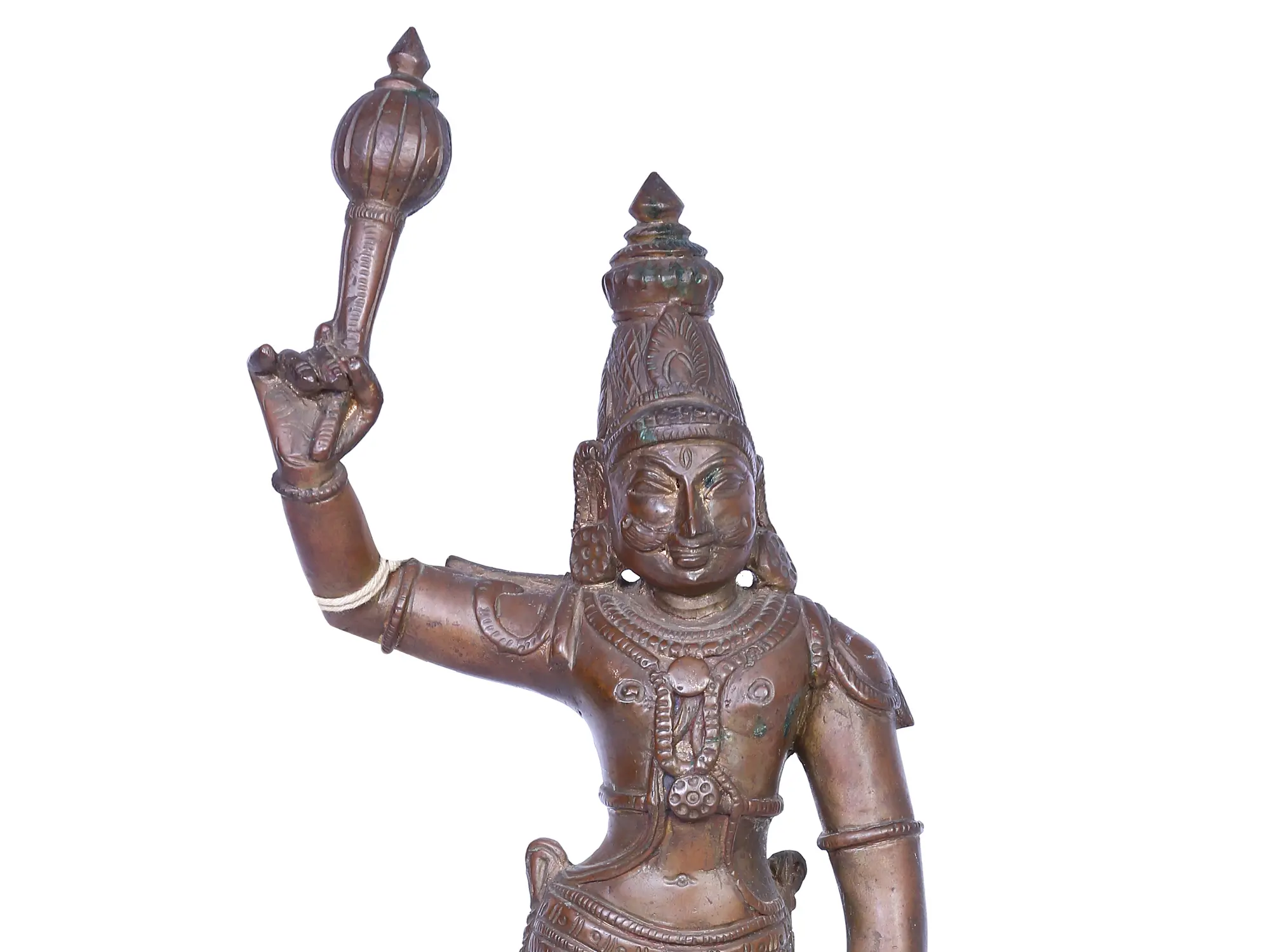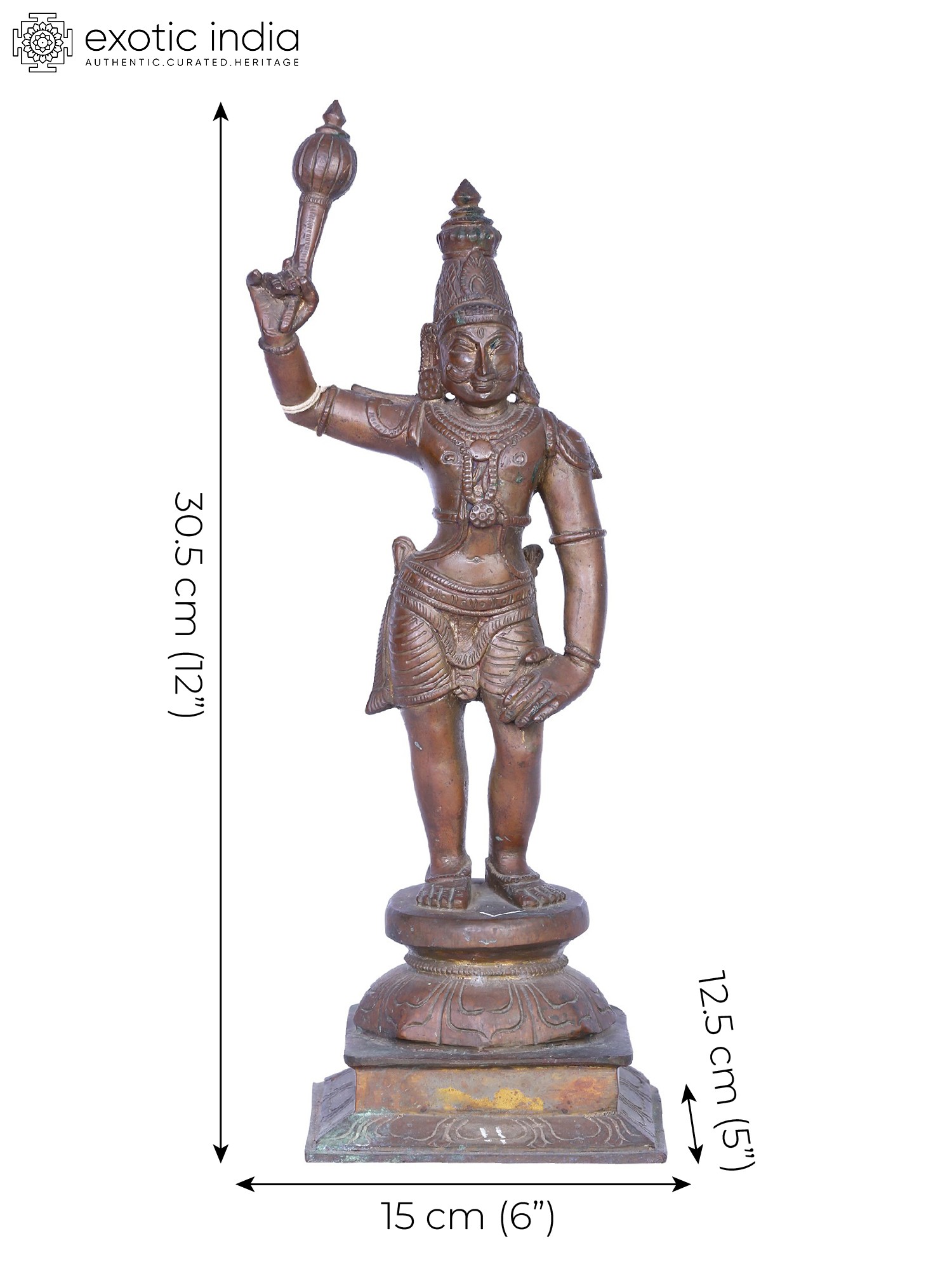 Karuppu Sami, a demigod among the rural social groups of Tamilnadu, stands in divine splendour on a lotus pedestal, his form a dance of grace in the “Tribhanga posture”. With his right hand, bears the Mighty Mace (Gada), an emblem of strength. Regally adorned, Karuppu Sami wears the “Karanda Mukut”, a crown of sovereignty, draped in a Langot, a symphony of necklaces, armlets, and kundals. This artistic masterpiece, crafted in bronze from Swamimalai using the ancient “Madhuchista Vidhana (Lost-Wax) technique”, symbolises resilience, power, and cosmic balance. In the elegant dance of symbolism, Karuppu Sami emerges as a guardian, a deity embodying the union of strength and serenity, an eternal protector in the cosmic ballet.