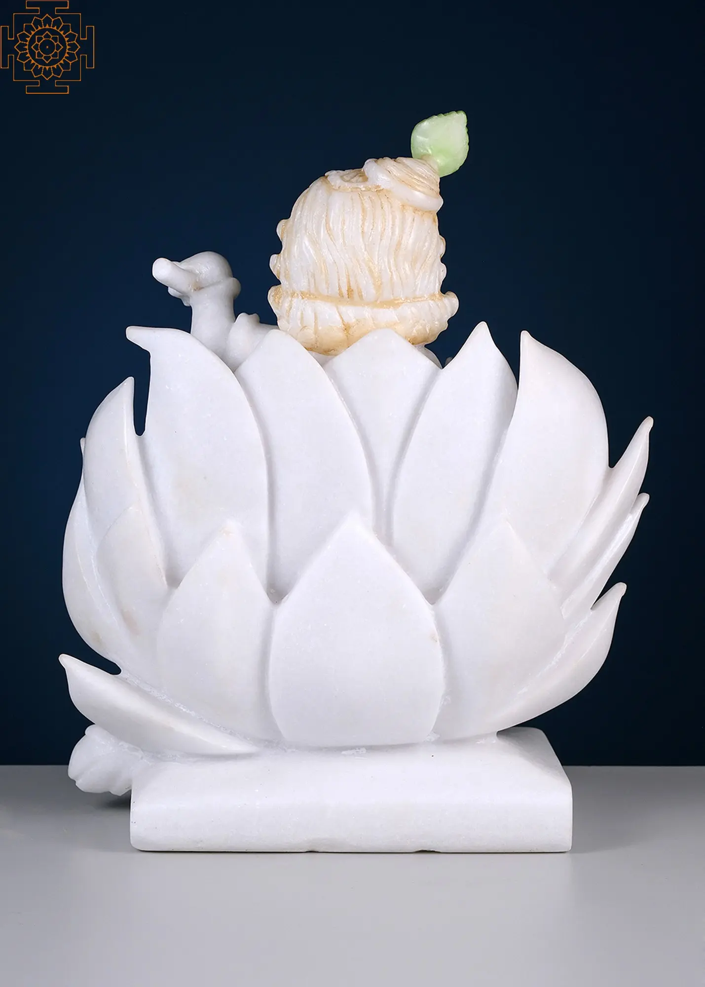 This exquisite sculpture captures the divine essence of Lord Krishna, the beloved deity revered as the eighth avatar of Vishnu. Crafted from the purest white marble, this idol presents the divine child, Kanha, in a serene and captivating pose, seated atop a fully bloomed lotus. The intricate craftsmanship showcases the unparalleled skill of artisans who have transformed the precious stone into a masterpiece of devotion. The lotus itself is a powerful symbol in Hindu mythology, representing purity, beauty, spiritual awakening, and prosperity. It is often associated with deities like Lakshmi, the goddess of wealth, and Saraswati, the goddess of knowledge. Here, Krishna's placement on the lotus signifies his divine origin and his role as the supreme being, emerging from the primordial waters of creation and bringing forth spiritual enlightenment. The delicate carving of the petals, unfurling gracefully around the child, evokes a sense of ethereal beauty and divine serenity.