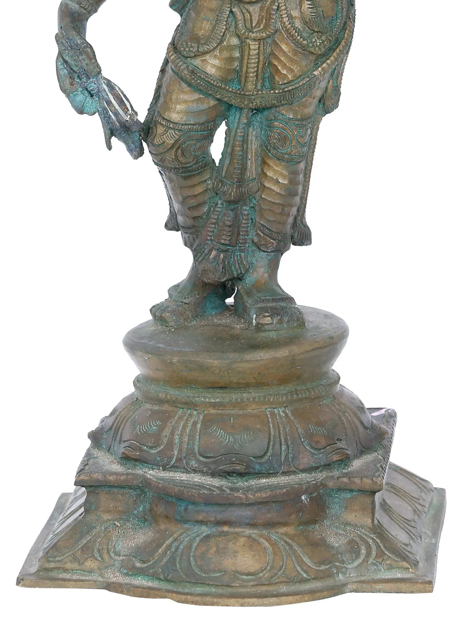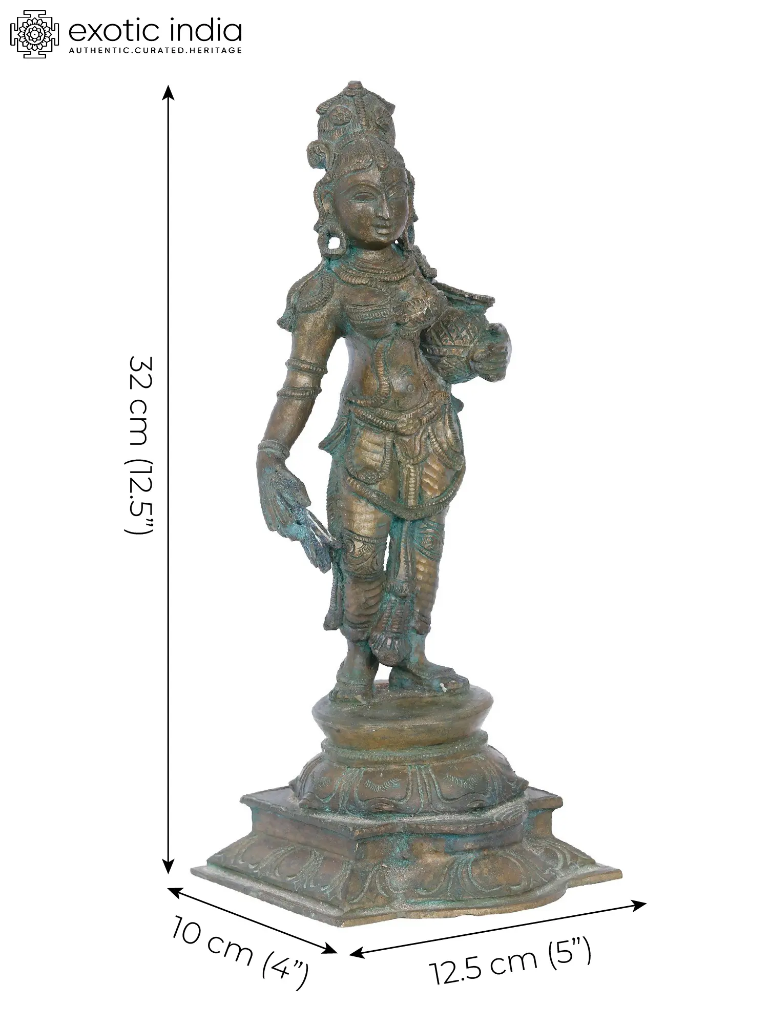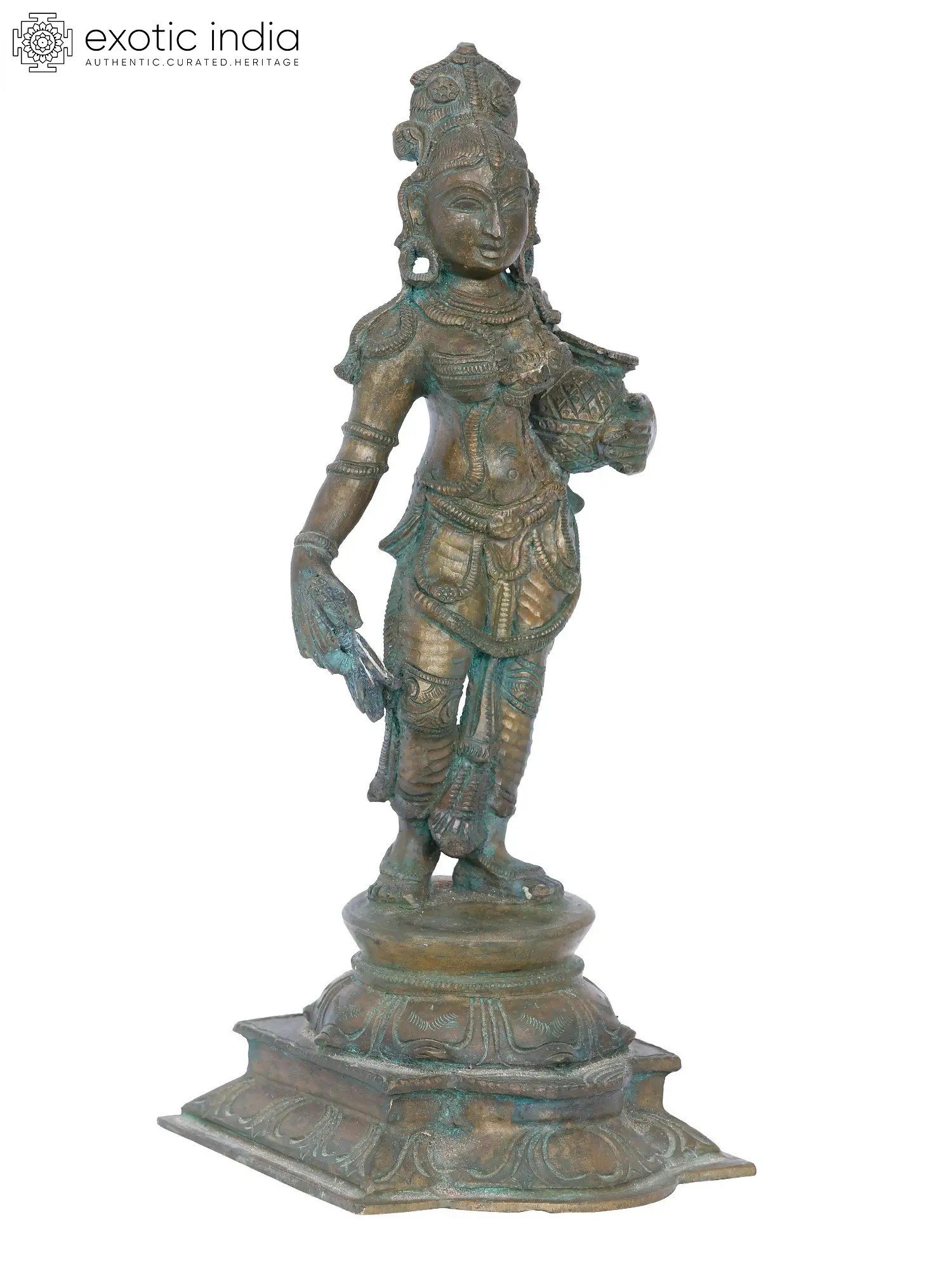 Brimming with youth and feminine grace, the pot bearer in this bronze statue is the picture of Saundarya (beauty) that is the muse of great artists. On a lotus pedestal, the supple body of the lady is positioned, striking a lovely pose, holding the pot of water on her curving waist, and carrying a fresh blossom in her right hand. Her luscious locks are tied in a traditional bun, which is adorned with hair ornaments such as Sun and Moon shaped pins and jeweled Maatha-patti or hair band. The rest of her ornamentation too displays the rich cultural heritage of Southern India.