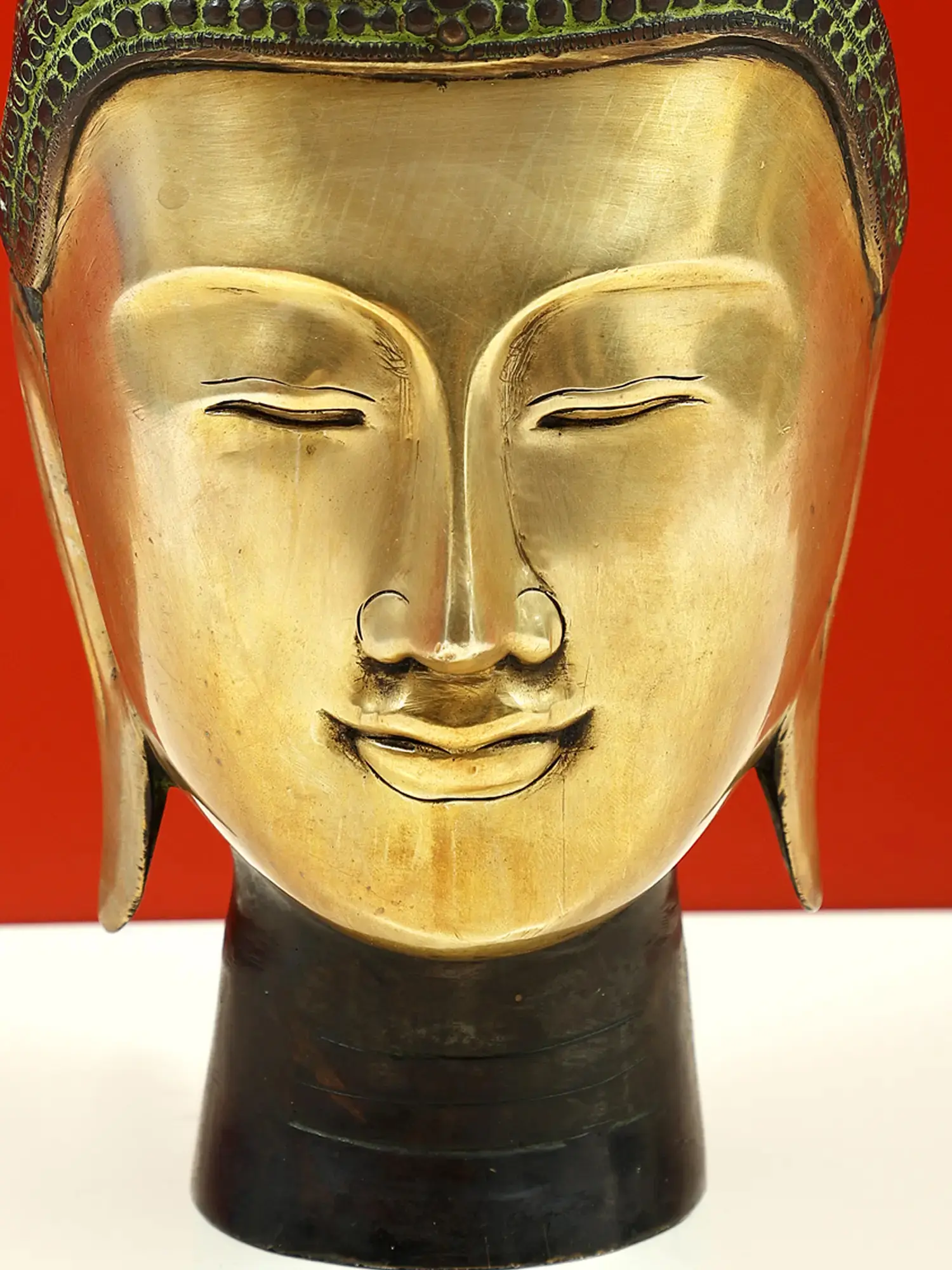 This substantial 12-inch brass Buddha head is designed to be a focal point in any environment. Its commanding presence makes it ideal for meditation rooms, yoga studios, studies, or even as an elegant accent piece in your living area. The warm, golden hue of the brass emanates a gentle radiance, while the dark patina on the hair adds depth and character. Whether you are a devout follower of Buddhism or simply appreciate the aesthetic beauty and spiritual resonance of such art, this statue will undoubtedly bring a sense of calm and contemplation to your surroundings. It makes for a thoughtful and meaningful gift, conveying wishes for peace, wisdom, and well-being to the recipient. Its timeless appeal ensures it will be cherished for generations to come.