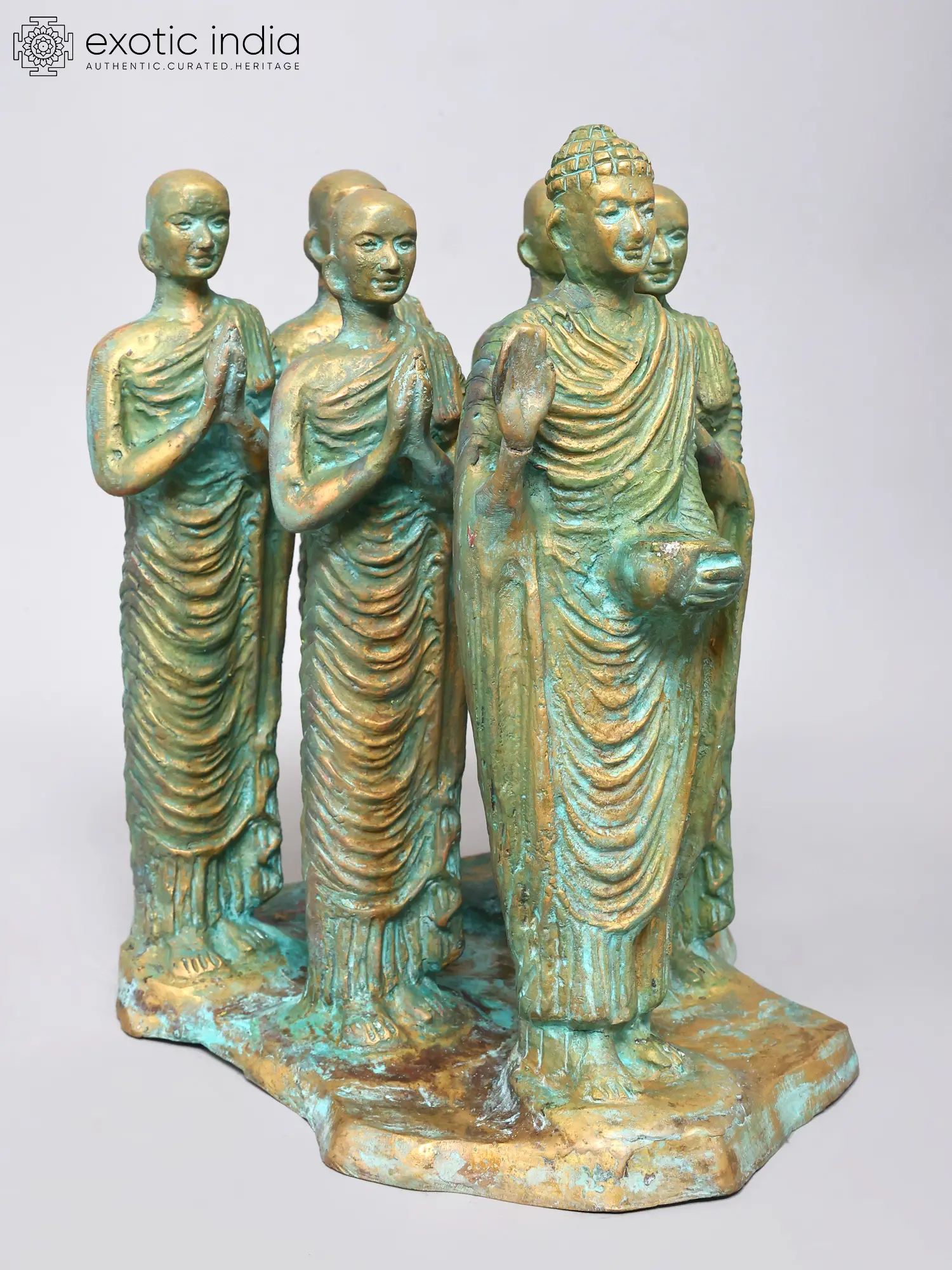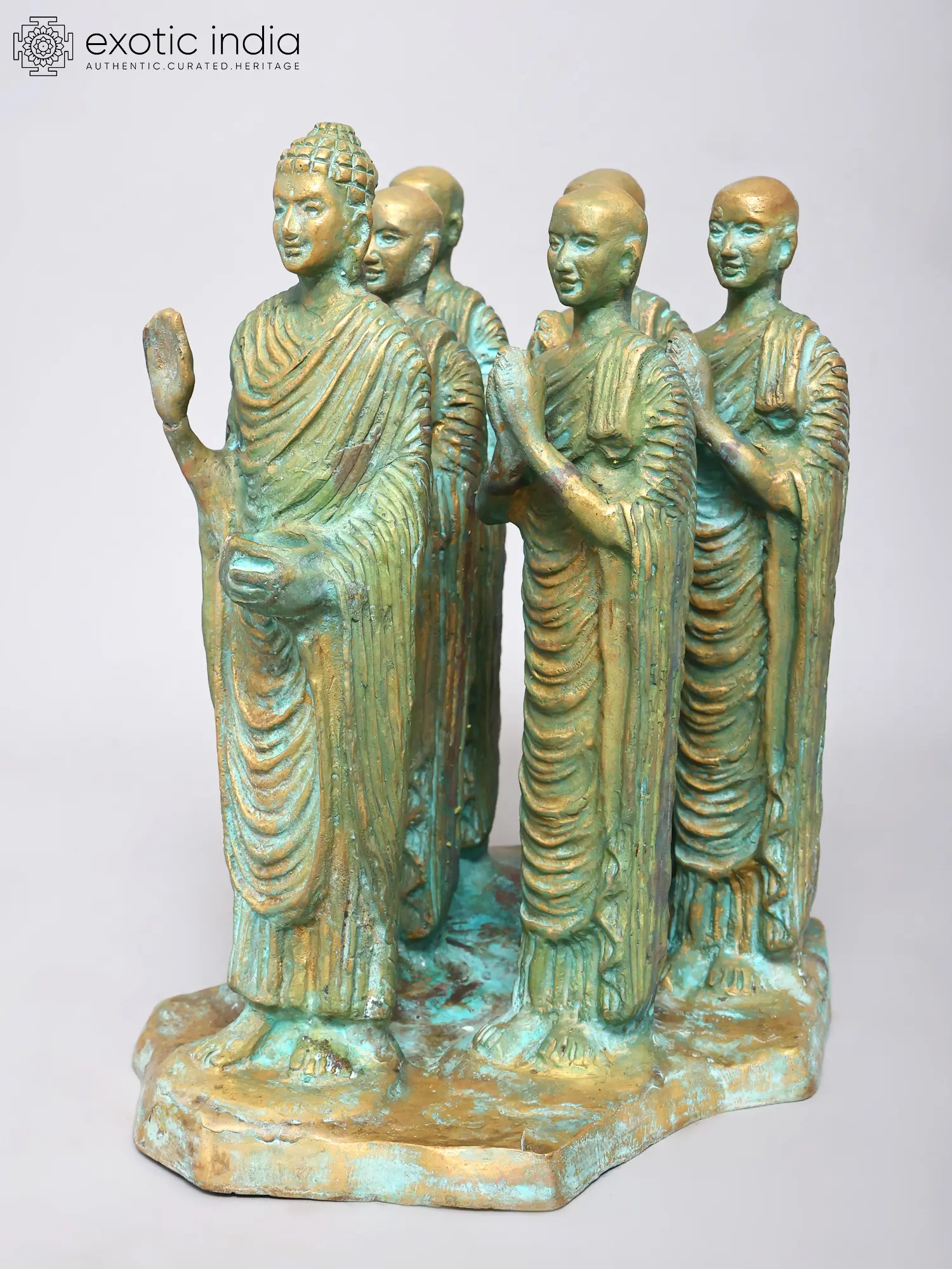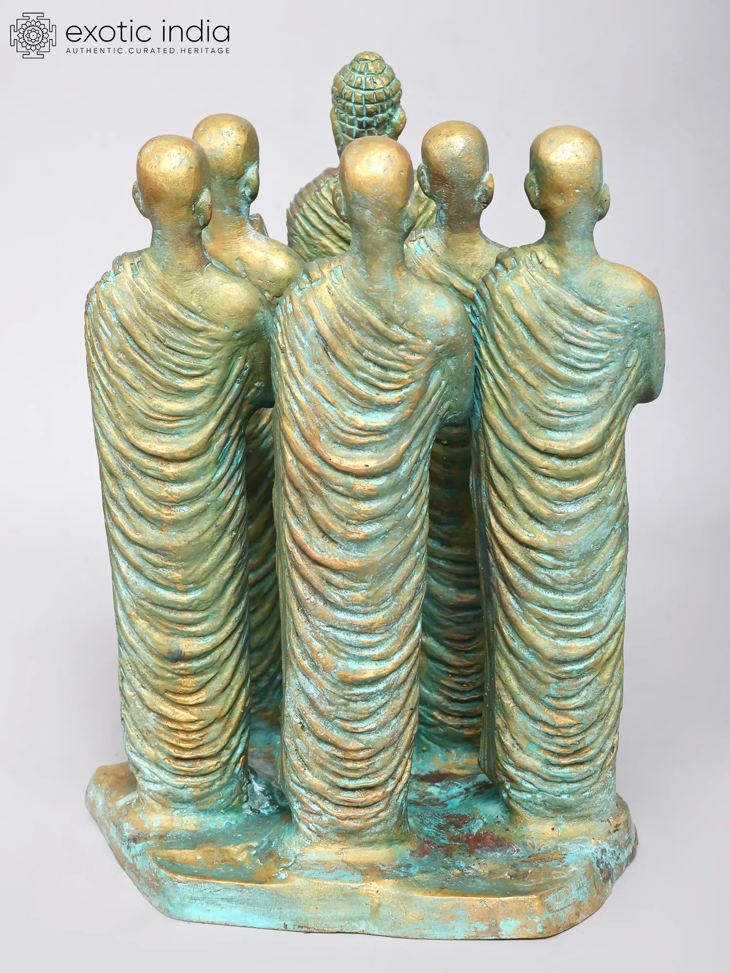 Standing at twelve inches tall, this composition presents a commanding yet gentle presence. The central figure of the Buddha, with his calm gaze and hands gently cupped, radiates tranquility. The disciples, with their hands pressed together in reverent salutation, form a harmonious ensemble around their teacher. The carefully sculpted base anchors the figures, suggesting a sacred ground upon which enlightenment unfolds. The interplay of light and shadow across the textured surfaces adds depth and dimension.