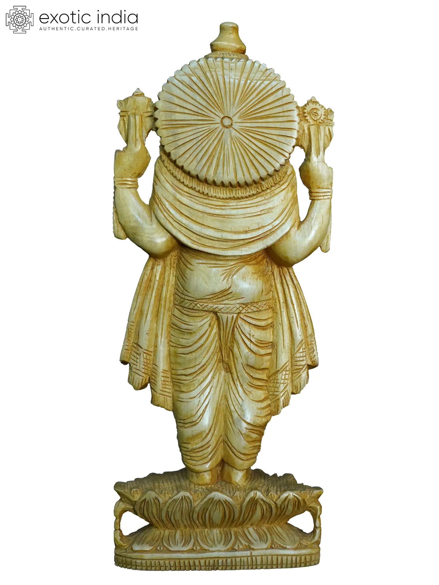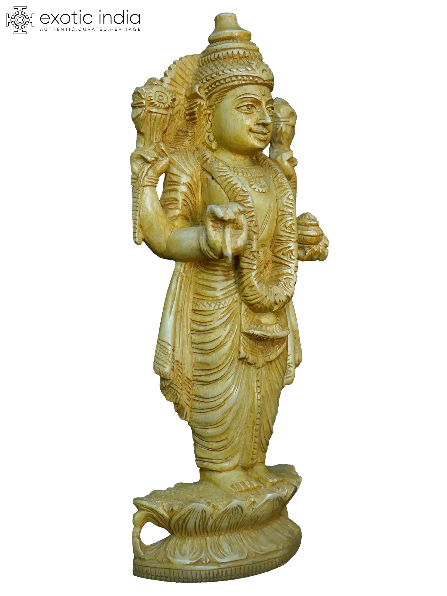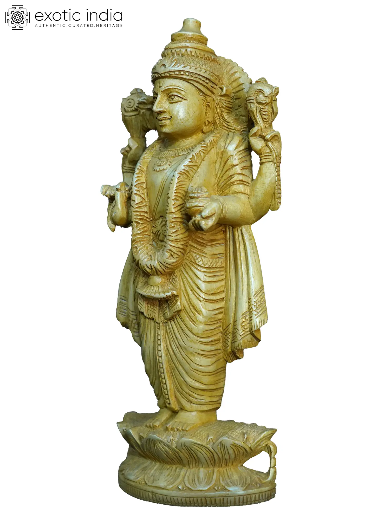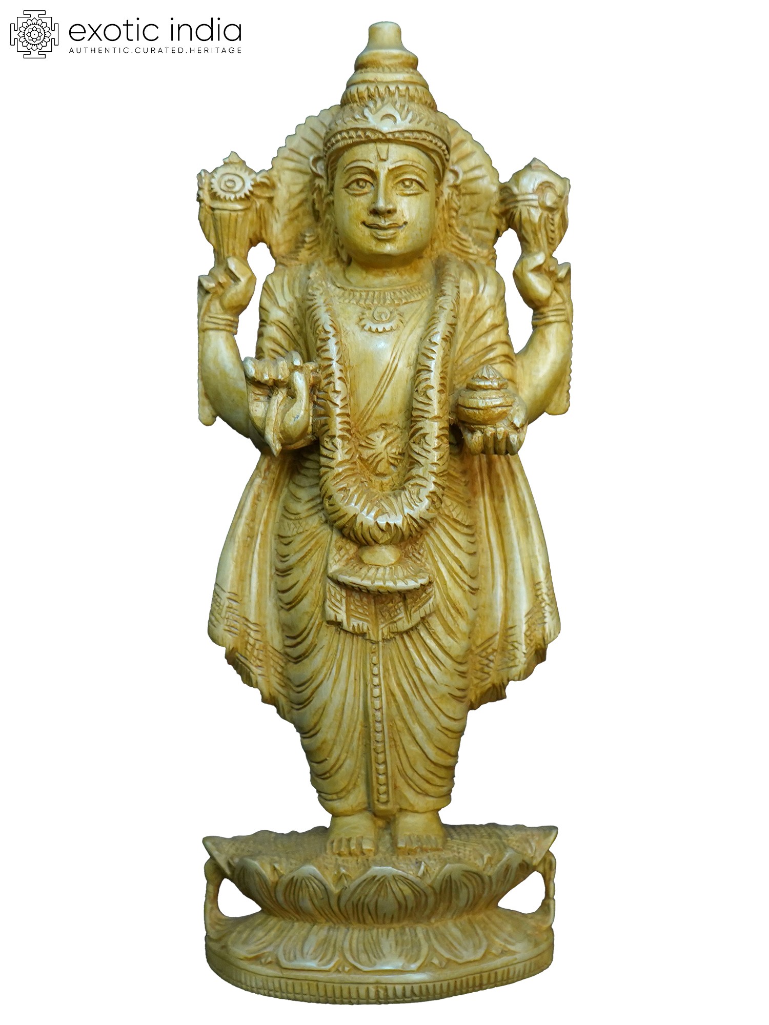 The statue is skillfully carved from white wood, its light hue emphasizing the delicate details of the deity's form. The artisan has paid close attention to the traditional depiction of Dhanvantri, including his characteristic attributes. In his hands, he holds the pot of Amrita, the nectar of immortality, a symbol of his power to grant long life. He also holds herbs, further emphasizing his role as a healer. The flowing lines of his garments and the intricate carvings on his crown and jewelry showcase the dedication and artistry that went into creating this sacred object. He stands gracefully atop a lotus base, a symbol of purity and enlightenment.