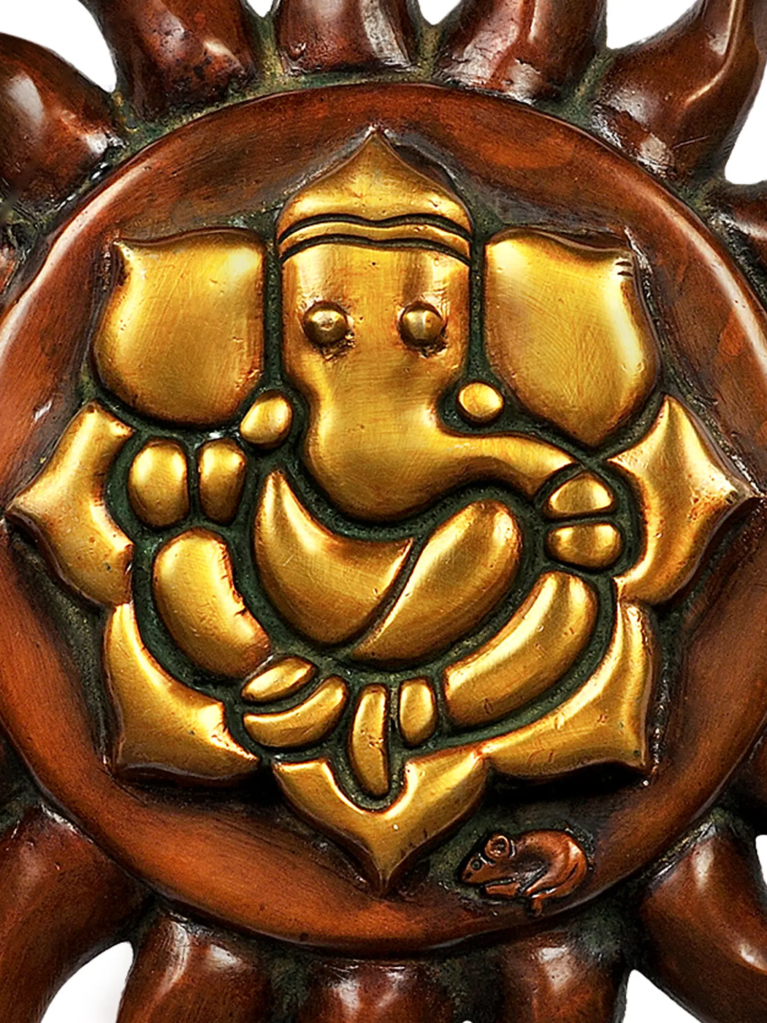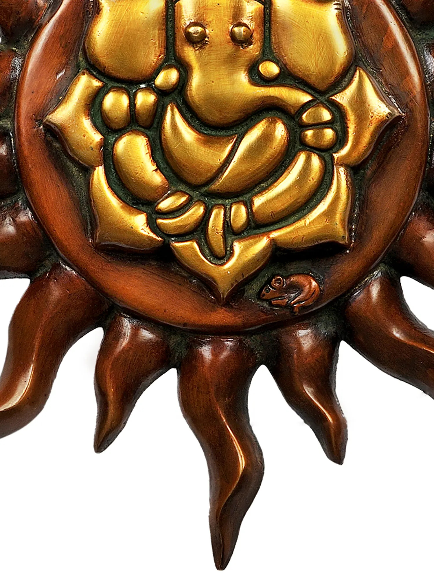 This Handmade Brass Wall Hanging features Lord Ganesha in a resplendent golden hue, set against a lacquer-finished backdrop of Surya, rendered in rich brown tones with a radiant halo. This exquisite artwork symbolizes the harmonious relationship between Ganesha, the remover of obstacles, and Surya, the sun god. It embodies the belief that Ganesha's blessings bring enlightenment and success, mirroring the radiance and life-giving energy of the sun. This wall hanging from India is a captivating testament to the divine synergy between these two powerful deities, infusing spaces with positivity and auspiciousness.