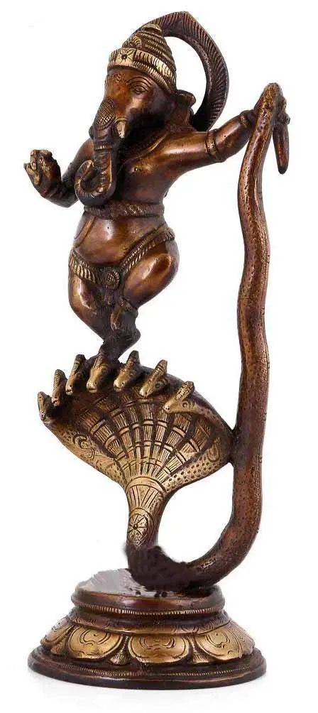 This exquisite brass sculpture captures a dynamic and awe-inspiring moment in Hindu mythology: Lord Ganesha, the remover of obstacles and the god of wisdom and prosperity, depicted in a joyous dance atop the coils of Sheshnag, the king of all serpents. The rich patina of the brass lends an air of timeless antiquity to this handcrafted piece, originating from the skilled artisans of India. The form of Lord Ganesha is instantly recognizable with his elephantine head, a symbol of strength, intelligence, and unwavering focus. Here, he is rendered in a celebratory pose, his trunk gracefully curved, and his multiple hands in mudras that suggest movement and benediction. His joyful expression speaks of the boundless bliss and divine energy that he embodies. The intricate detailing on his headdress, the subtle sculpting of his form, and the delicate jewelry all speak to the artistry involved in its creation. Sheshnag, also known as Adi Shesha, is a primordial serpent deity, often depicted with a thousand heads. In Hindu cosmology, Sheshnag serves as the celestial couch upon which Lord Vishnu rests, representing the eternal, infinite nature of the universe. The representation of Ganesha dancing on Sheshnag signifies the triumph of wisdom and divine order over the chaos of ignorance and illusion. It is said that Sheshnag, with his thousand hoods, spreads his protective canopy, symbolizing his role as a divine protector. In this artwork, the serpent’s multiple heads fan out gracefully beneath Ganesha’s dancing feet, a testament to its immense power and watchful presence. This artistic rendition evokes the concept of cosmic dance, a fundamental idea in Hinduism where creation, preservation, and destruction are seen as cyclical and interconnected movements orchestrated by the divine. Ganesha’s dance is not merely a physical act but a representation of the universal rhythm and the vibrance of life. The flowing lines of the serpent's body and Ganesha's agile posture create a sense of perpetual motion, making this sculpture a vibrant focal point for any space.