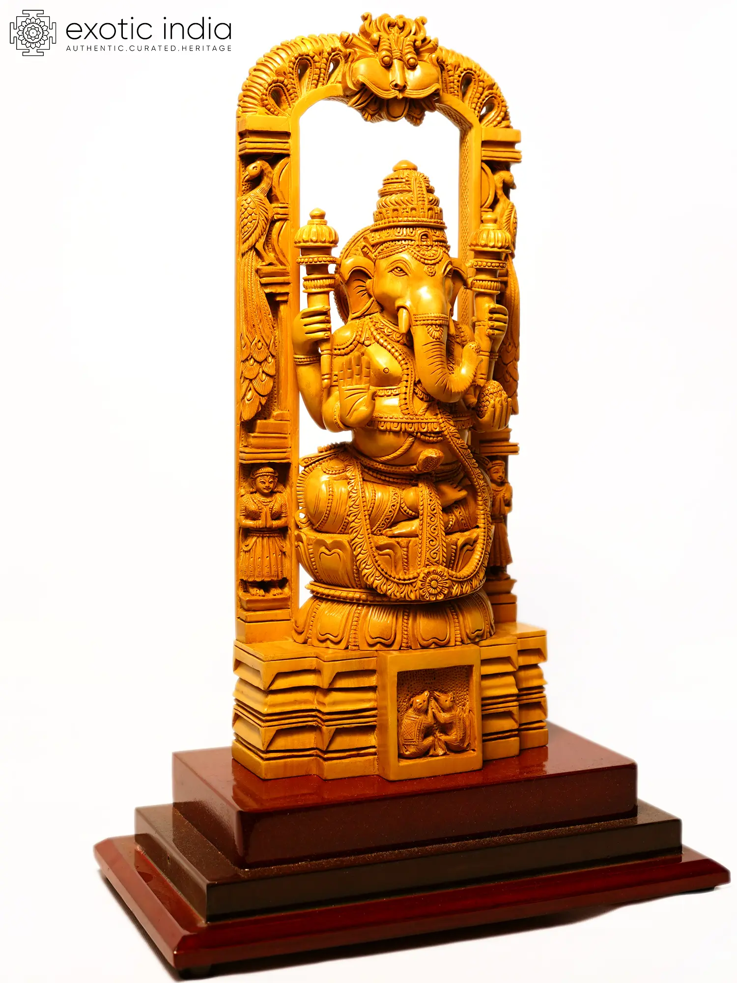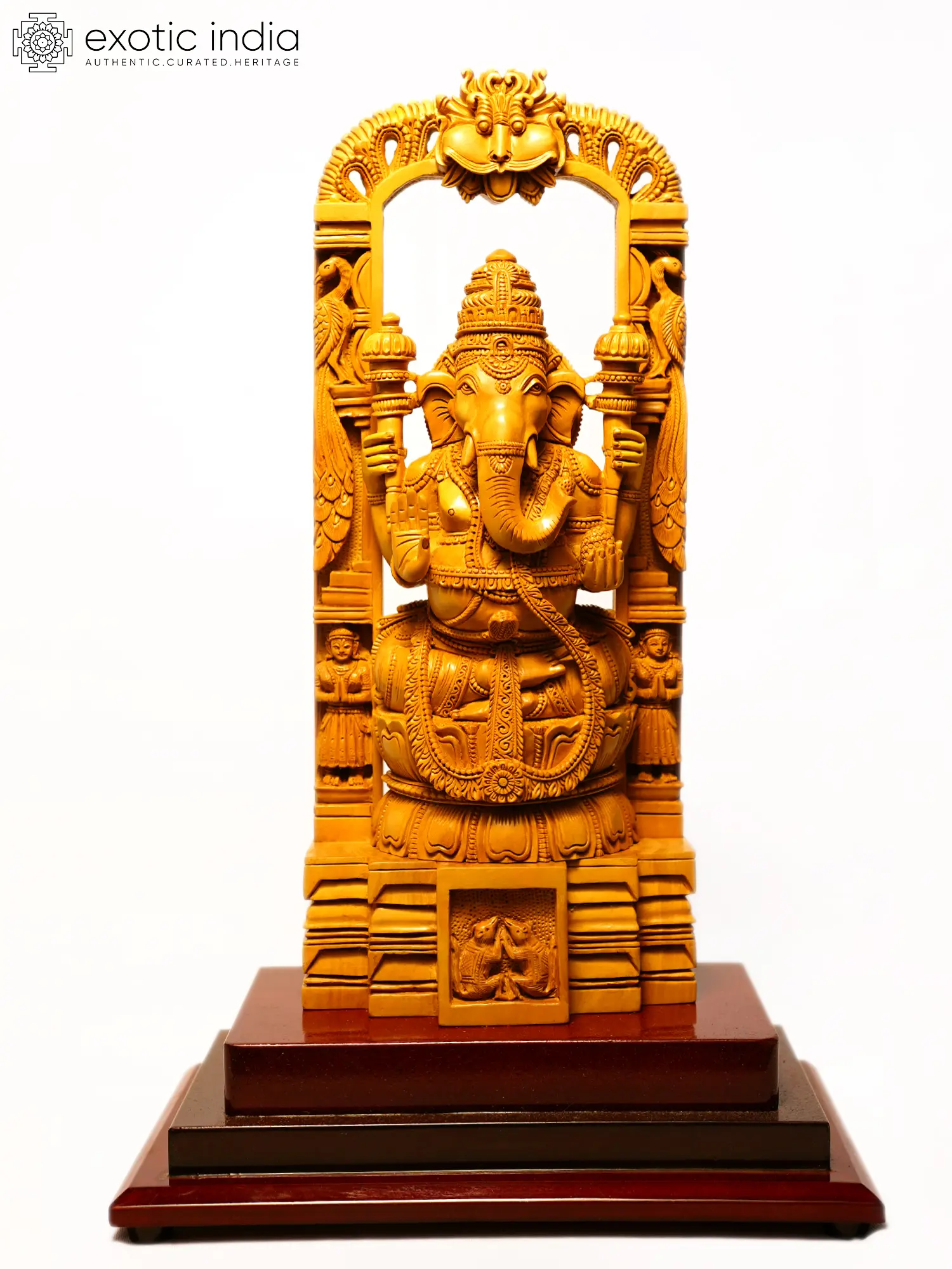 13" Chaturbhuja Ganesha Seated on Lotus | Sandalwood Carved Statue