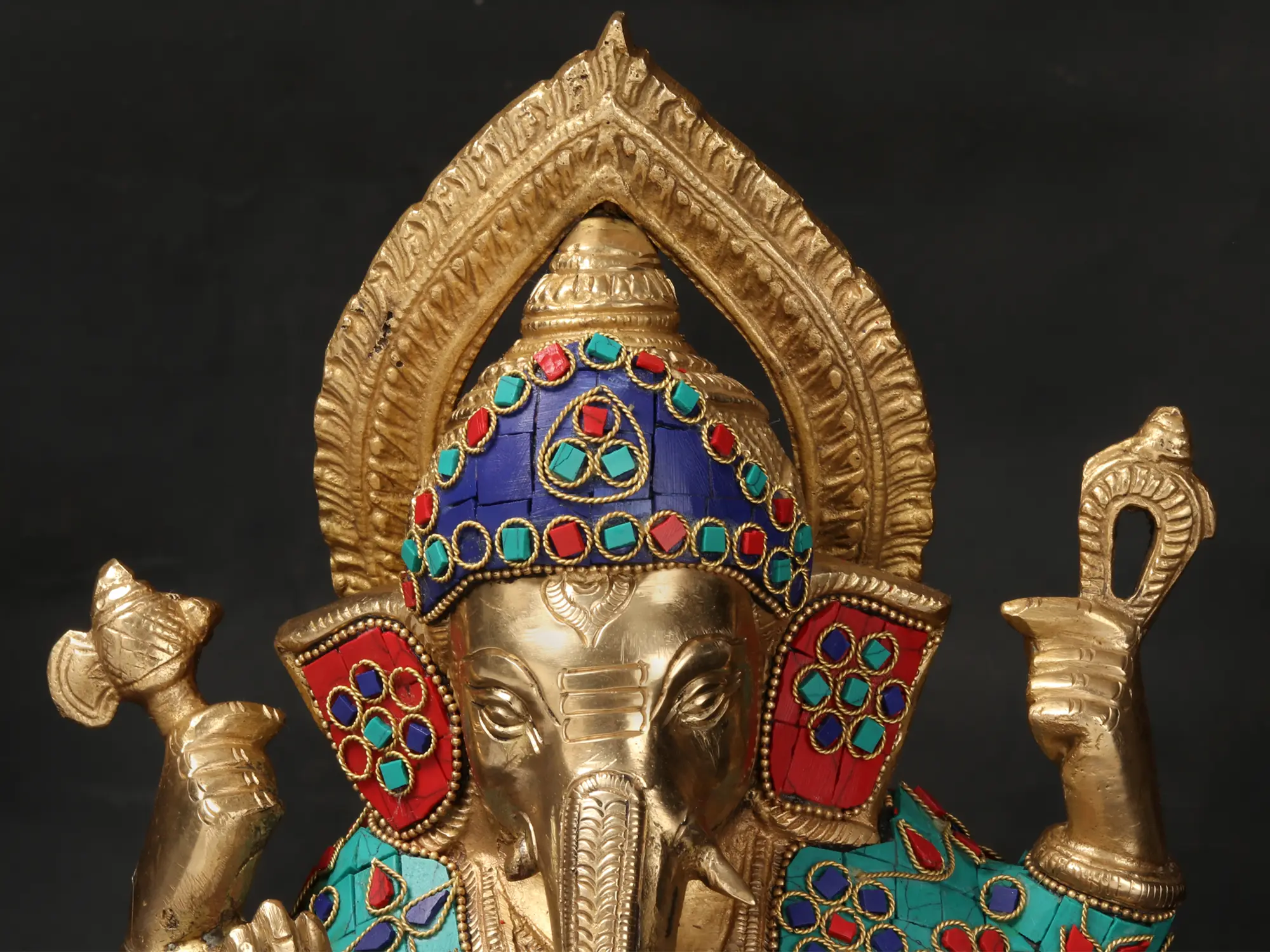 Invite the blessings of wisdom, prosperity, and auspicious beginnings into your home with this exquisite brass sculpture of Lord Ganesha. Seated gracefully upon his Vahana, the divine mouse Mushika, this magnificent piece is a testament to the rich artistic heritage of India. Crafted with meticulous attention to detail and adorned with vibrant inlay work, this statue embodies the divine presence of the beloved elephant-headed deity. Lord Ganesha, also known as Ganapati or Vinayaka, is revered as the god of intellect, wisdom, and good fortune. He is the patron of arts and sciences, and the deva who presides over new beginnings. In Hindu mythology, Ganesha is famously known as the remover of obstacles, making him the first deity invoked in any prayer or ritual. His unique form, with an elephant's head and a human body, symbolizes the union of the earthly and the divine, the material and the spiritual. Tales abound of his cleverness, his love for modaks (sweet dumplings), and his pivotal role in the composition of the epic Mahabharata, where he famously wrote it down as dictated by the sage Vyasa. The Vahana of Lord Ganesha, the humble mouse Mushika, represents the triumph of spirit over matter, the control of desires and the mastery of ego. Mushika, despite its small stature, is portrayed here with dignity, attentively carrying its divine master. This symbiosis signifies that even the seemingly insignificant can achieve great purpose when guided by divine wisdom and purpose.