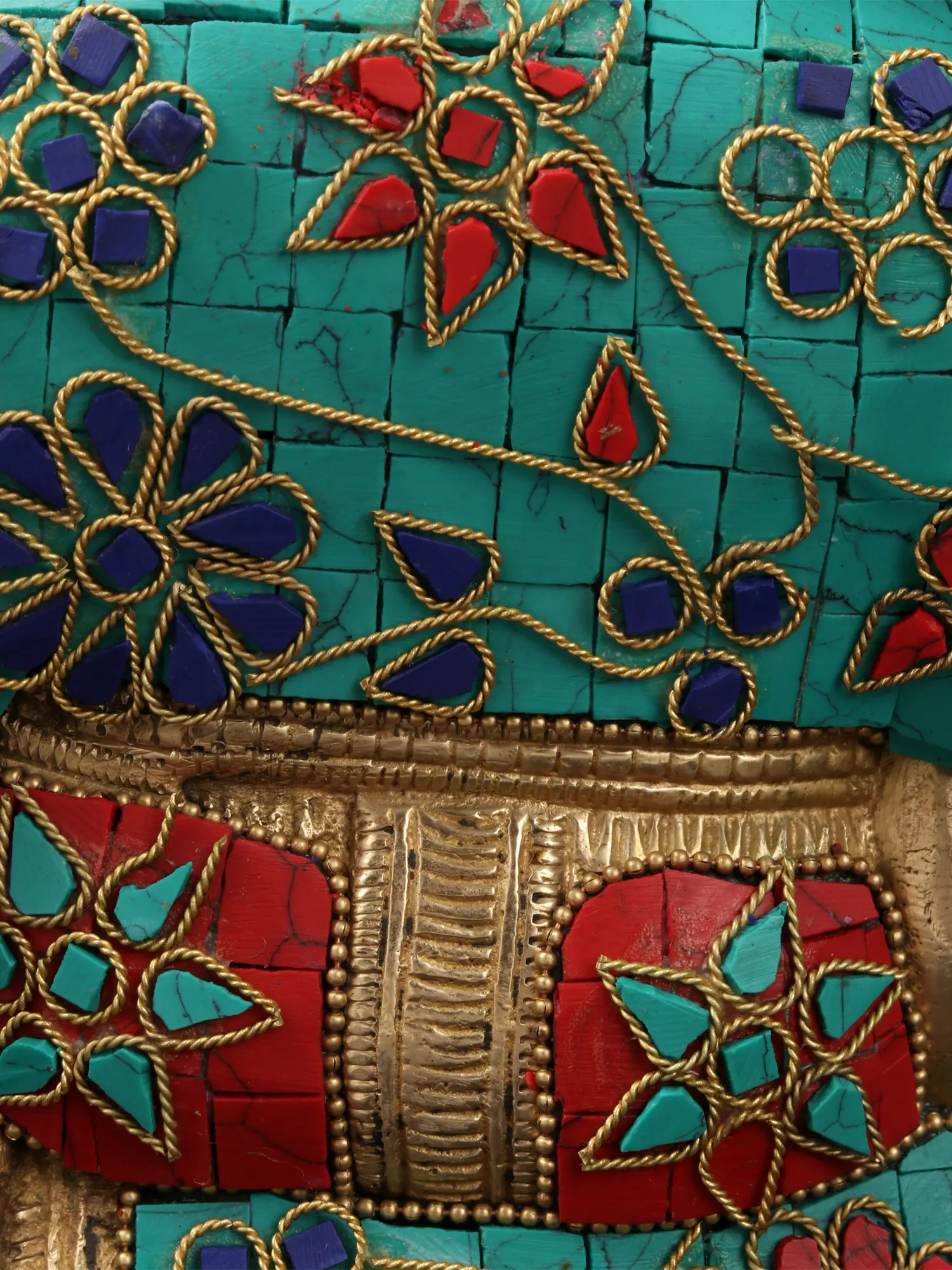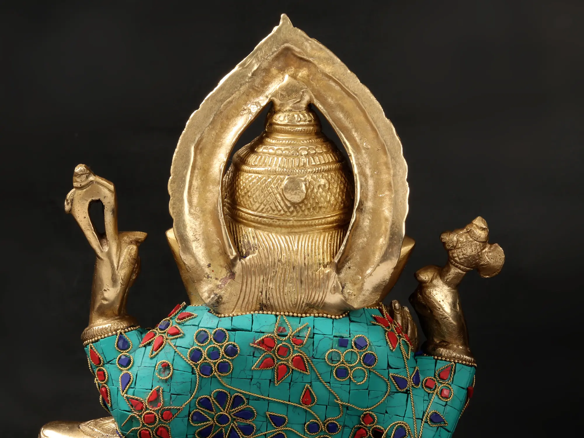 This stunning sculpture is more than just a decorative item; it is a work of art. Handcrafted by skilled artisans in India, the solid brass material lends a timeless elegance and durability. The surface of the statue is further enhanced by intricate inlay work, featuring vibrant hues of turquoise and red, interspersed with accents of blue. These carefully placed stones form captivating patterns, adding a layer of depth and visual appeal that draws the eye and sparks conversation. The rich patina of the brass, combined with the colorful inlay, creates a piece that is both traditional and strikingly contemporary, fitting seamlessly into a variety of interior design styles. This statue is a testament to the dedication and passion of Indian craftspeople, who have preserved these ancient art forms for generations.