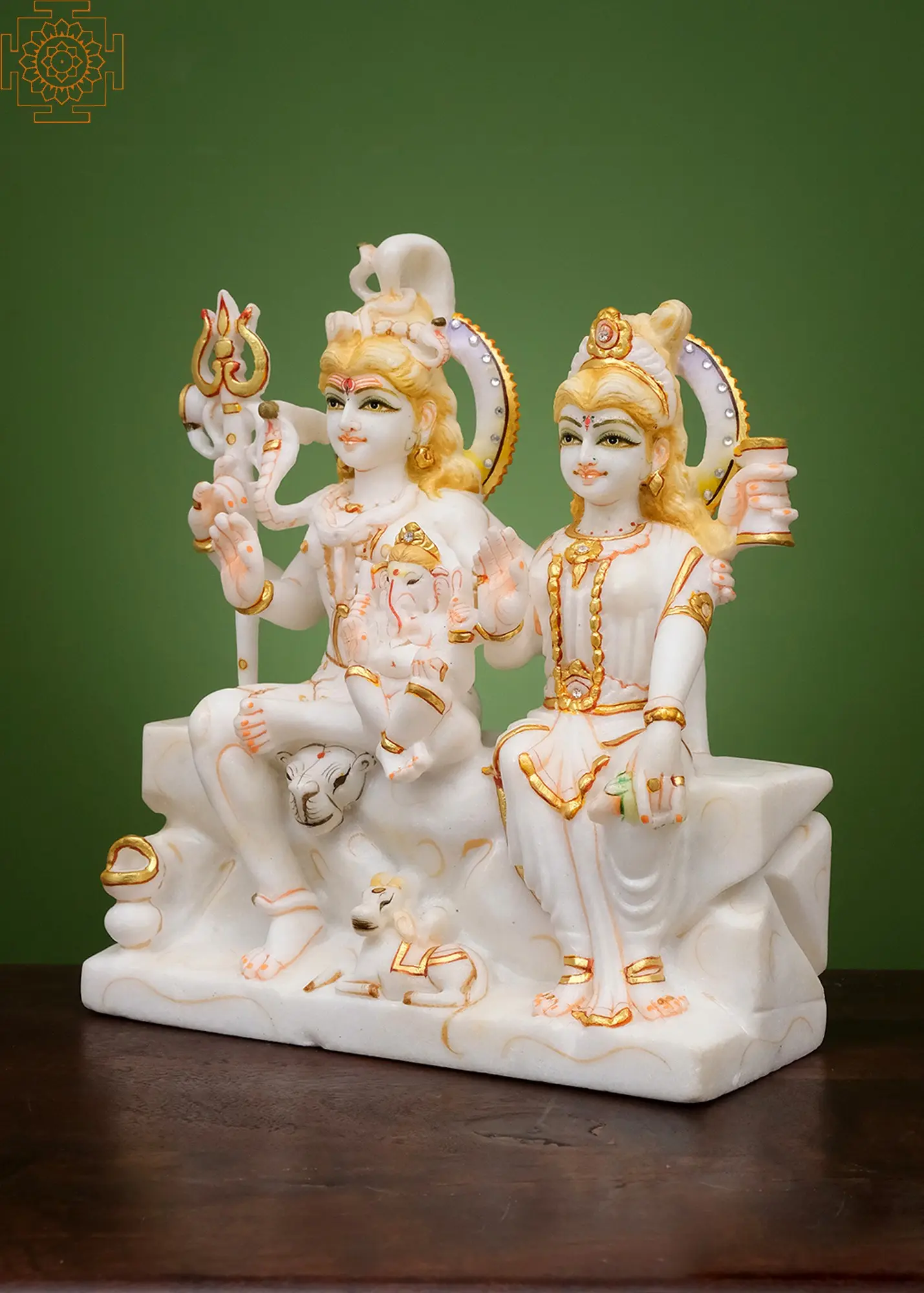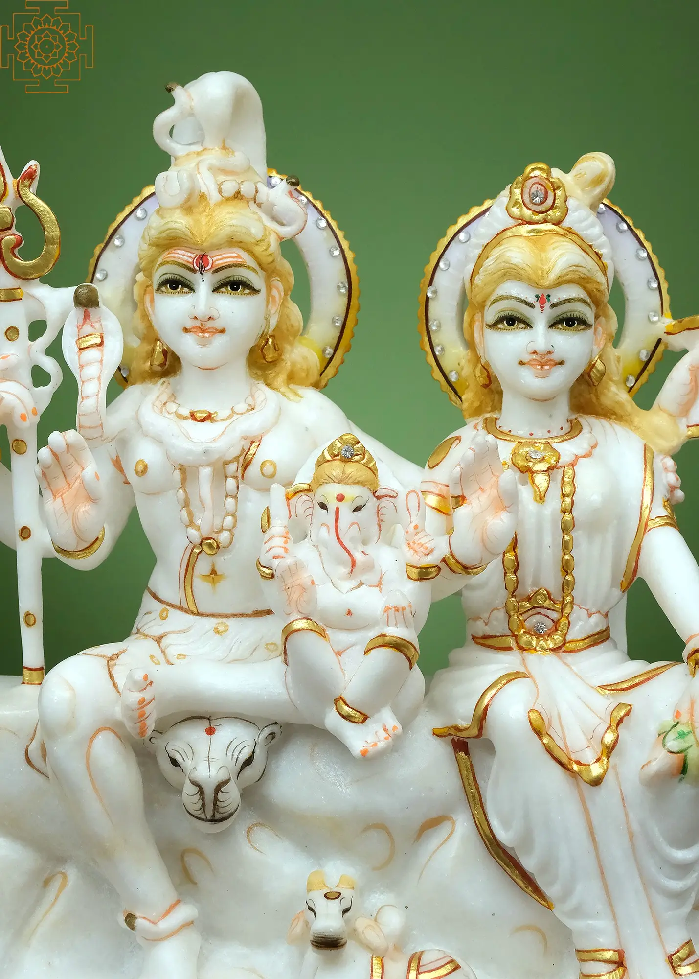 Invite the auspicious presence of the divine family into your home with this exquisite white marble sculpture. This masterpiece portrays Lord Shiva, the Supreme Being, seated majestically, his serene countenance radiating peace and power. Beside him sits his beloved consort, Goddess Parvati, the embodiment of divine feminine energy, grace, and beauty. Nestled between them is their beloved son, Lord Ganesha, the remover of obstacles and the god of new beginnings, his gentle presence a symbol of joy and prosperity. Completing this harmonious tableau is Nandi, Lord Shiva's devoted bull vahana, and a gentle calf, representing purity and devotion, all resting upon a cloud-like base, signifying their celestial abode.