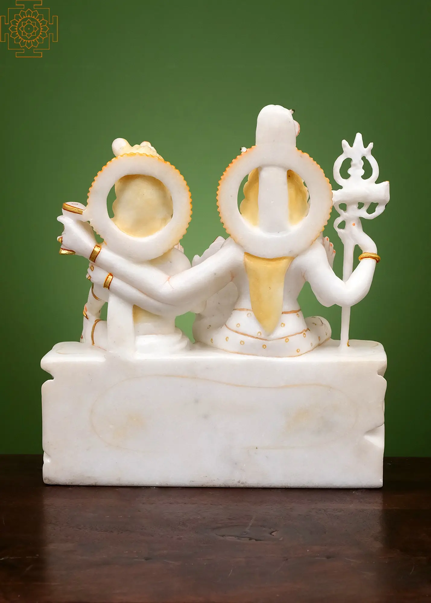 Crafted with meticulous care from pure white marble, this statue is a testament to the skill of Indian artisans. The smooth, cool touch of the marble evokes a sense of purity and divinity. Every feature, from the subtle curves of their divine forms to the intricate details of their adornments, is rendered with remarkable precision. Lord Shiva's traditional trident (Trishul) is held with authority, while Goddess Parvati's gentle hand holds a lotus, a symbol of purity and enlightenment. The serene expression on each deity’s face invites contemplation and devotion, making this sculpture not just a decorative piece, but a focal point for spiritual connection. The delicate gold accents further enhance the regal and divine aura of the figures, making them truly captivating.