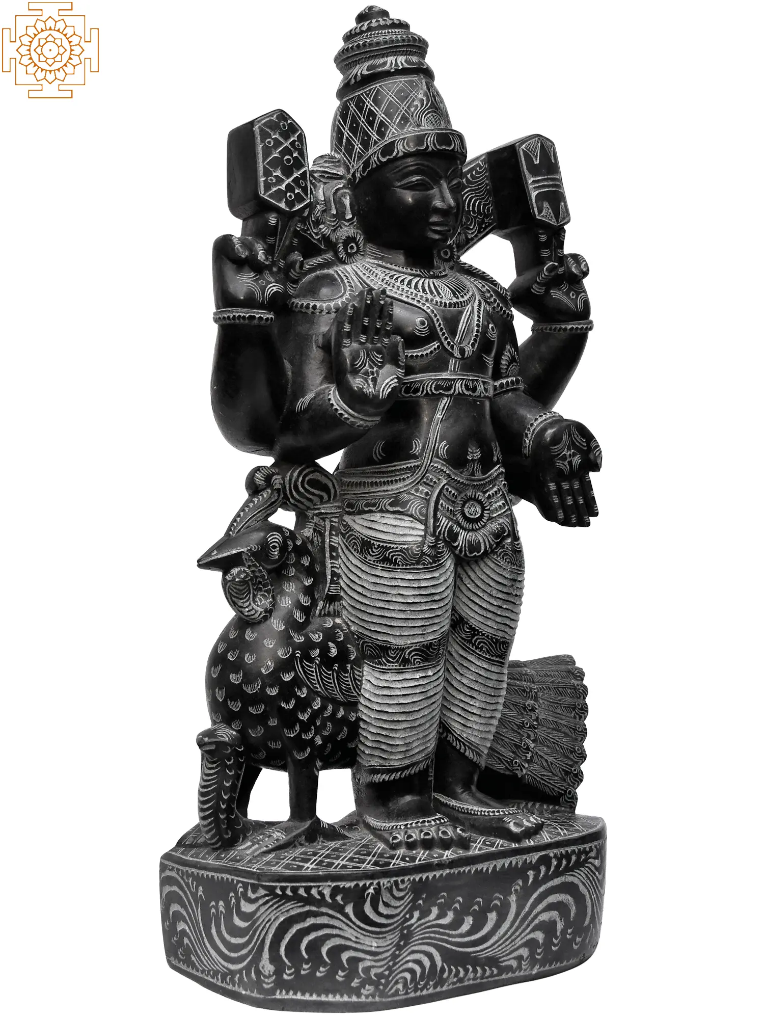 21" Standing Lord Murugan with His Vel and Vahana | Black Granite Stone Statue