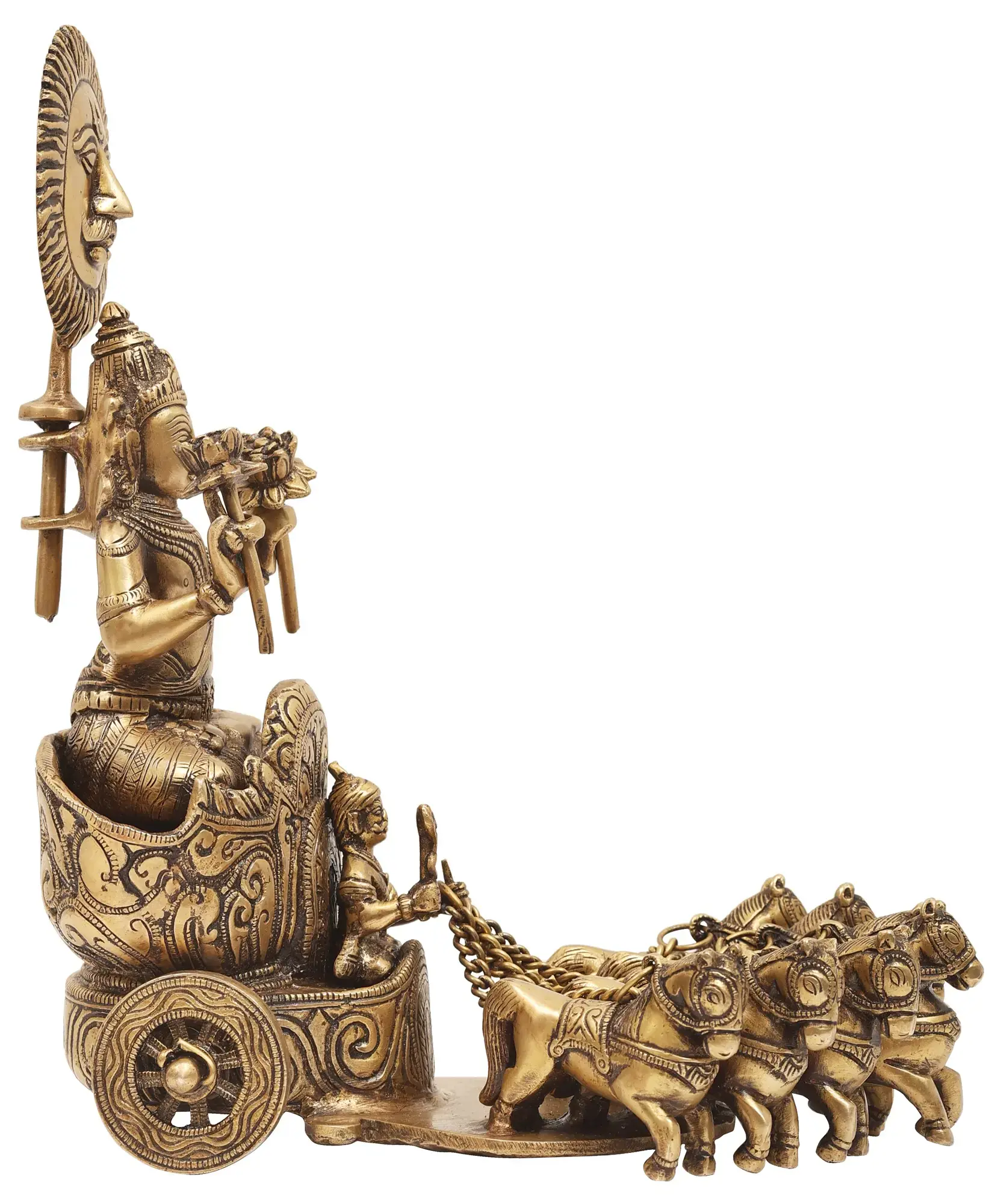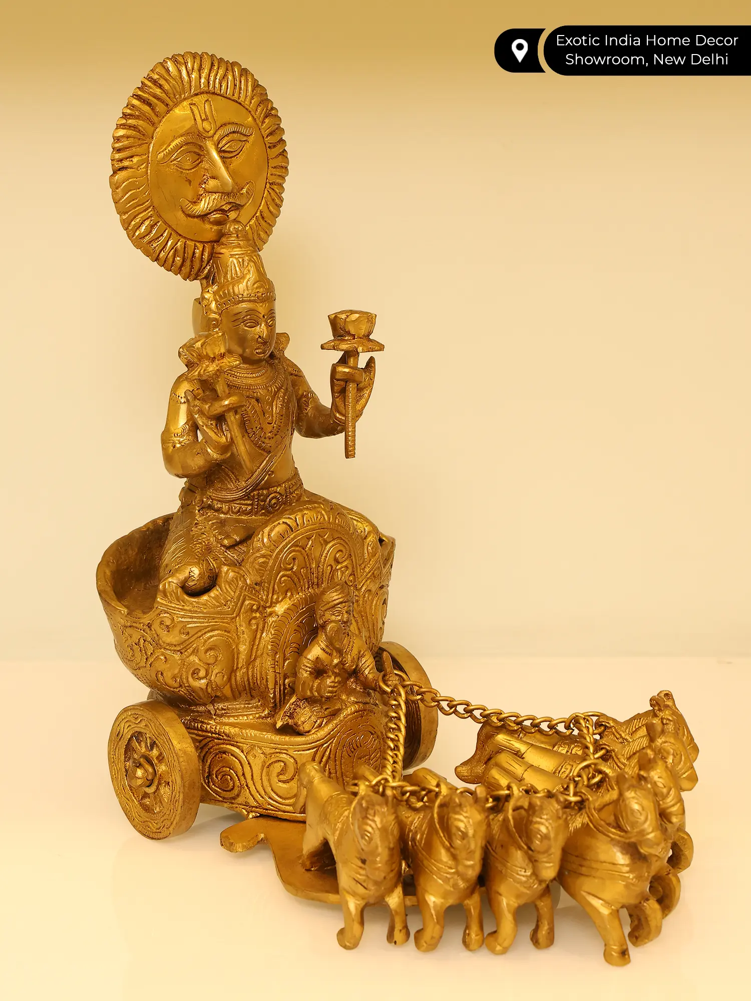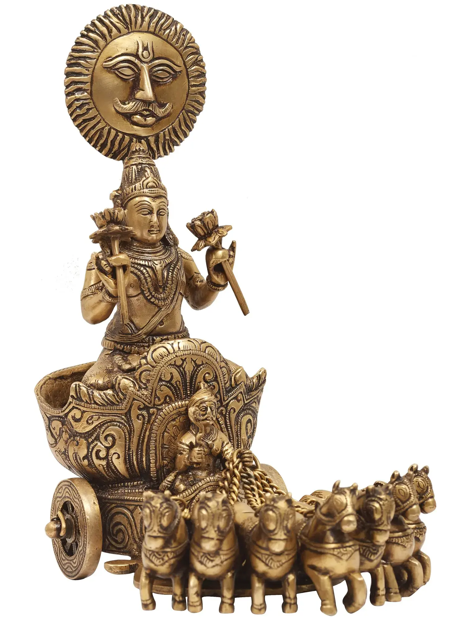 Lord Surya Chariot Statue, a divine symbol of radiant spirituality. Crafted with precision, this sculpture beautifully captures Lord Surya seated in his celestial chariot, a representation of his divine presence. Each horse that adorns the chariot mirrors the vibrant hues of sunlight, symbolizing the passage of time across the seven days of the week.