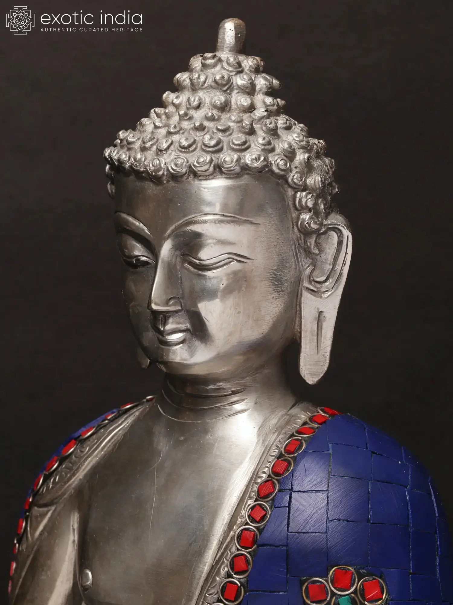 Crafted from high-quality brass, this statue is a testament to the skill of artisans who have brought this sacred image to life. The silver-like finish of the Buddha's form possesses a refined luminescence, accentuating the delicate lines of his features and the flowing drapery of his robe. The meticulous inlay of lapis lazuli and other semi-precious stones imbues the piece with a tangible sense of sacredness and artistic mastery. The lotus throne upon which he sits, a universal symbol of purity and enlightenment, further enhances the statue's spiritual aura. This piece is not merely an object of art but a conduit for spiritual practice, inviting mindfulness, contemplation, and a connection to the profound healing energy of the Medicine Buddha. Whether placed in a home altar, meditation space, or as a decorative accent, it promises to inspire peace and well-being.