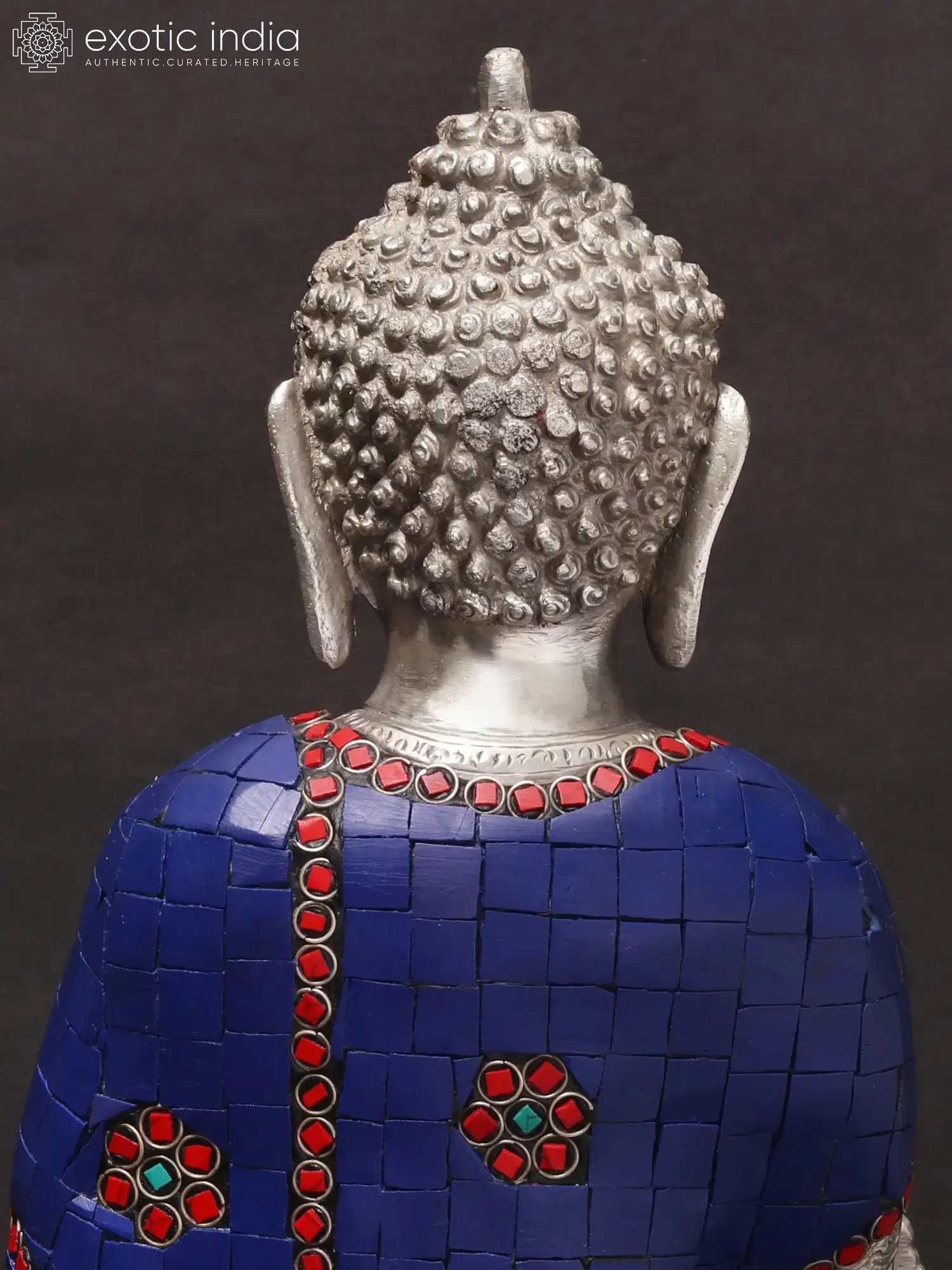 This exquisite statue captures the serene presence of the Medicine Buddha, a manifestation of Buddha's healing power and ultimate compassion. Seated in a meditative posture, this divine figure embodies tranquility and offers solace to all who behold him. The rich, vibrant blue of his robes, meticulously adorned with intricate stone work, evokes the celestial realm and the deep, boundless nature of the universe. Each blue tesserae is bordered by a delicate crimson, reminiscent of the precious gems often offered in devotion, while small green and red floral motifs add bursts of color, symbolizing the flourishing of life and well-being.