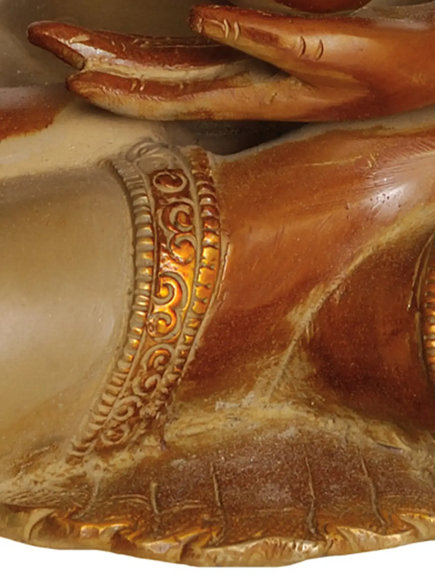 The Medicine Buddha is typically depicted holding a bowl in his left hand, which contains the nectar of immortality and the medicinal herbs that can cure all ailments. In this statue, the bowl is held with delicate care, symbolizing the potent remedies and profound wisdom he offers. His right hand is often shown resting on his knee, palm facing outwards in the gesture of *Varada Mudra*, the gesture of granting boons and blessings. This signifies his willingness to bestow healing and protection upon all who seek his aid. The rich robes draped over his shoulders and body are adorned with ornate patterns, hinting at his regal and divine nature, while the contrast in the patination of the brass adds depth and visual richness, reflecting the skilled craftsmanship involved. The urna on his forehead, a stylized spiral, is a powerful symbol of wisdom and spiritual insight, often associated with the enlightened eye. ––––––––––––––––––––