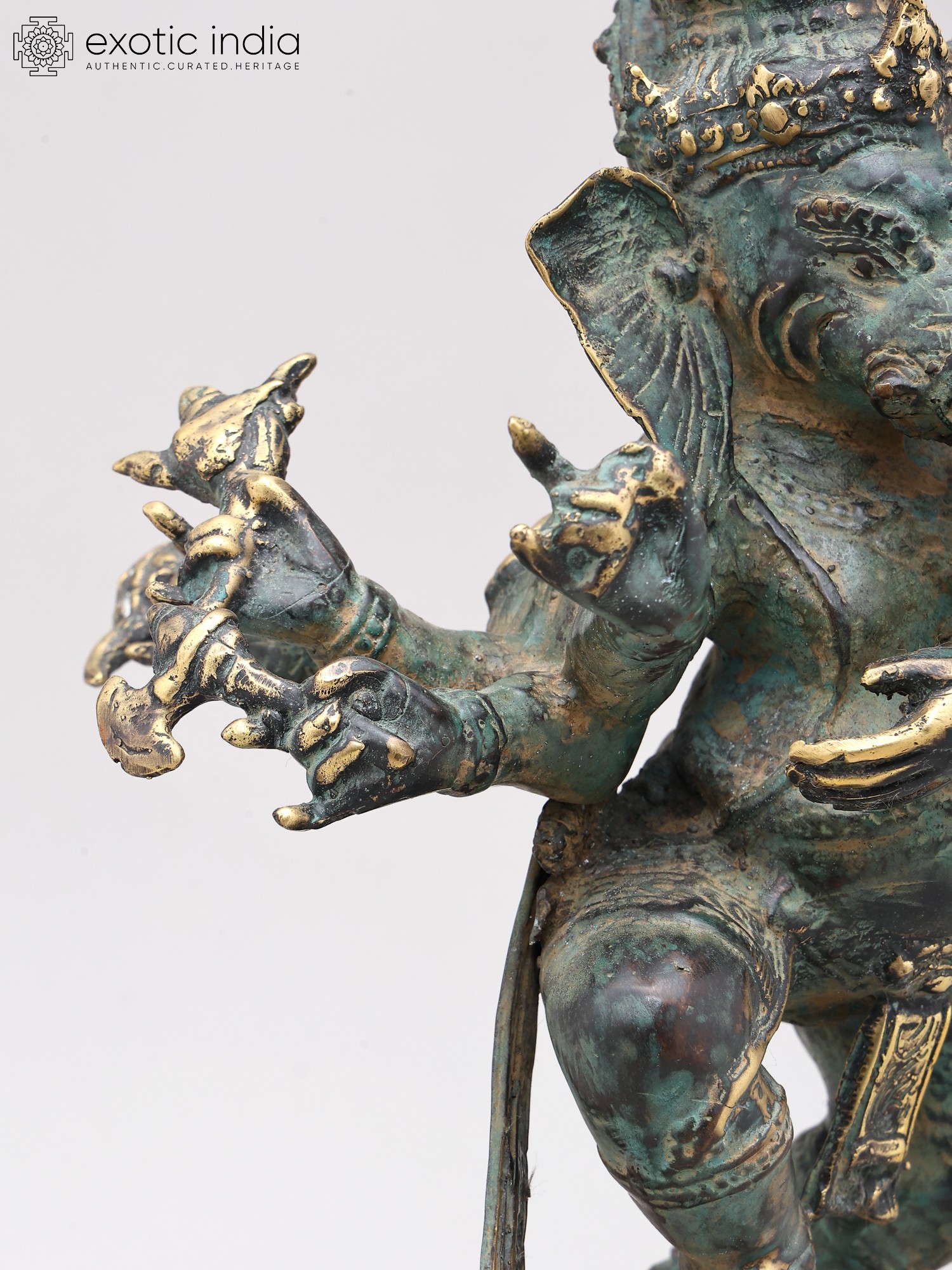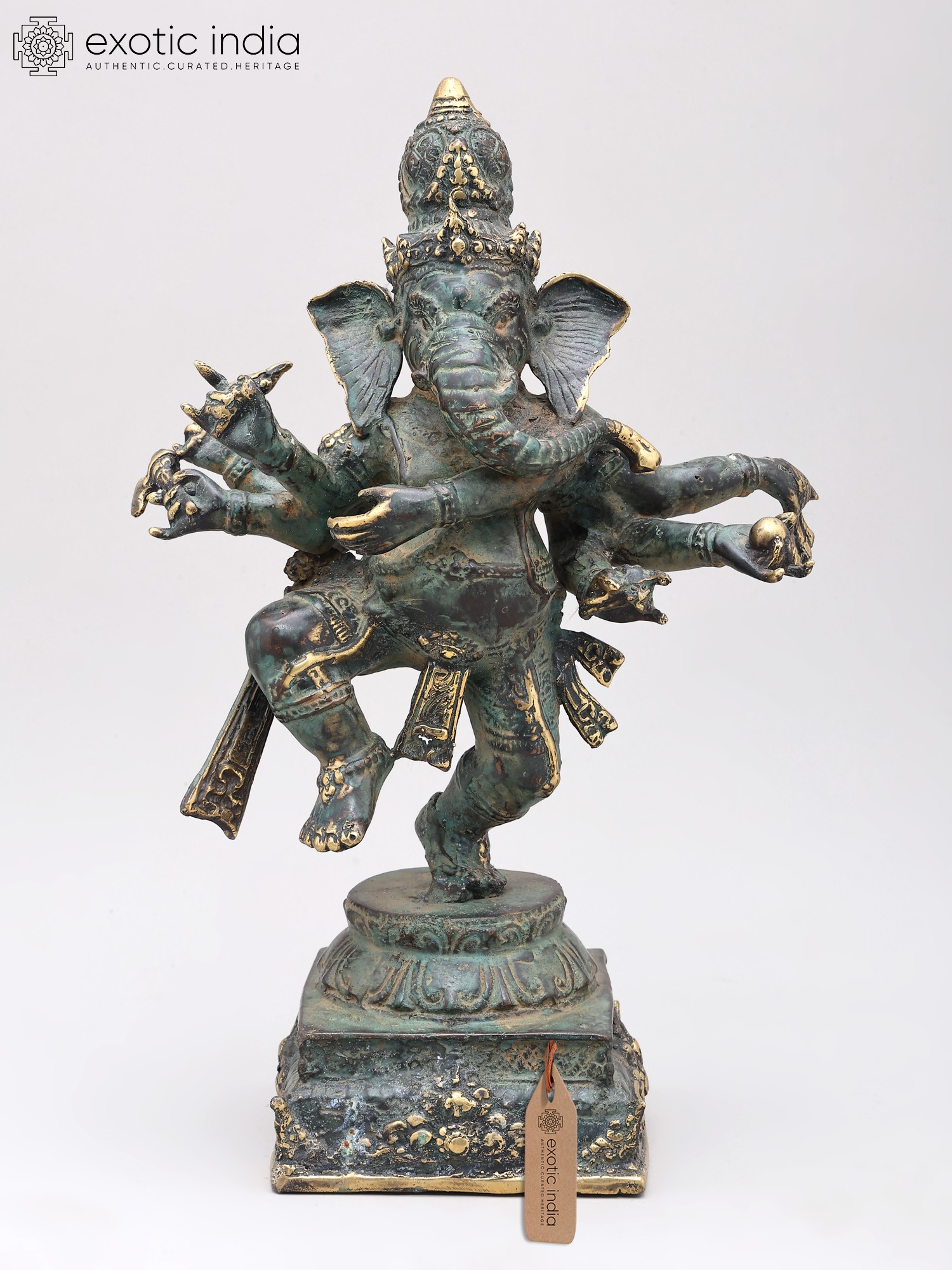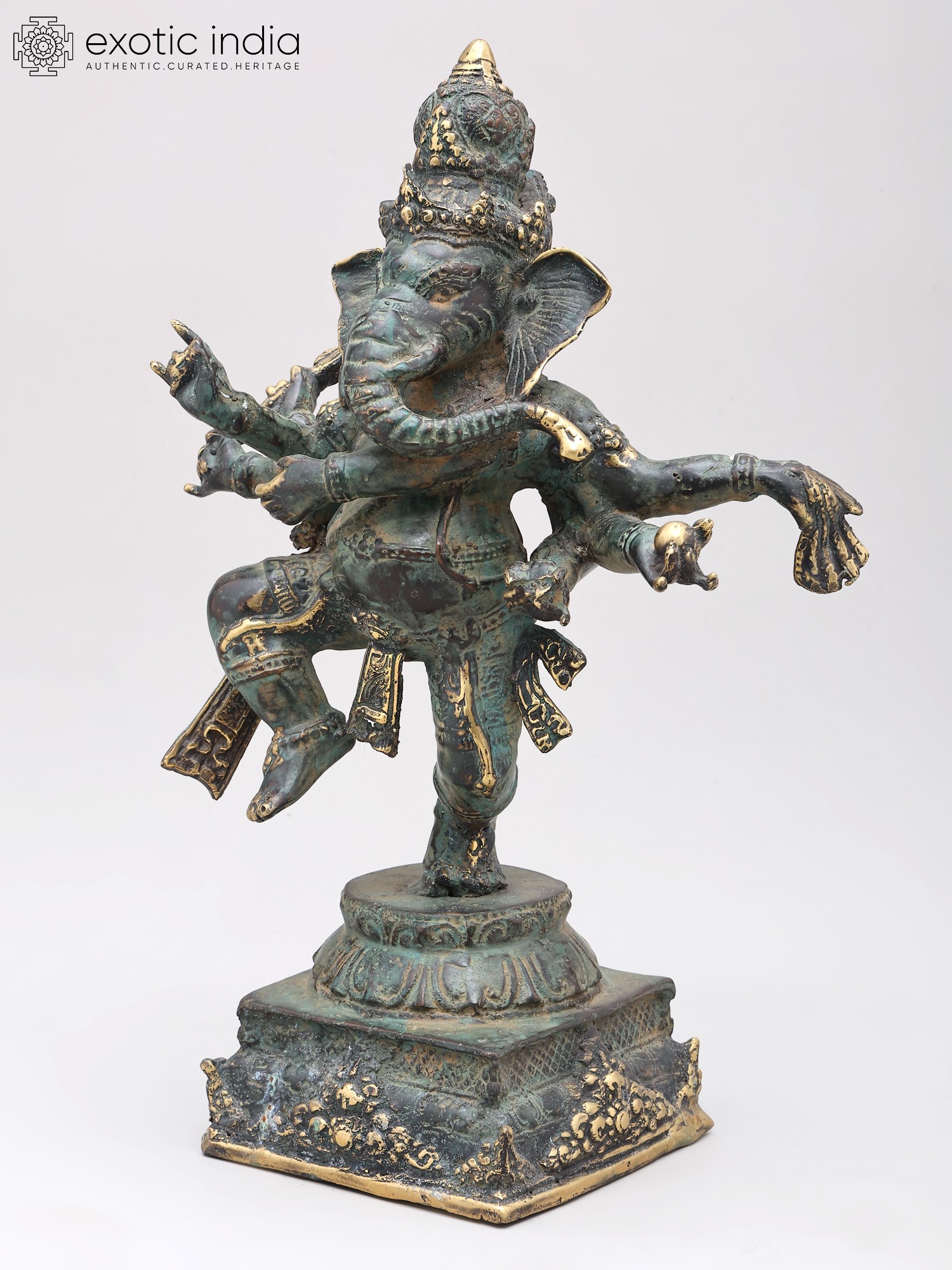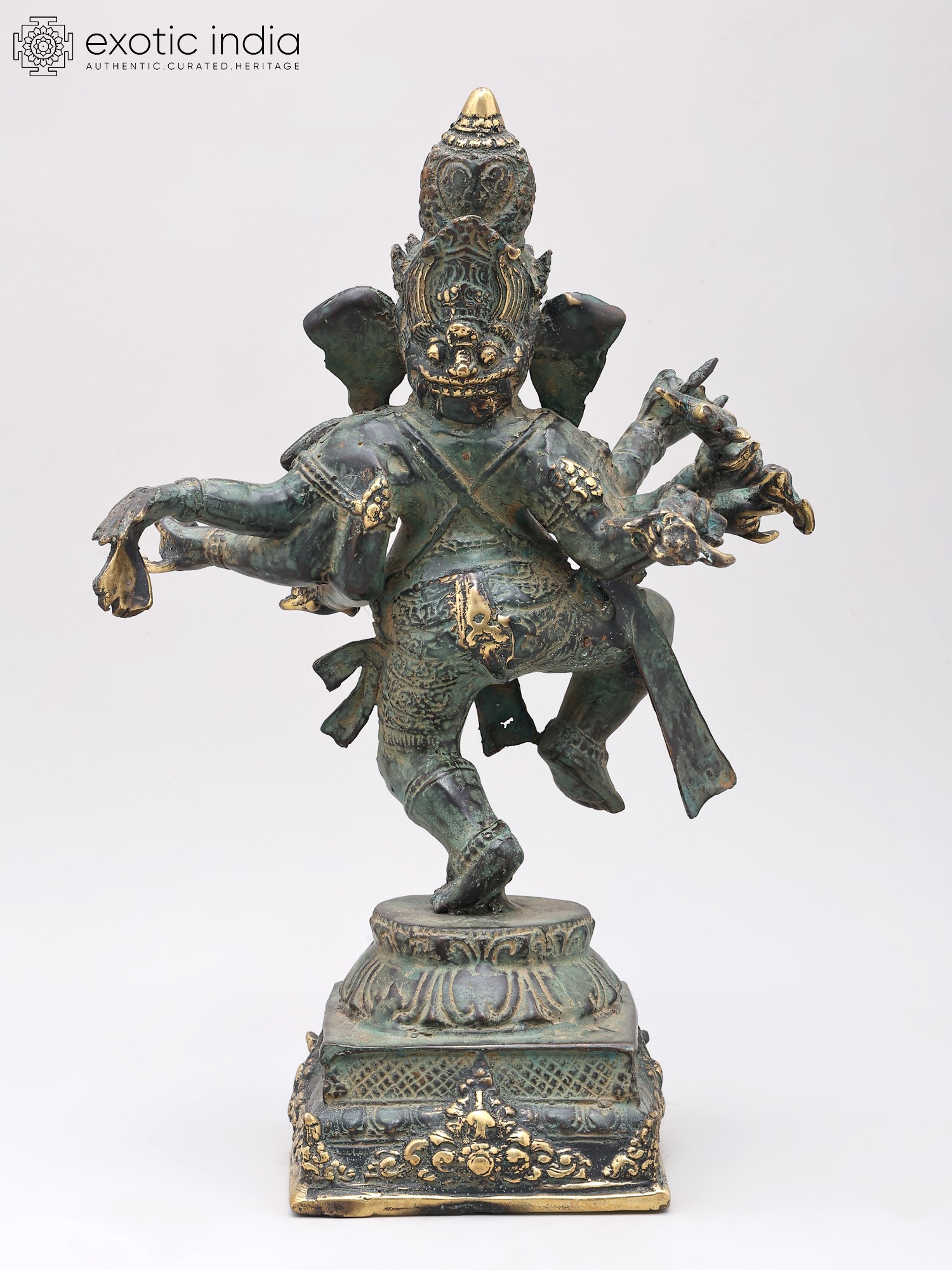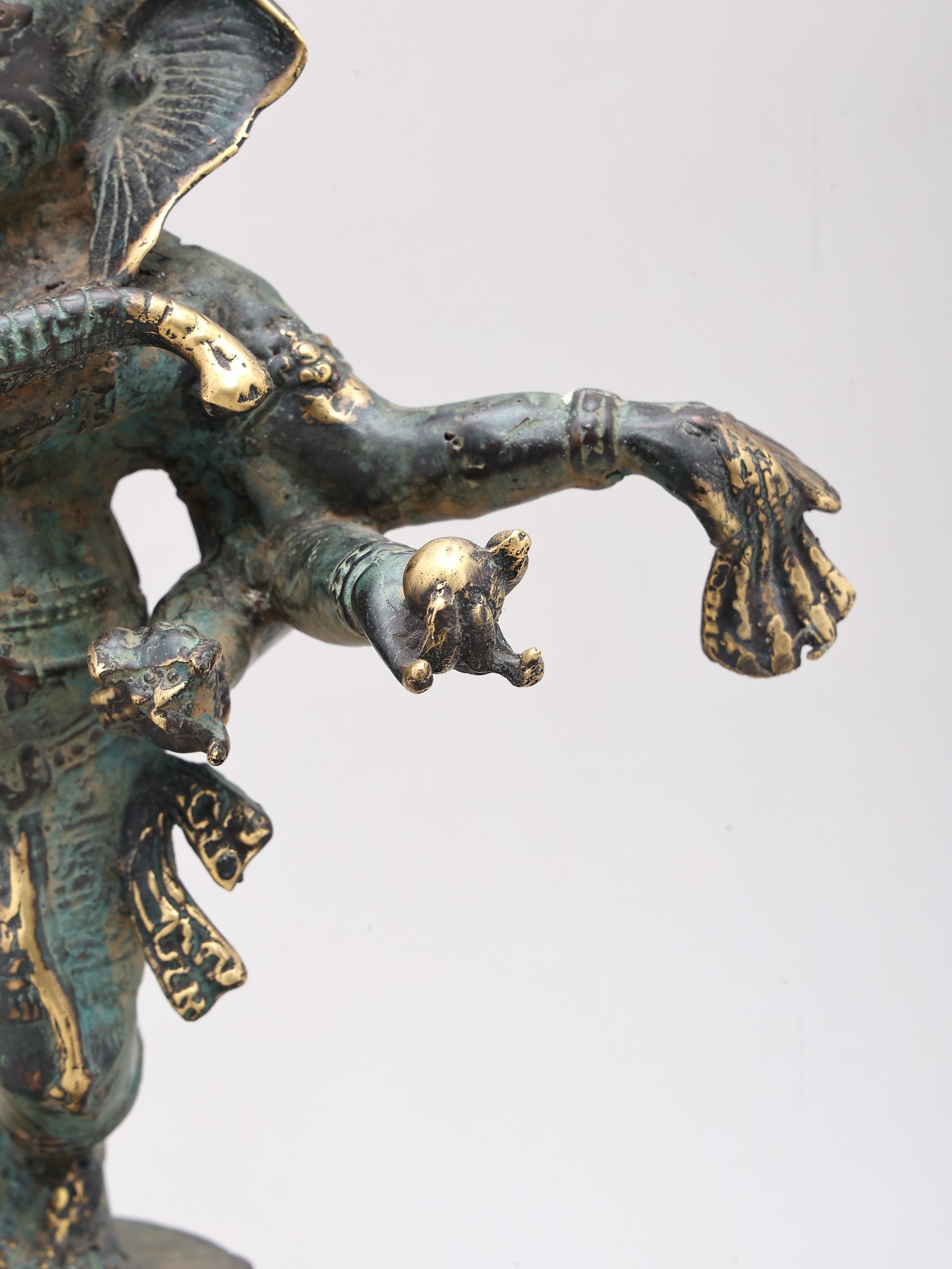 This magnificent brass statue captures the dynamic and joyous essence of Lord Ganesha, the beloved elephant-headed deity of Hinduism. Depicted in a vibrant dance pose, known as "Nritya Ganesha" or "Vighnaharta" (remover of obstacles), this artwork is a testament to the intricate artistry of brass casting. The lost-wax method, a traditional and time-honored technique, is employed to bring this divine form to life, ensuring every delicate detail is exquisitely rendered. The patina of age and the subtle glint of polished brass speak of a legacy passed down through generations, evoking a sense of timeless spirituality. ––––––––––