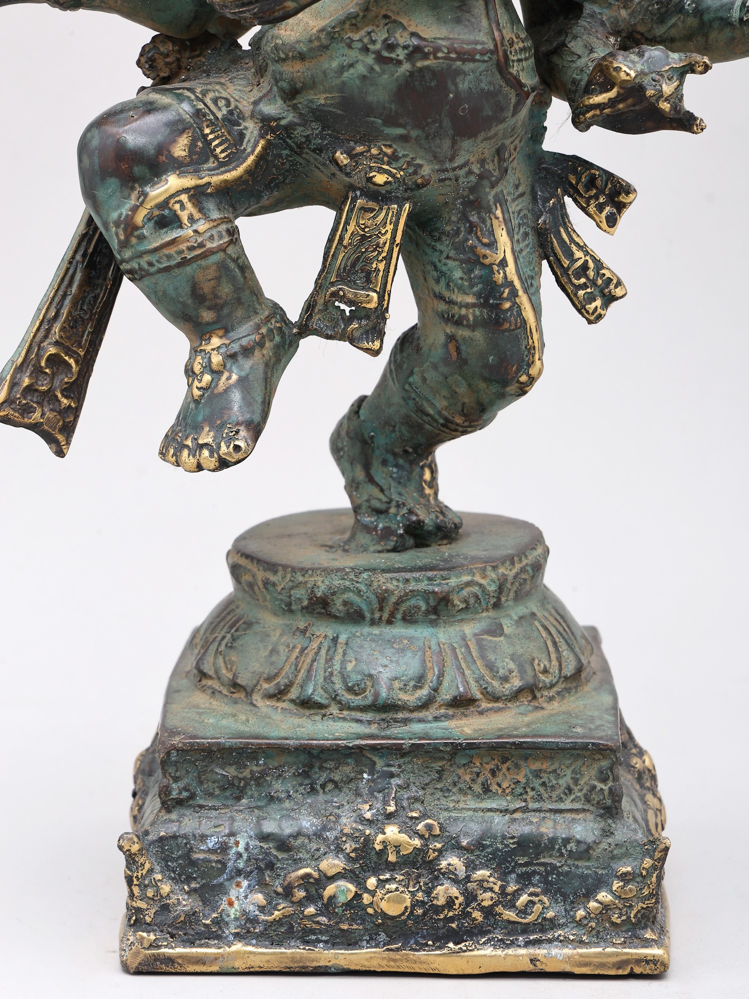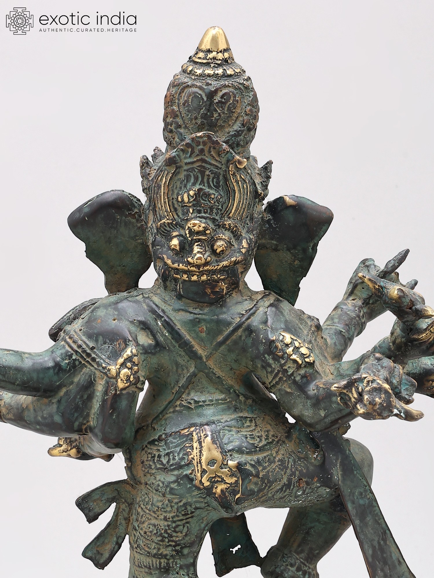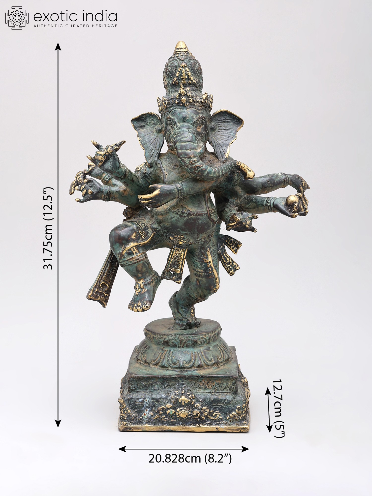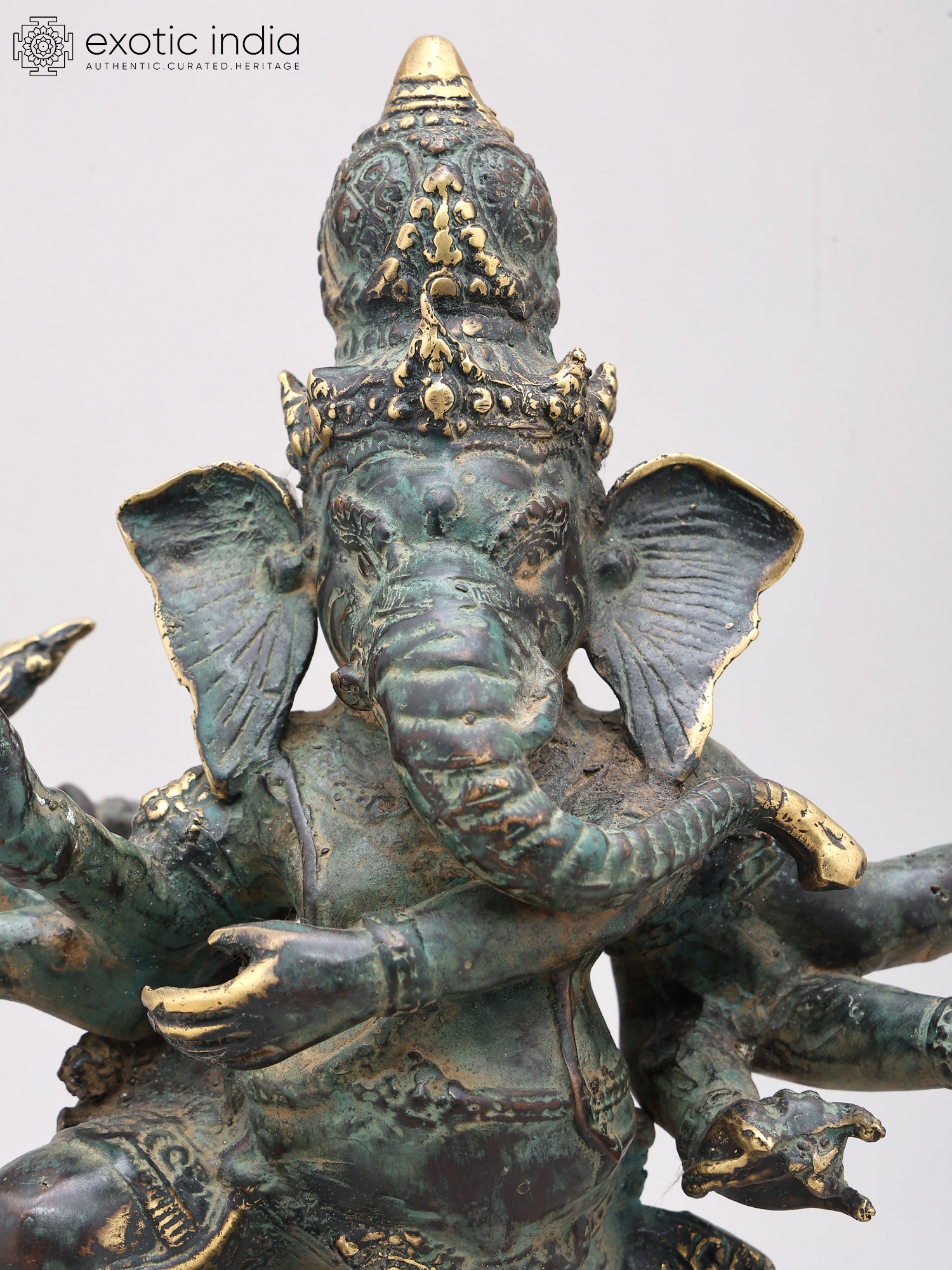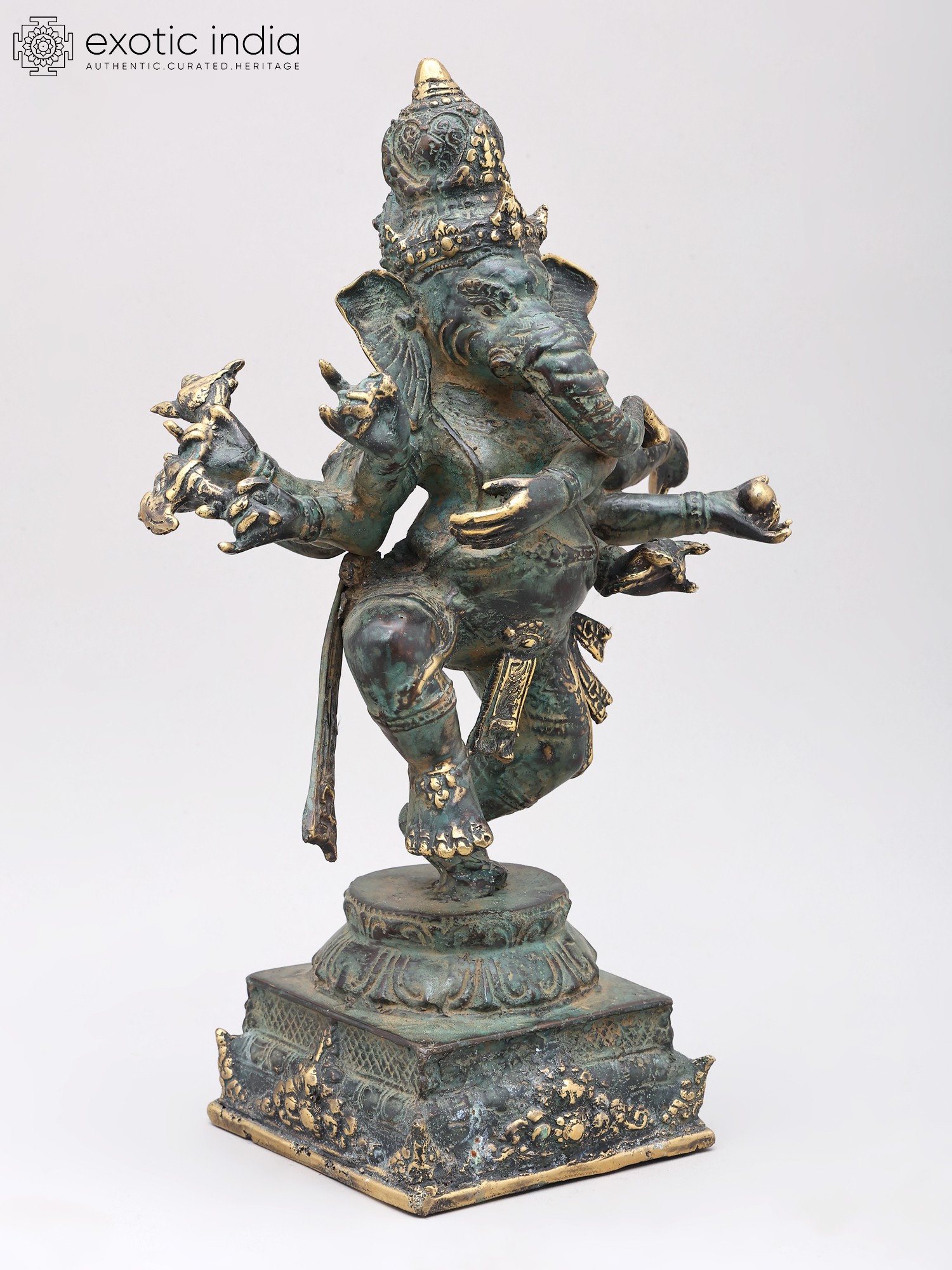 This magnificent brass statue captures the dynamic and joyous essence of Lord Ganesha, the beloved elephant-headed deity of Hinduism. Depicted in a vibrant dance pose, known as "Nritya Ganesha" or "Vighnaharta" (remover of obstacles), this artwork is a testament to the intricate artistry of brass casting. The lost-wax method, a traditional and time-honored technique, is employed to bring this divine form to life, ensuring every delicate detail is exquisitely rendered. The patina of age and the subtle glint of polished brass speak of a legacy passed down through generations, evoking a sense of timeless spirituality. ––––––––––