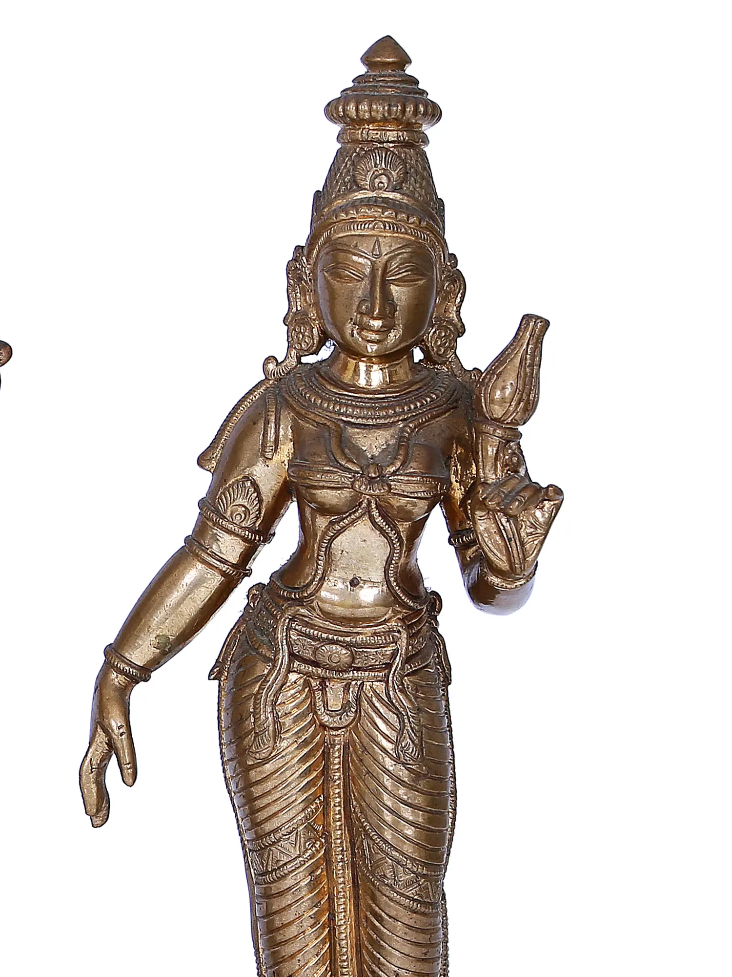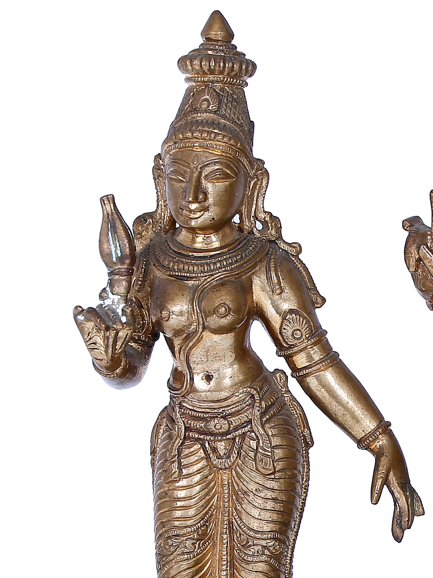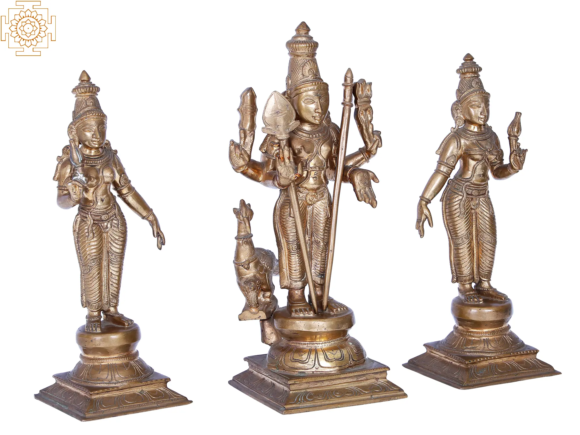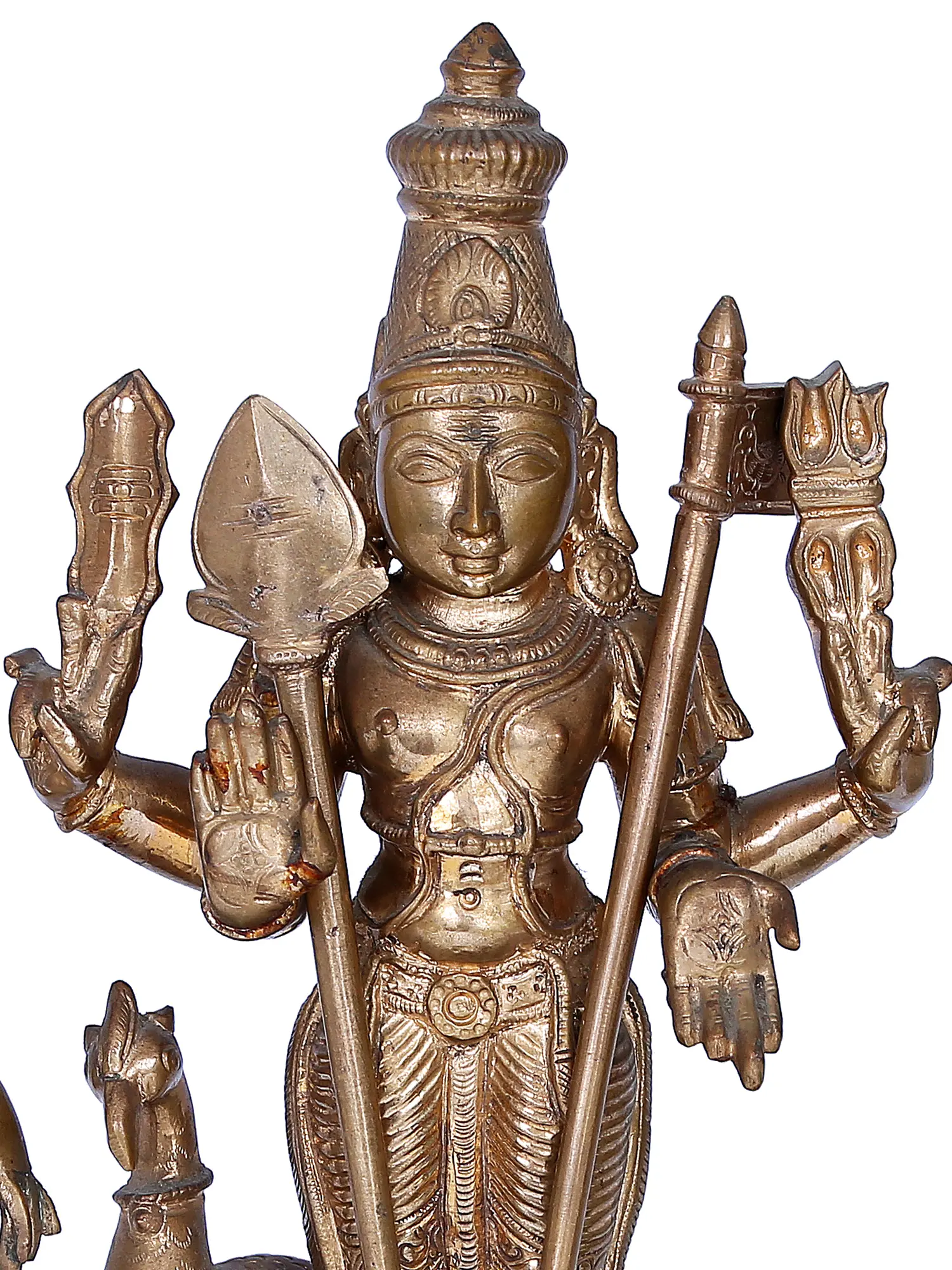 Enrich your sacred space with the divine presence of Lord Murugan, accompanied by his consorts Devasena and Valli, and the majestic peacock Mayura. Crafted through Madhuchista Vidhanam in Swamimalai's Panchaloha Bronze, this masterpiece beautifully portrays the Hindu philosophical concept of 'Divine Union.' The lost-wax technique intricately details the divine family, symbolising the harmonious unity and balance in cosmic relationships. Invite the benevolent energy of Lord Murugan into your surroundings, celebrating the divine union and the cosmic dance of love.