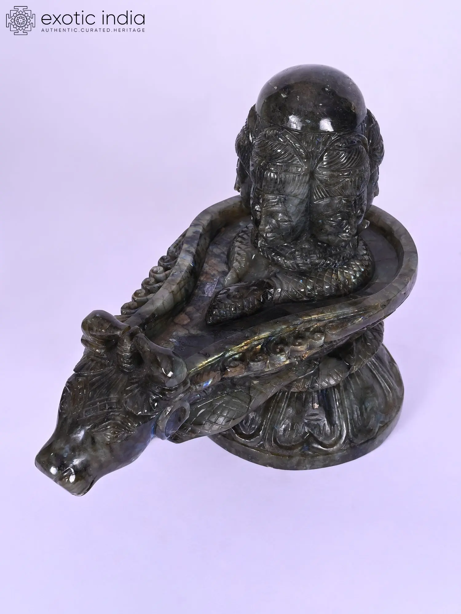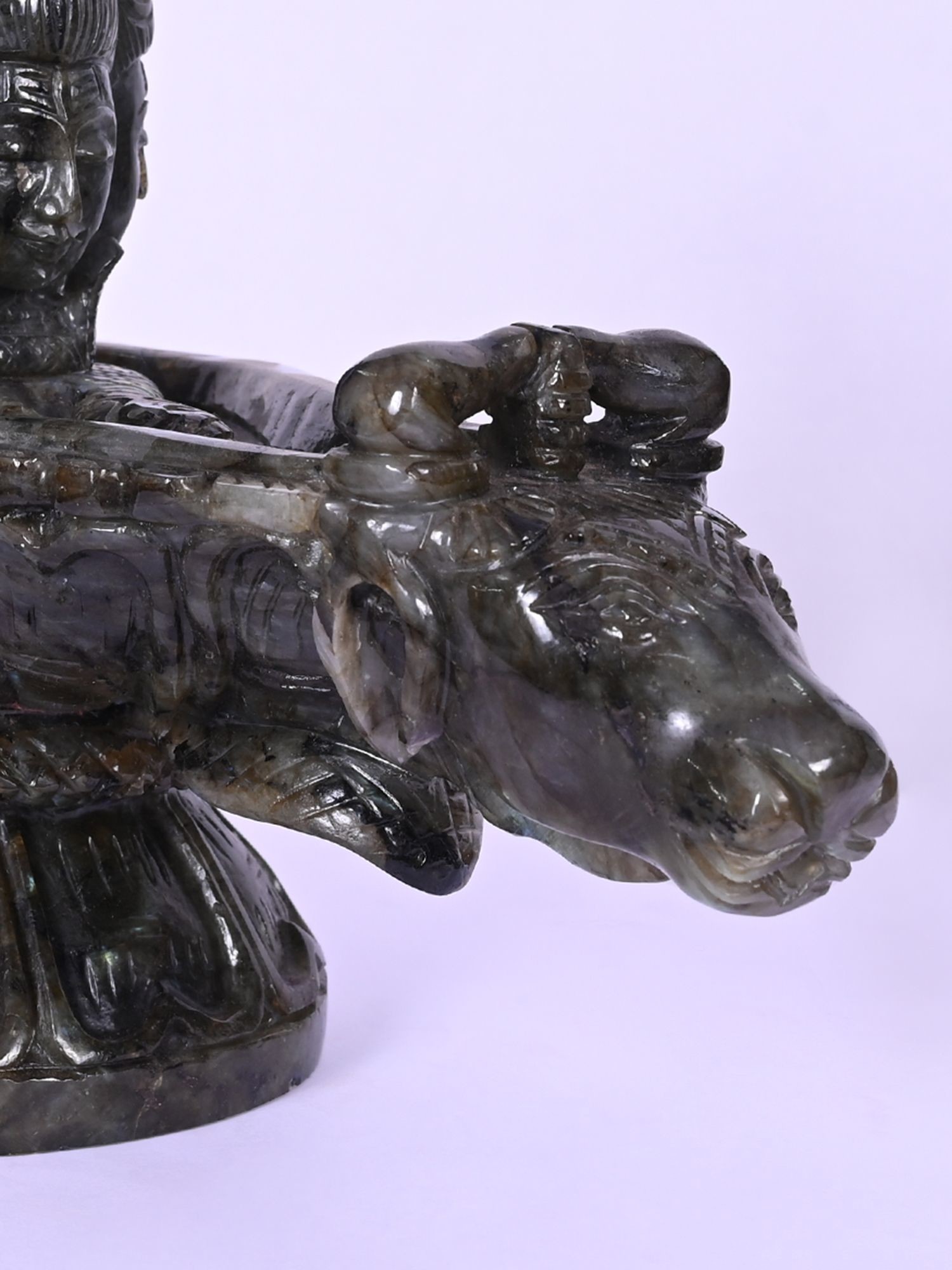 Observe the captivating interplay of light and shadow across its textured surfaces, revealing the depth and character of the natural material. The powerful form, standing at approximately twelve inches in height, is balanced by the delicate artistry, creating a visual masterpiece that commands attention. The presence of Nandi, the divine bull, adds a dynamic element, symbolizing unwavering loyalty and devotion.