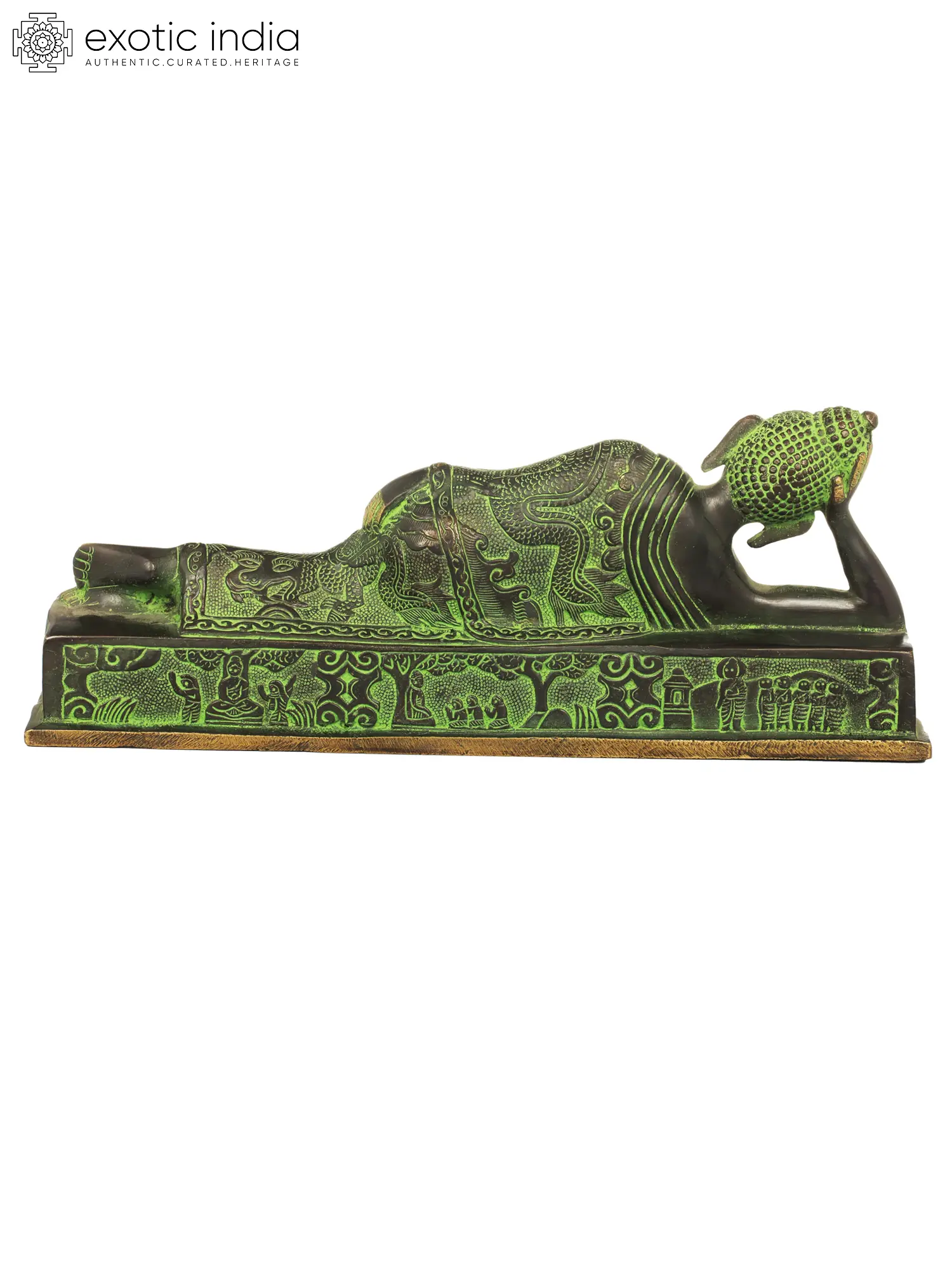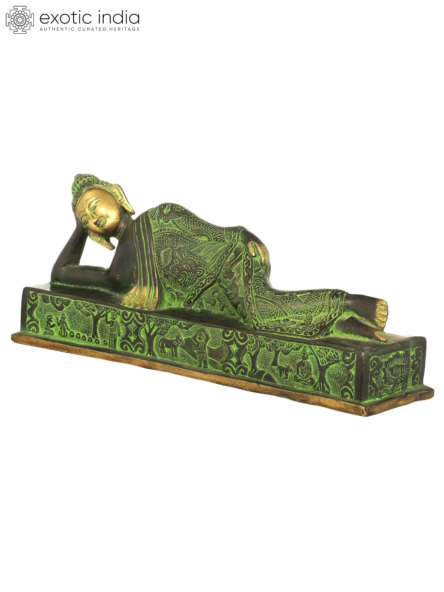 In Buddhism, the Parinirvana Buddha signifies the ultimate state of enlightenment and liberation in Buddhism. Also known as the “Final Nirvana”, it represents the moment when the Buddha attained complete freedom from the cycle of birth and death. Depicted lying on his right side, Lord Buddha’s eyes are closed, exuding an aura of peace and serenity, attaining ultimate peace. Painstakingly crafted in brass, this masterpiece invites you to reflect on the impermanence of existence and encourages you to diligently pursue the path of spiritual awakening, seeking liberation from suffering and attaining eternal bliss. Embrace the eternal wisdom of the Buddha’s teachings and infuse your surroundings with an aura of peace and enlightenment.