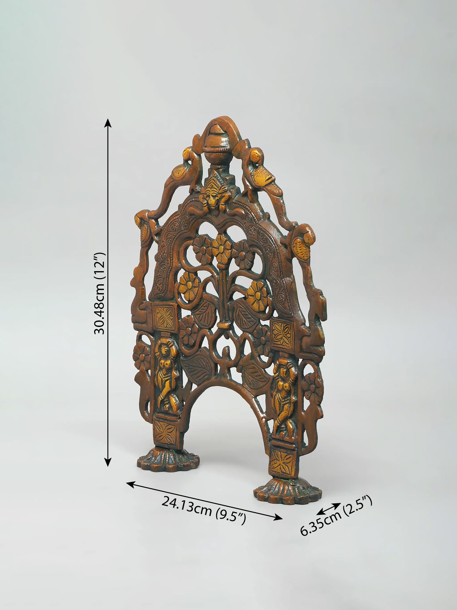 Enrich your sacred space with this intricately crafted temple arch, a Prabhavali, designed to frame and enhance your deities. This piece is more than just decoration; it is a symbolic gateway, inviting you into the realm of the divine. The warm, inviting tones of the brass create a tranquil and reverent ambiance, perfect for focused meditation and heartfelt worship. The Prabhavali serves as a backdrop that magnifies the presence of the idol it frames, creating a focal point for devotion. Its curves and openwork design not only add to its aesthetic appeal but also allow light to filter through, casting gentle shadows that animate the sacred space. The piece is a testament to traditional artistry, blending form and function to create a truly meaningful addition to your ritual practice.