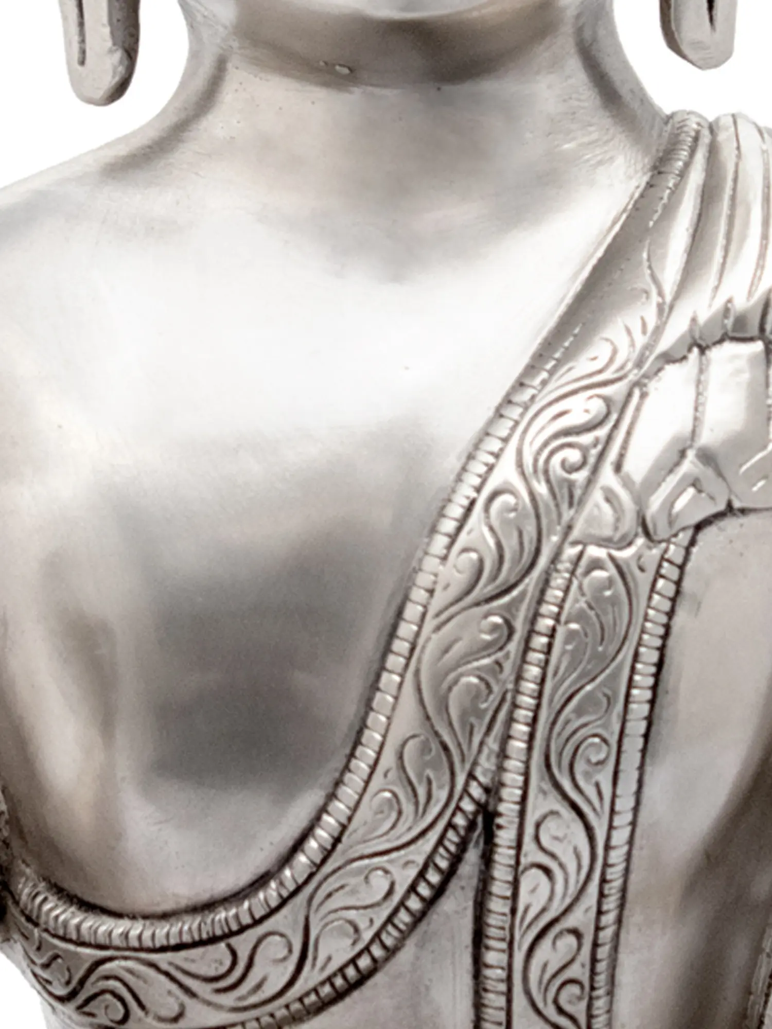 Meticulously handcrafted in India, this statue is a testament to the enduring artistry and spiritual devotion passed down through generations. The use of brass, a metal revered in many cultures for its purity and auspicious qualities, lends a timeless and substantial feel to the piece. The intricate detailing, from the delicate curls of the Ushnisha (the cranial protuberance symbolizing wisdom) to the subtle folds of the monastic robe, showcases the skill of the artisans. The smooth, lustrous finish of the brass enhances the divine aura of the figure, making it a captivating centerpiece for any sacred space or a cherished addition to a collector's ensemble.