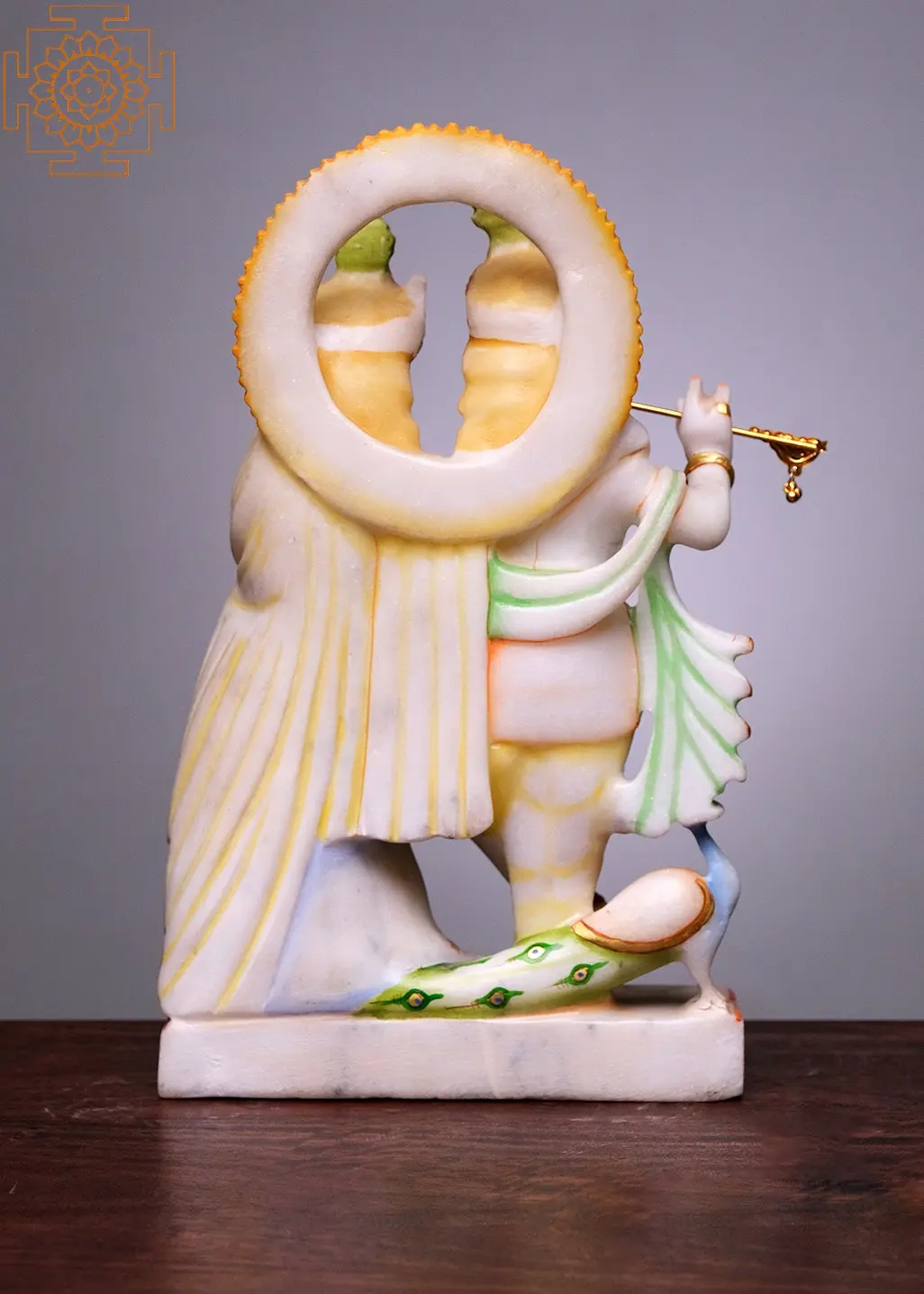 Step into a realm of divine love and eternal devotion with this exquisite marble statue, capturing the celestial dance of Lord Krishna and Goddess Radha. Crafted from pure white marble, this handcrafted masterpiece embodies the spiritual essence of one of Hinduism's most cherished divine couples. The pristine marble, known for its purity and luminosity, serves as the perfect medium to portray the divine radiance of Radha and Krishna. The intricate detailing and delicate artistry transform the static form into a vibrant narrative of love, music, and grace.