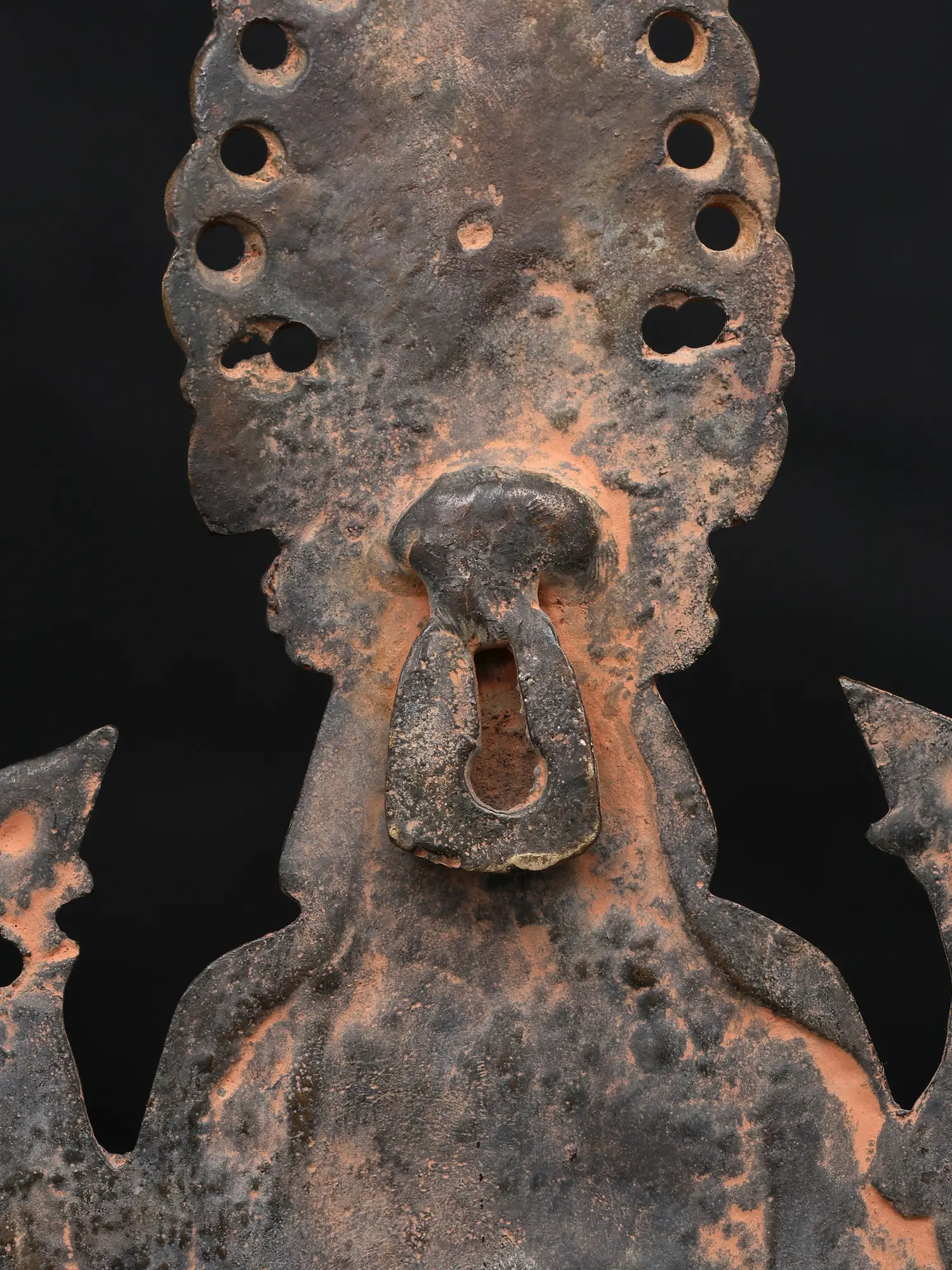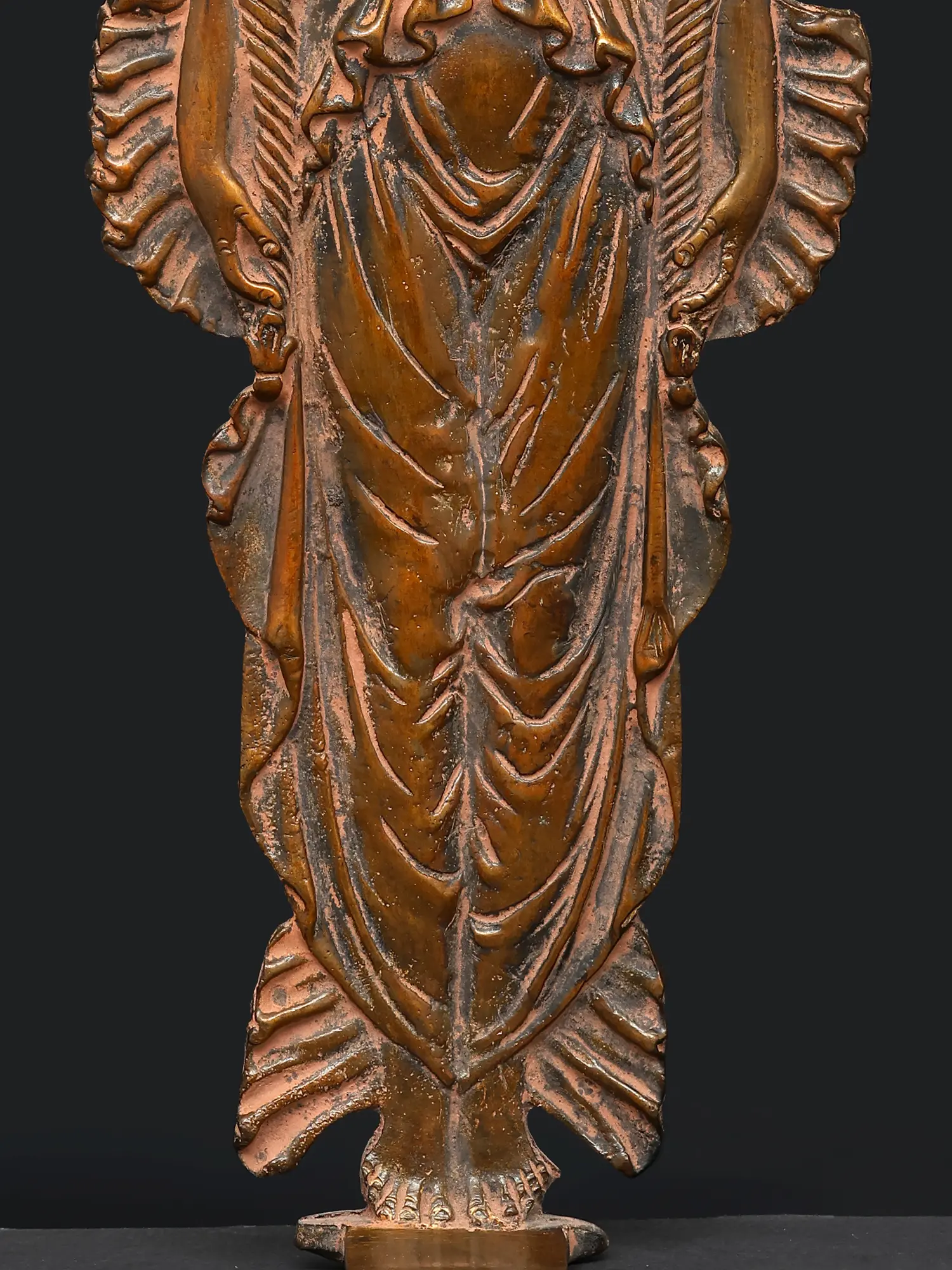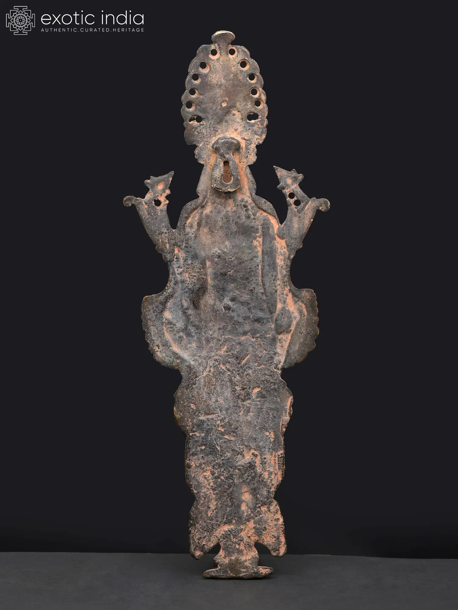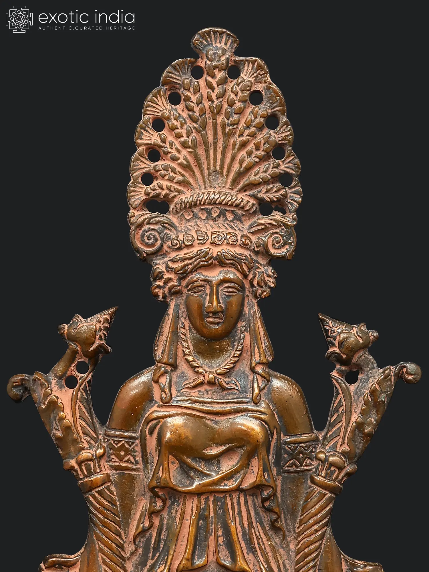 This brass wall hanging depicting the Roman Goddess of Fertility Ceres emits a sense of divine benediction. The Goddess of agriculture, motherly relationships, and crops is depicted here standing straight on a pedestal with both hands holding spears of maize head. The Goddess is elegantly adorned with a crown made of cereal crops. Her slim physique is elegantly embellished with jewellery and flowy clothes that give the appearance of wings on both sides of her body. This wall hanging is without a doubt the most graceful representation of Ceres and needs to be cherished and displayed in a venue befitting of her beauty.