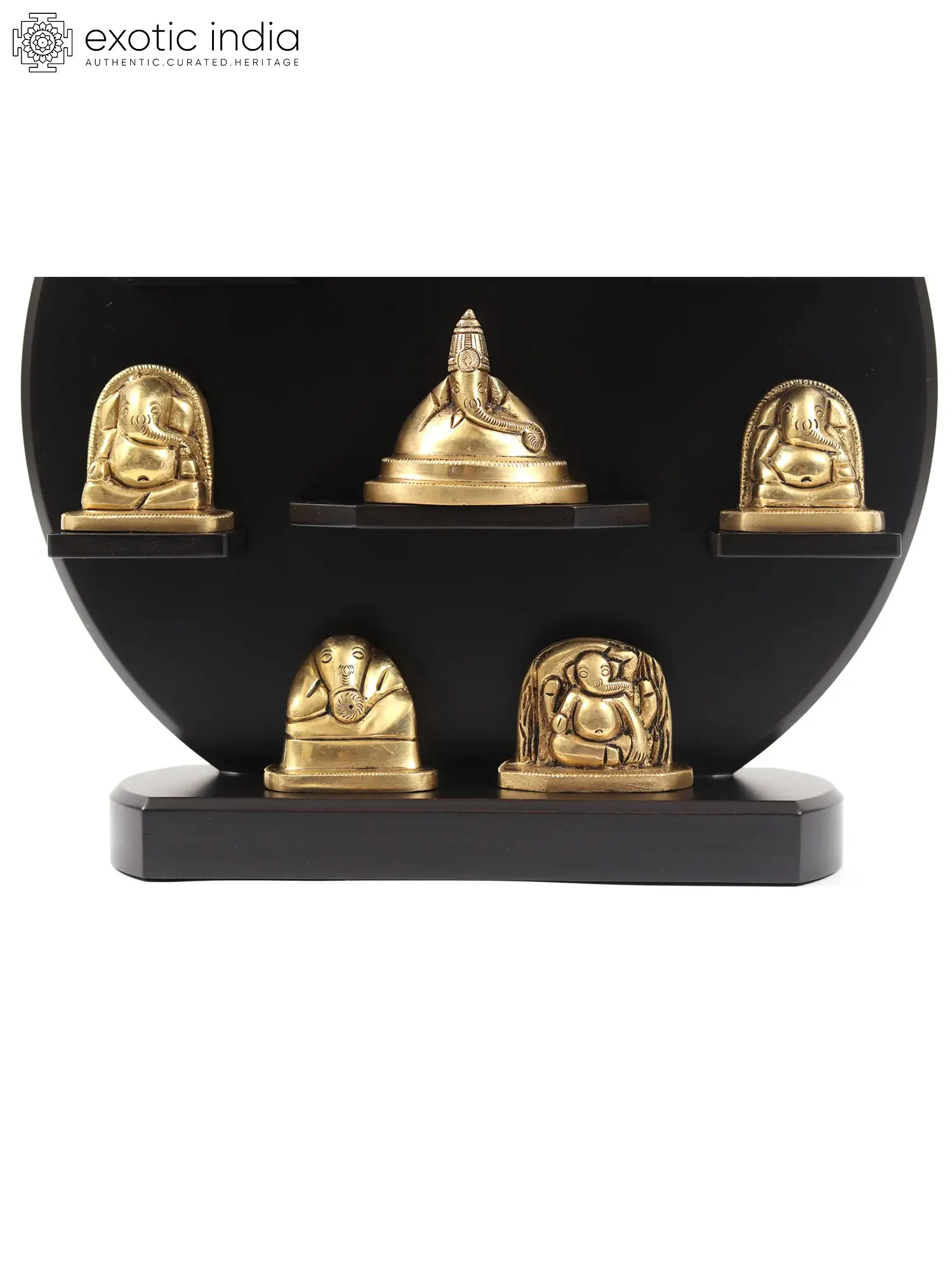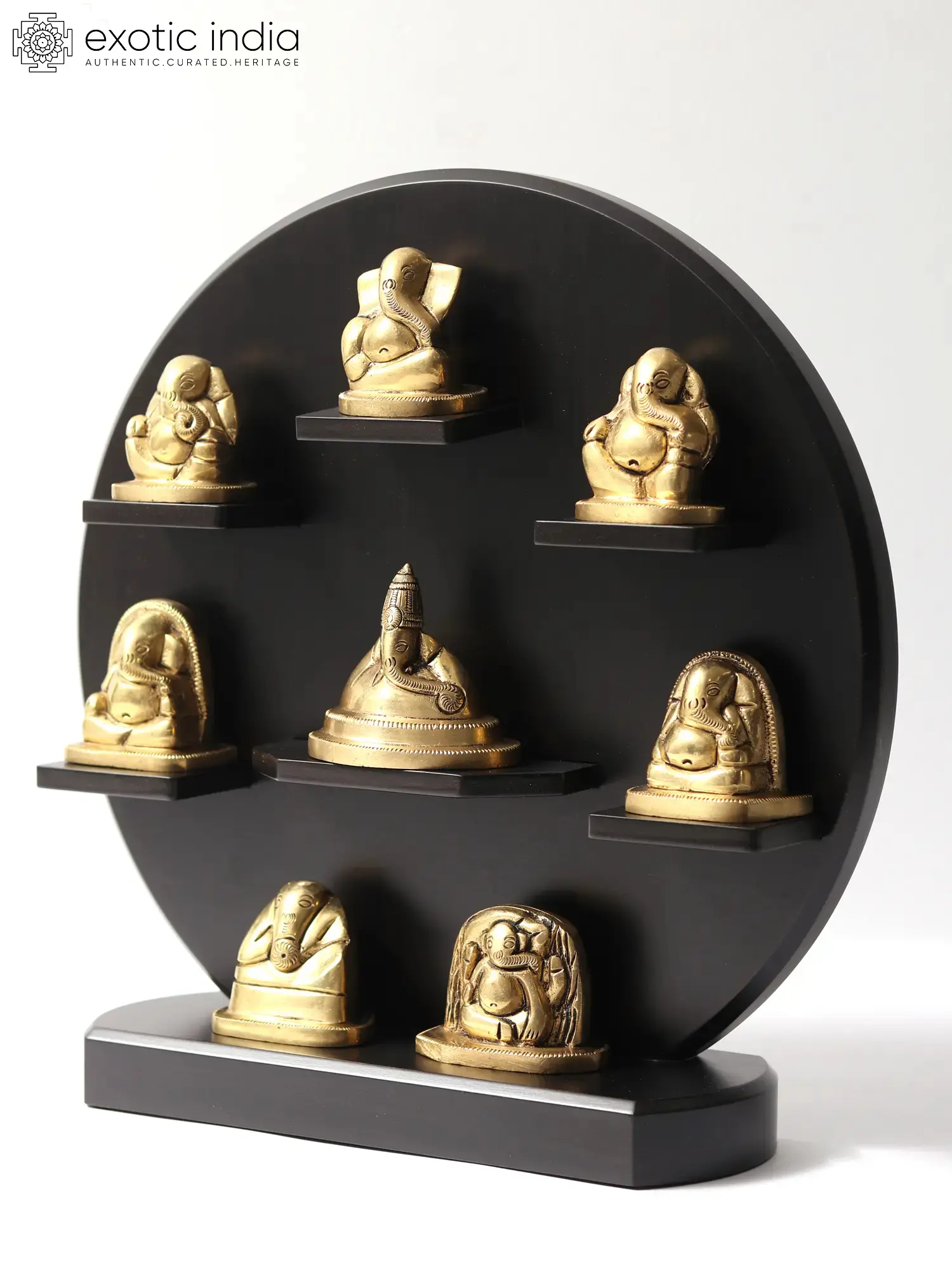 The idols are thoughtfully arranged on a circular, deep black wooden frame, providing a dramatic and elegant backdrop that highlights the golden sheen of the brass. This circular design itself is symbolic, often representing wholeness, eternity, and the cyclical nature of existence. The arrangement creates a focal point, drawing the eye and inviting contemplation of the divine. Each idol rests on its own small, tiered shelf, giving each form its individual space and prominence within the harmonious composition. This thoughtful presentation makes it ideal for adorning any wall, whether in a meditation room, living space, or entryway, infusing the environment with a sense of peace and spiritual grace. According to legend, the Ashtavinayak temples are important pilgrimage sites, and undertaking a pilgrimage to all eight is believed to grant immense spiritual merit. This collection allows you to bring the essence of this sacred journey into your home, offering a constant reminder of Ganesha's protective and guiding presence. As the son of Lord Shiva and Goddess Parvati, Ganesha is revered as the patron of arts and sciences, and the deva of intellect and wisdom. Invoking his blessings is believed to usher in success, prosperity, and the removal of all impediments on one's path. This set is more than just a decorative piece; it is a sacred artifact, a conduit for divine energy, and a beautiful expression of devotion.