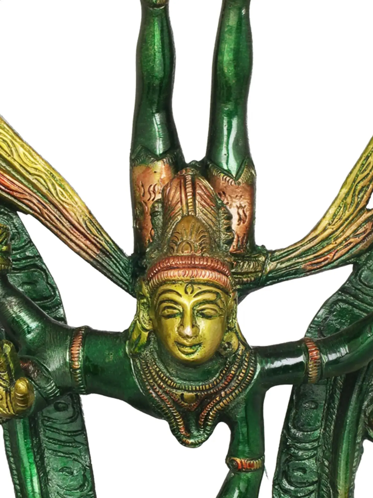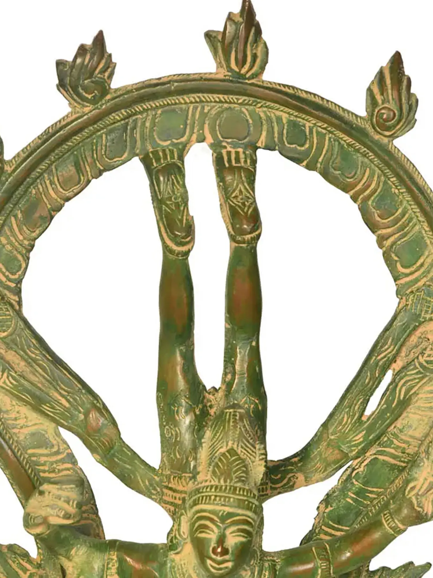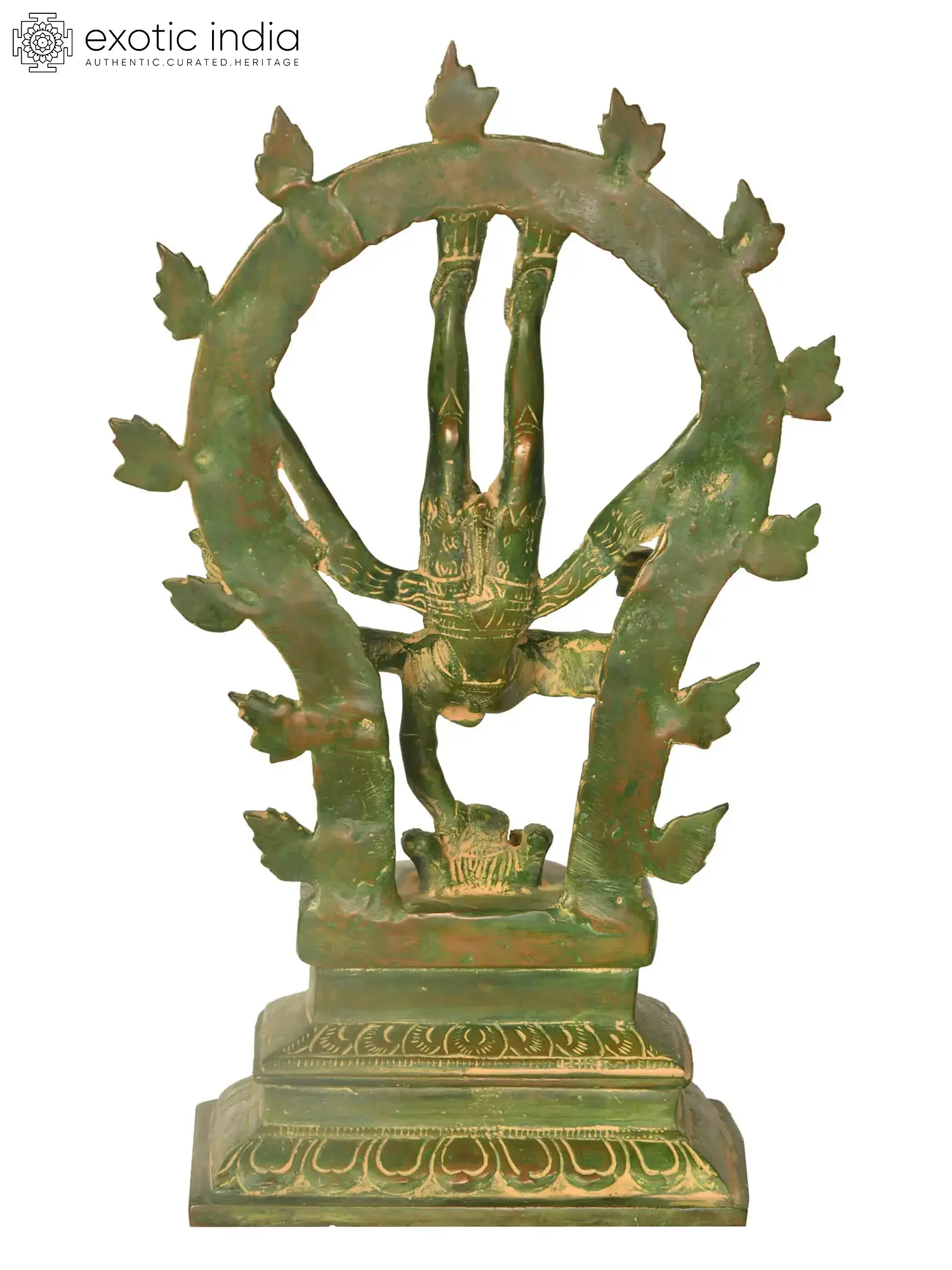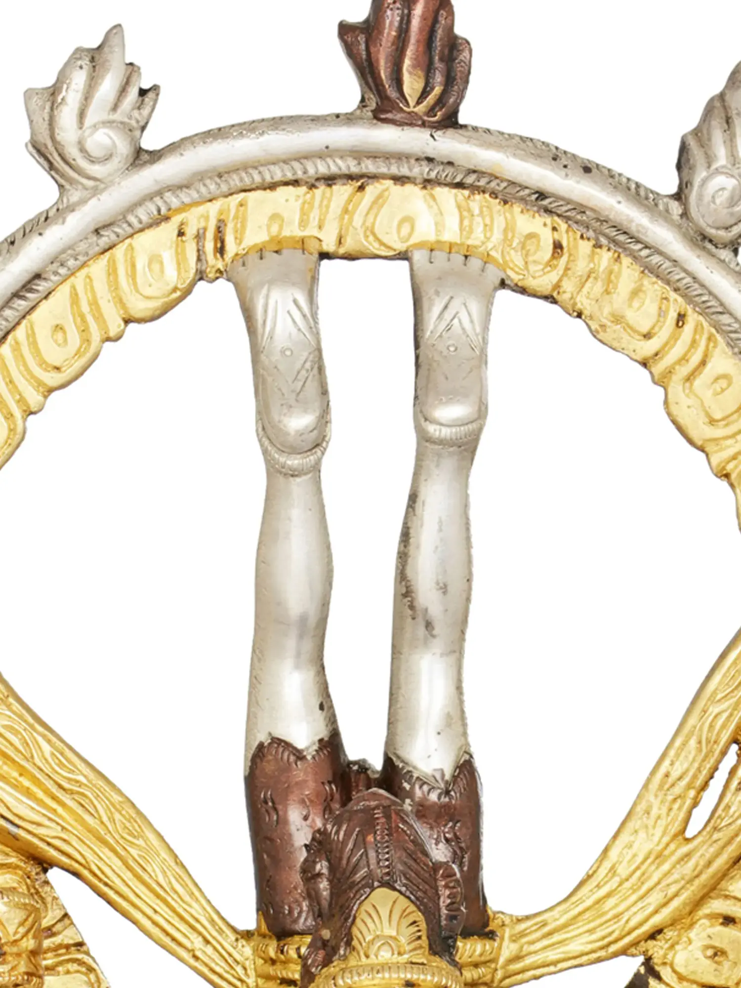 This Brass Statue manifests Lord Shiva’s descending from the heavens, guiding the heavenly river Ganga safely to Earth. In one hand, he cradles Agni, the fire god, and in the other, a damru or a drum. Shiva's right hand extends in the abhaya-mudra, the reassuring "fear not" gesture. His left hand firmly subdues the dwarf of Ignorance, Apasmara. An awe-inspiring prahabhamandala, a fiery arch, envelops Shiva as he gracefully fulfills his cosmic role.