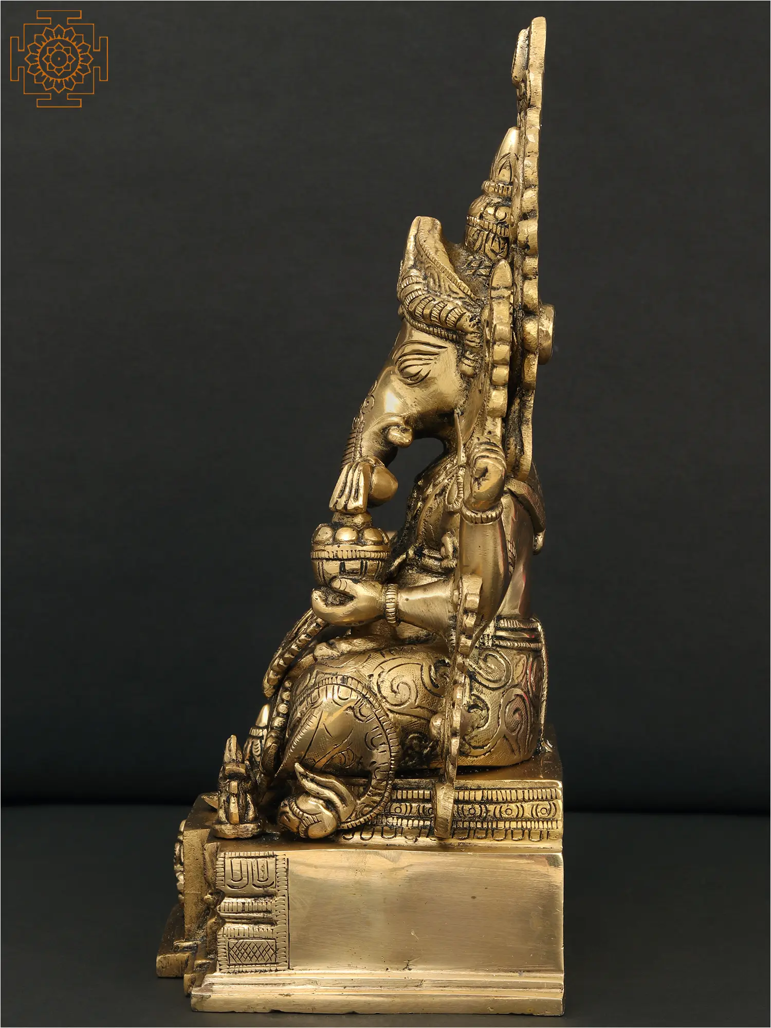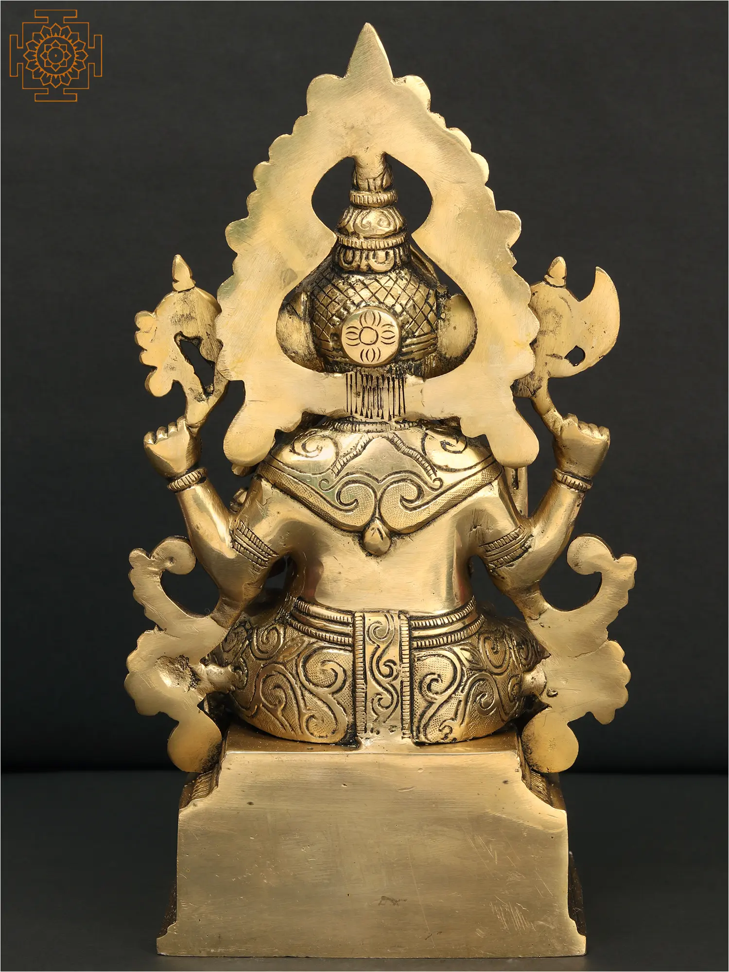 The brass sculpture of Lord Ganesha in a seated posture reveals his diverse symbolism. His elephant head signifies wisdom and the ability to overcome challenges. The single tusk is a reminder to retain the good and discard the bad. Ganesha's sitting posture represents meditation, while his multiple hands hold symbolic objects. The modak, a sweet, symbolizes rewards. The axe cuts through delusions, and the lotus signifies purity. Ganesha embodies the wisdom to conquer hurdles and the grace to nurture life's virtues. This sculpture becomes a personal guide in navigating life's twists, embodying wisdom and kindness.
