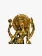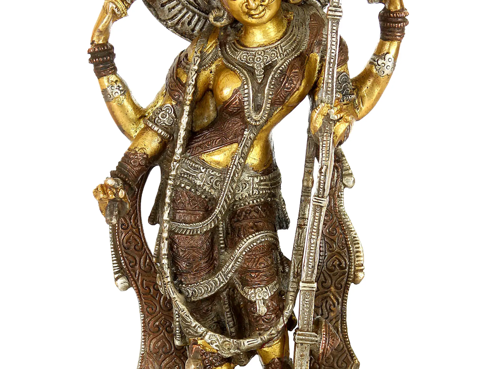 Elegantly poised in the graceful tribhanga position, this exquisite sculpture of Goddess Saraswati captures her divine presence. With four arms, each symbolically mirroring her husband Brahma's four heads, she embodies the facets of manas (mind, sense), buddhi (intellect, reasoning), citta (imagination, creativity), and ahamkara (self-consciousness, ego). Saraswati, the epitome of action and reality, complements Brahma's abstract nature.