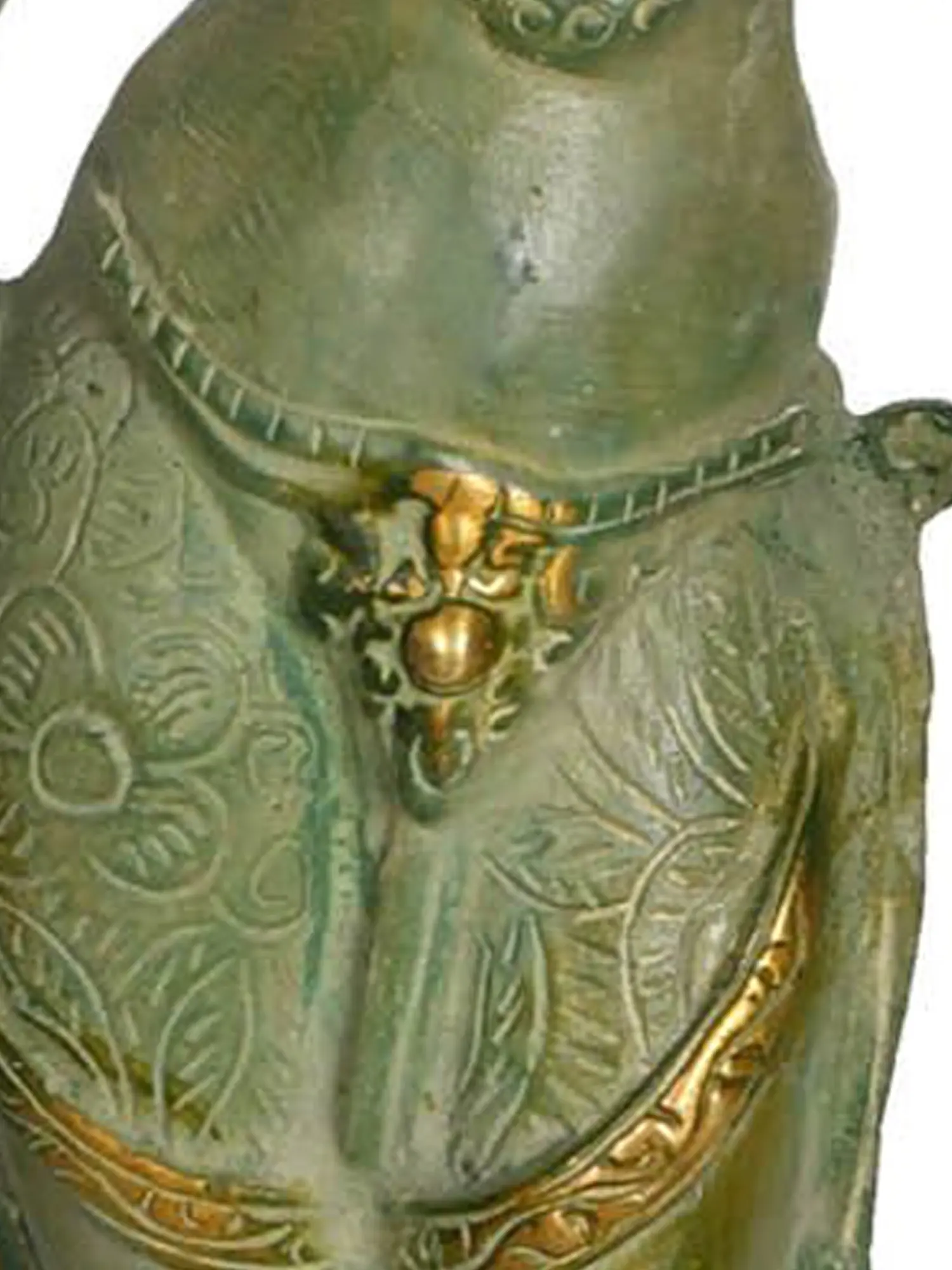 This exquisite brass sculpture depicts the revered Tibetan Buddhist deity, Tara, specifically her Green Tara manifestation. Standing at a commanding twelve inches, this handmade masterpiece, crafted in India, radiates an aura of serene grace and active compassion. The patina-kissed brass, with its subtle green hue highlighted by gleaming golden accents, evokes the ancient wisdom and enduring presence of this beloved goddess. The Green Tara is one of the most prominent and beloved figures in Tibetan Buddhism, often considered a female bodhisattva who has achieved complete enlightenment and chooses to be reborn in a female form to help all sentient beings. Her name, Tara, is derived from a Sanskrit root meaning "to cross over," signifying her role in guiding beings across the ocean of suffering and rebirth to liberation. She is known as the "Mother of Liberation," the "Swift One," and the "Goddess of Compassionate Action." Legends tell that Tara sprang from a teardrop of compassion shed by Avalokiteshvara, the Bodhisattva of Compassion, as he wept for the suffering of the world. Her swiftness in answering prayers and rushing to the aid of devotees is legendary, embodying the active and dynamic aspect of compassion.